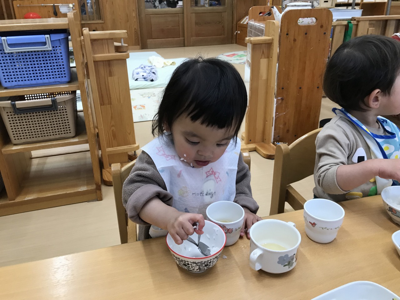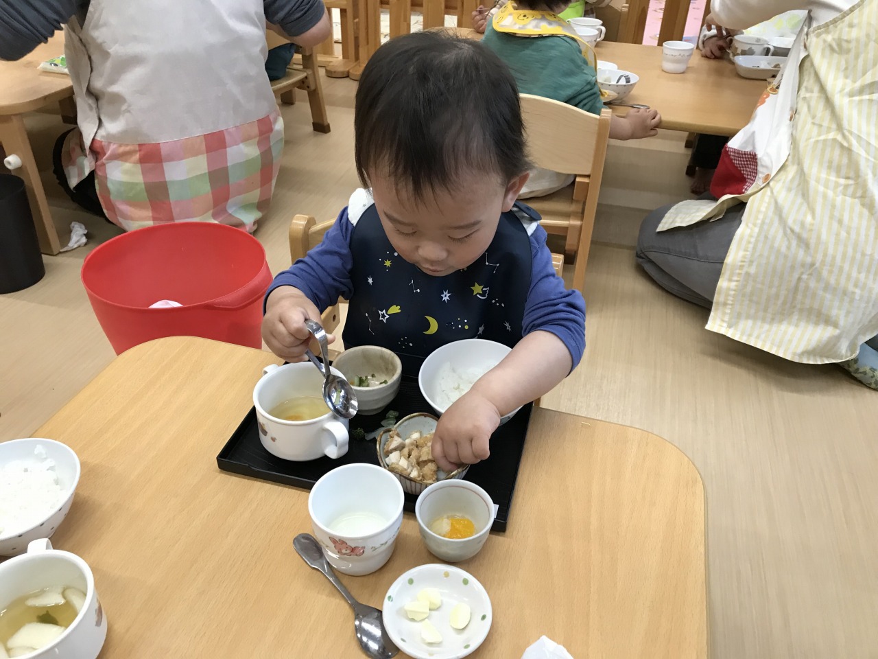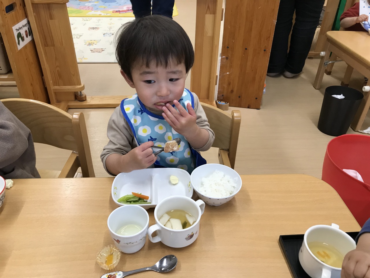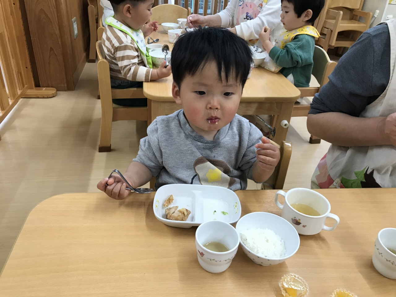沢山身体を動かして遊んだあとは、みんなの大好きなお昼ご飯の時間です!手づかみ食べや曲がりスプーンなどそれぞれの発達段階で食事の時間を楽しんでいた子ども達です。保育士等も「モグモグ、ごっくんしようね」「スプーンで食べるのが上手だね」「シャキシャキ、いい音がするね」などと沢山声掛けをして安心して食事を楽しめるようにしています。咀嚼の様子を見て食材の形状を大きくしたり、曲がりスプーンでの食事の様子を見て普通のスプーンで食べることに慣れるようにしたりしていきたいと思います。