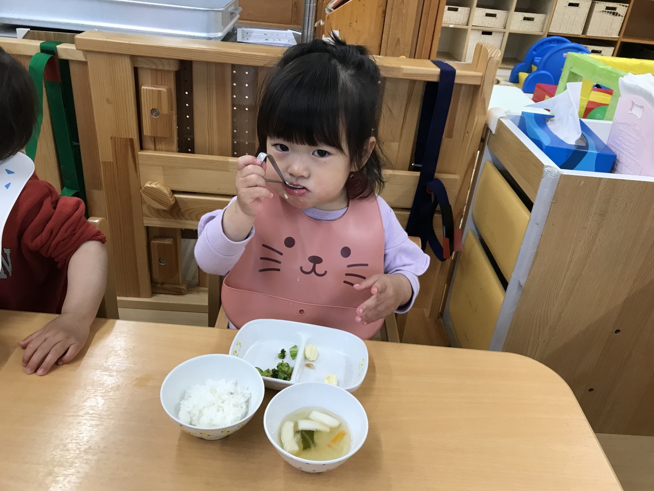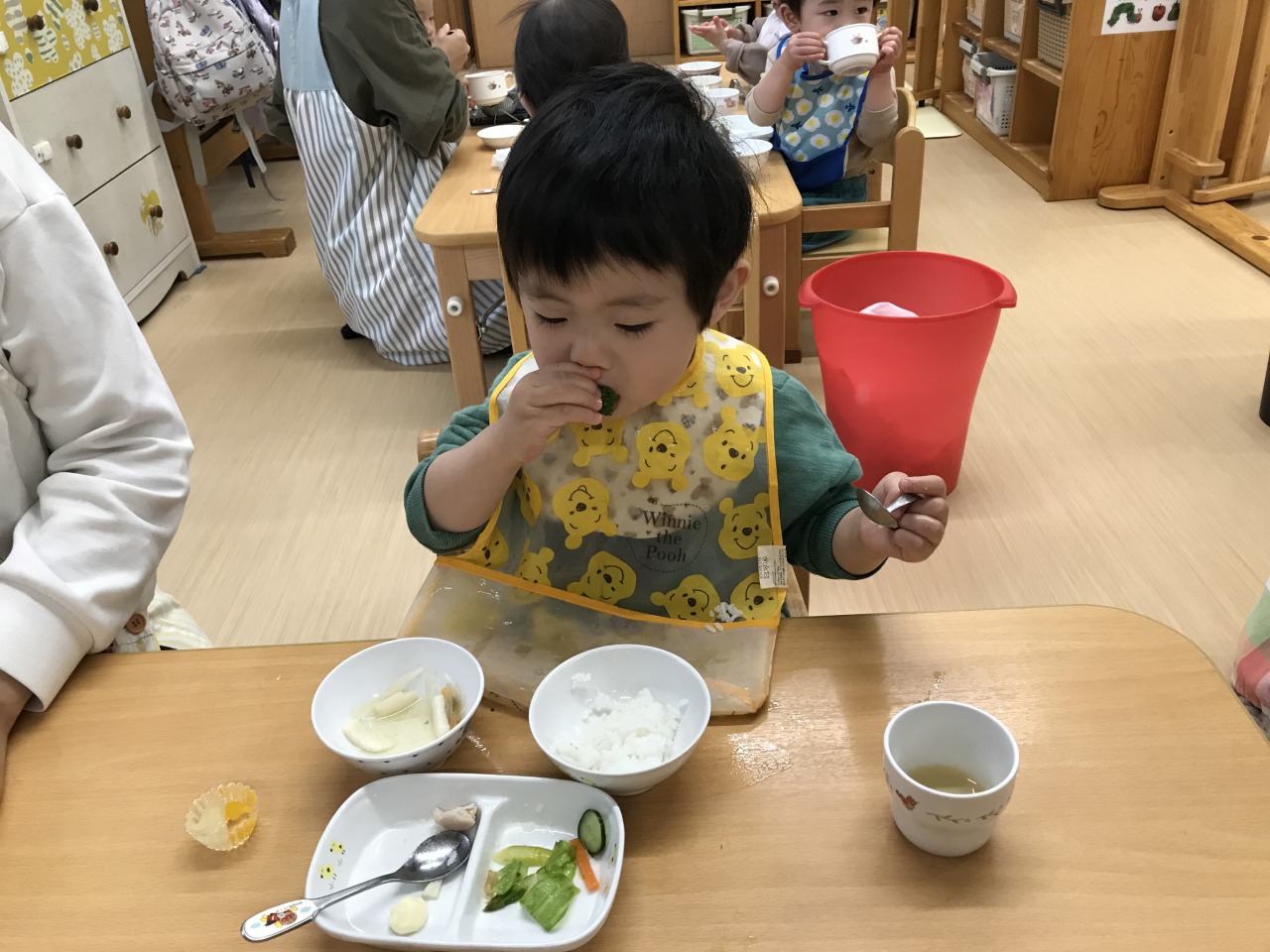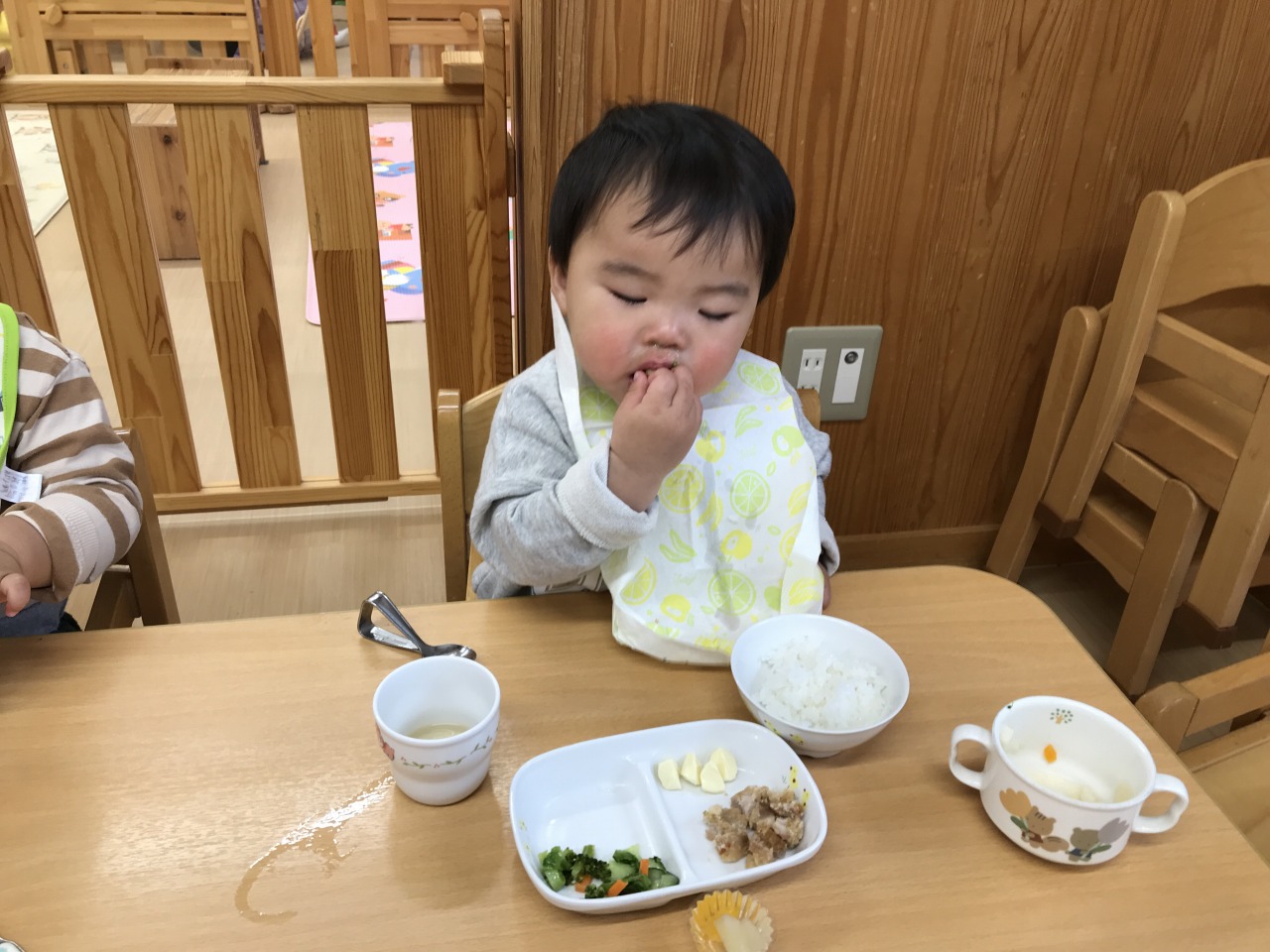 沢山身体を動かして遊んだあとは、みんなの大好きなお昼ご飯の時間です!手づかみ食べや曲がりスプーンなどそれぞれの発達段階で食事の時間を楽しんでいた子ども達です。保育士等も「モグモグ、ごっくんしようね」「スプーンで食べるのが上手だね」「シャキシャキ、いい音がするね」などと沢山声掛けをして安心して食事を楽しめるようにしています。咀嚼の様子を見て食材の形状を大きくしたり、曲がりスプーンでの食事の様子を見て普通のスプーンで食べることに慣れるようにしたりしていきたいと思います。