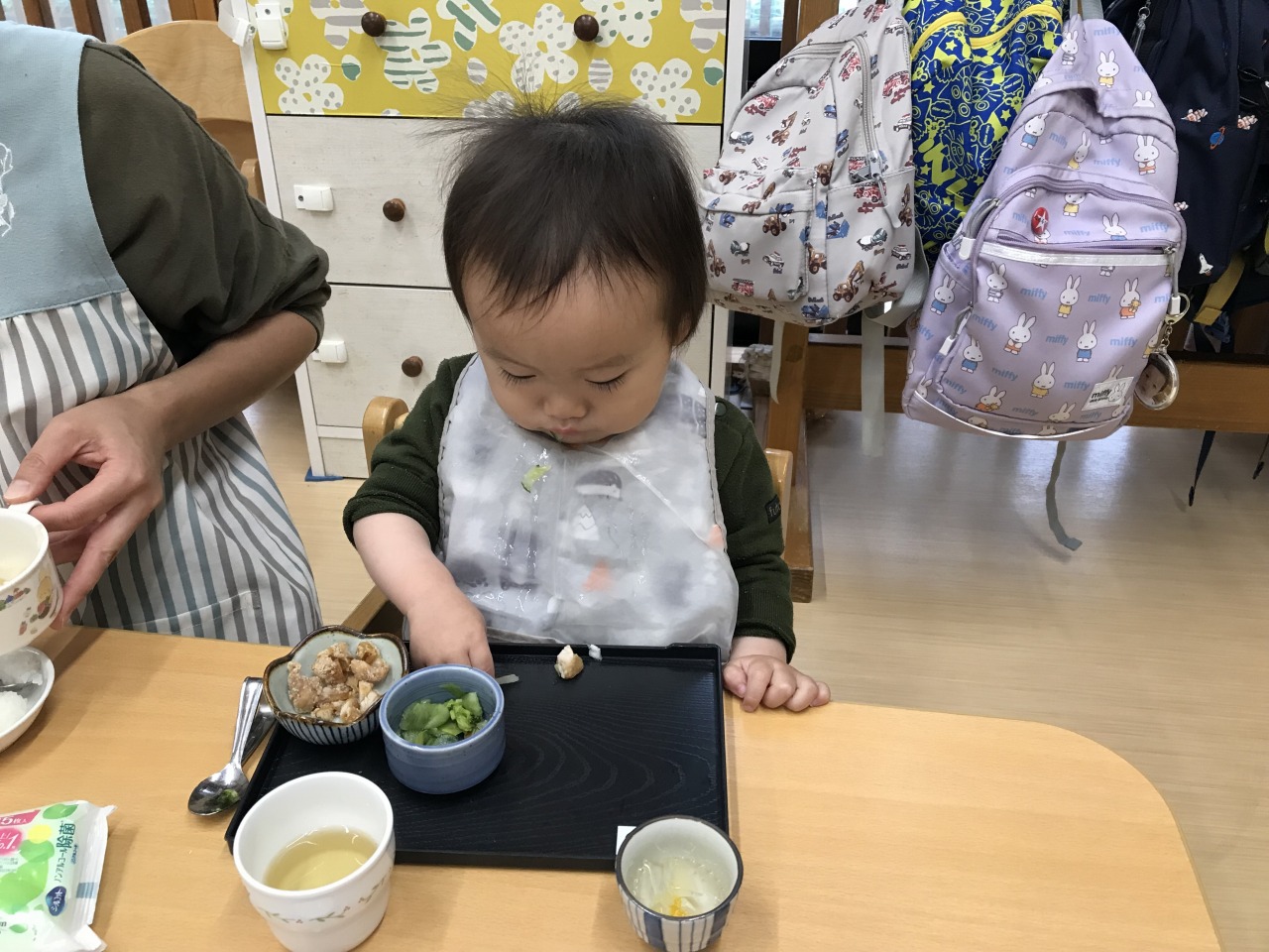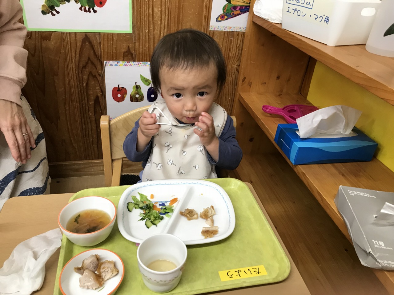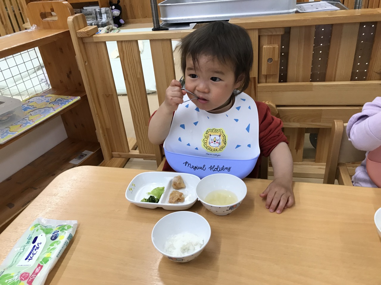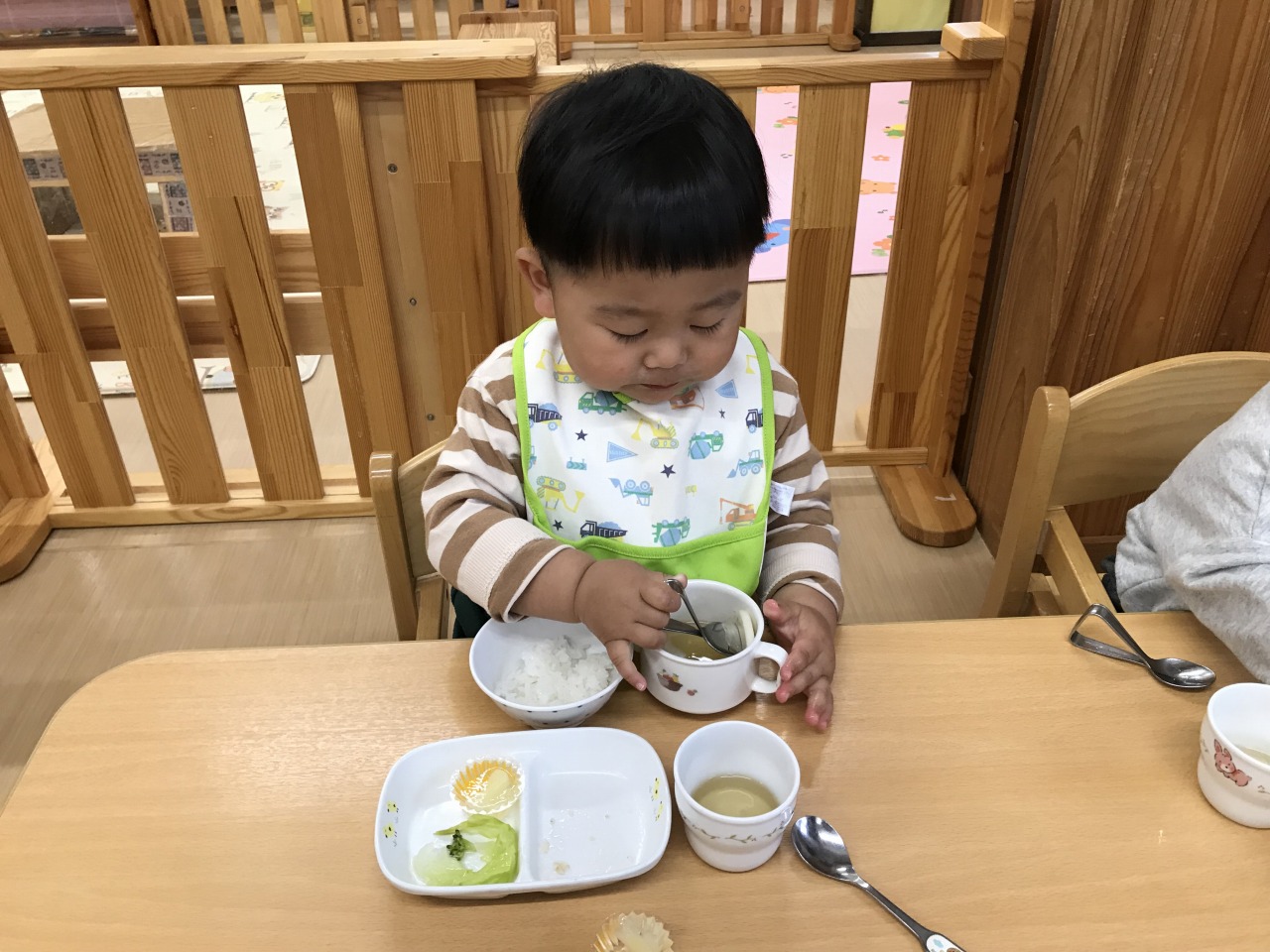 沢山身体を動かして遊んだあとは、みんなの大好きなお昼ご飯の時間です!手づかみ食べや曲がりスプーンなどそれぞれの発達段階で食事の時間を楽しんでいた子ども達です。保育士等も「モグモグ、ごっくんしようね」「スプーンで食べるのが上手だね」「シャキシャキ、いい音がするね」などと沢山声掛けをして安心して食事を楽しめるようにしています。咀嚼の様子を見て食材の形状を大きくしたり、曲がりスプーンでの食事の様子を見て普通のスプーンで食べることに慣れるようにしたりしていきたいと思います。