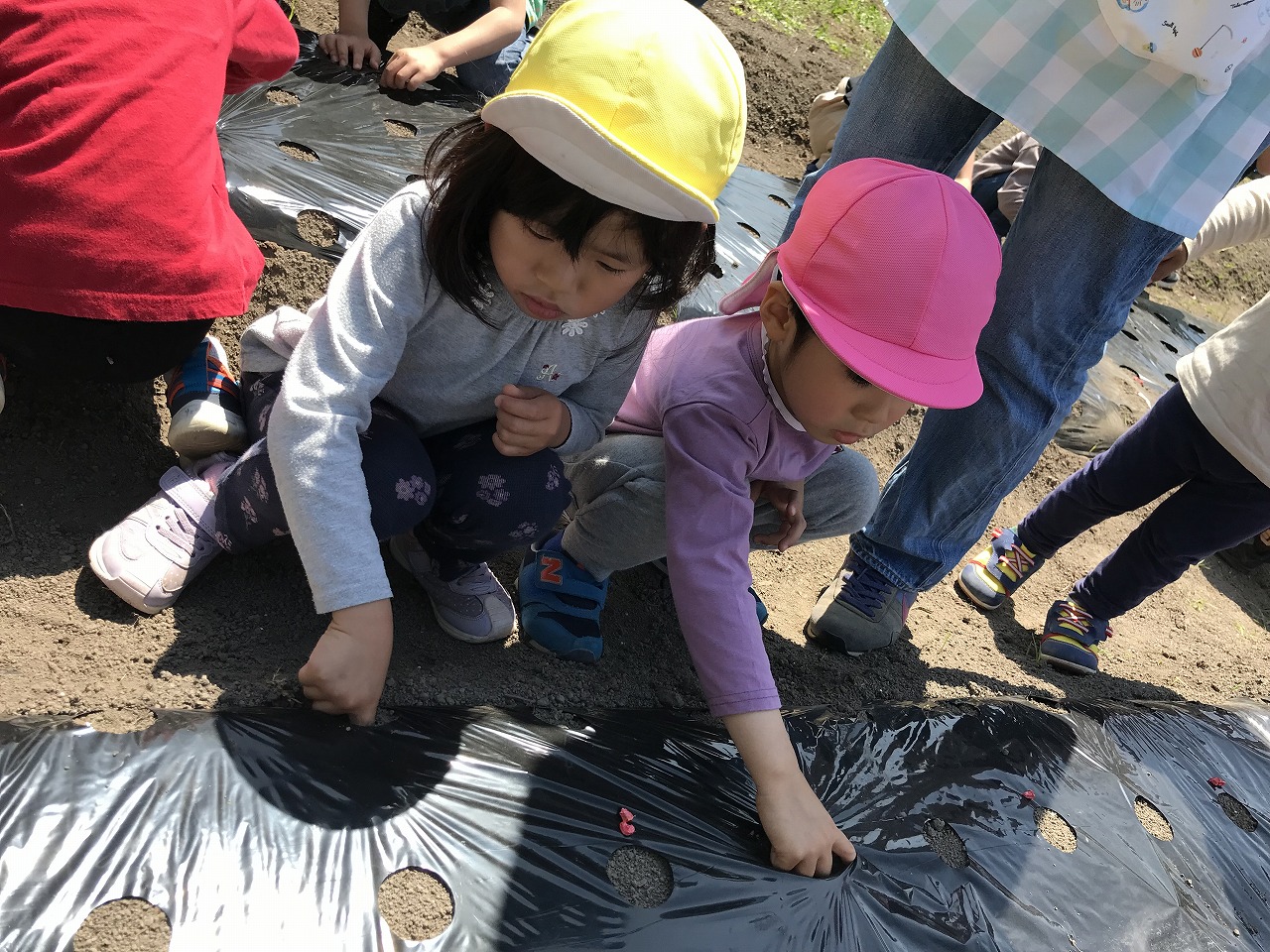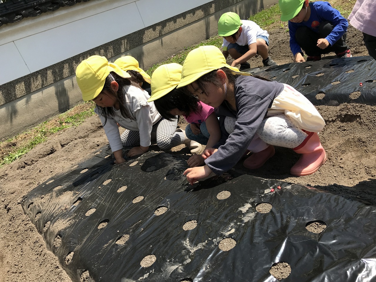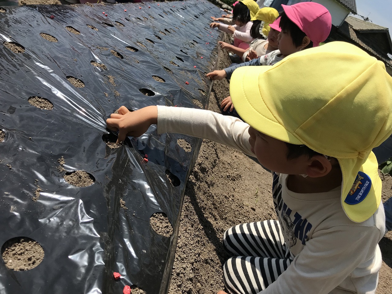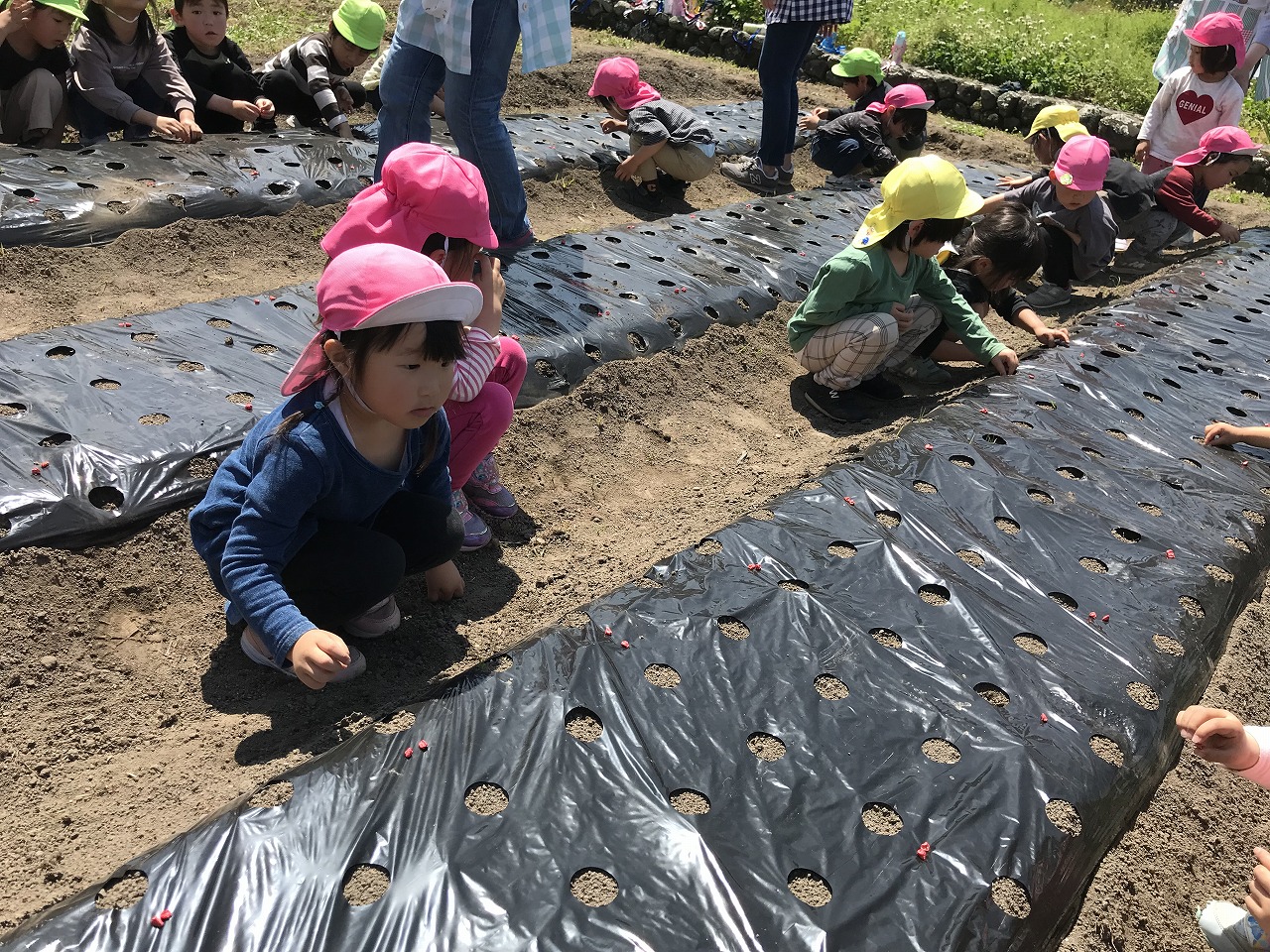 以上児(3.4.5歳児)は、とうもろこしの種植えに行きました!畑まで少し遠いので、ももぐみさん(5歳児)は小さいお友達の手をつなぎ「車がきたよ」「溝におちないように気を付けてね」等、優しく声を掛けながら散歩道をリードしてくれました。畑に到着してからは、ももさんに種植えの準備のお手伝いをお願いしました。置き場所、数に約束があり、自分たちで数を数え、考えながら手伝ってくれました。その間、さくらぐみさん(4歳児)とうめぐみさん(3歳児)はとうもろこしの赤い種を不思議そうに観察していました!準備が出来たら、種植えです。“どんなふうに大きくなるんだろう?!”と期待を持ちながら植えていたこども達。最後は畑のお世話をして下さっている先生に “どうしてとうもろこしの種は赤いの?” “ずっと種のまま?”等の疑問にこたえて頂き、新たに知った事への面白さを感じているようでした。また、生長の様子を見にいきたいと思います!