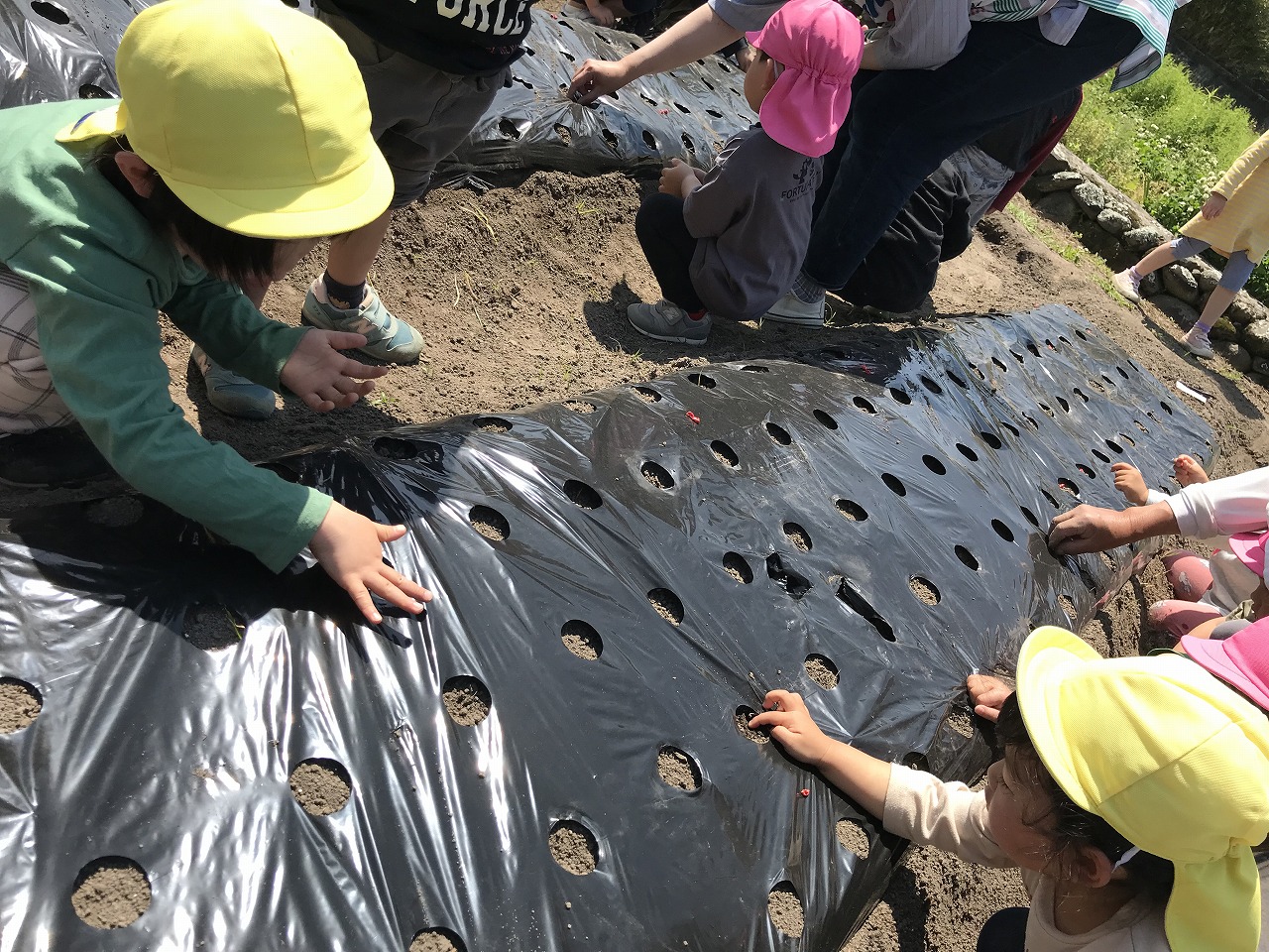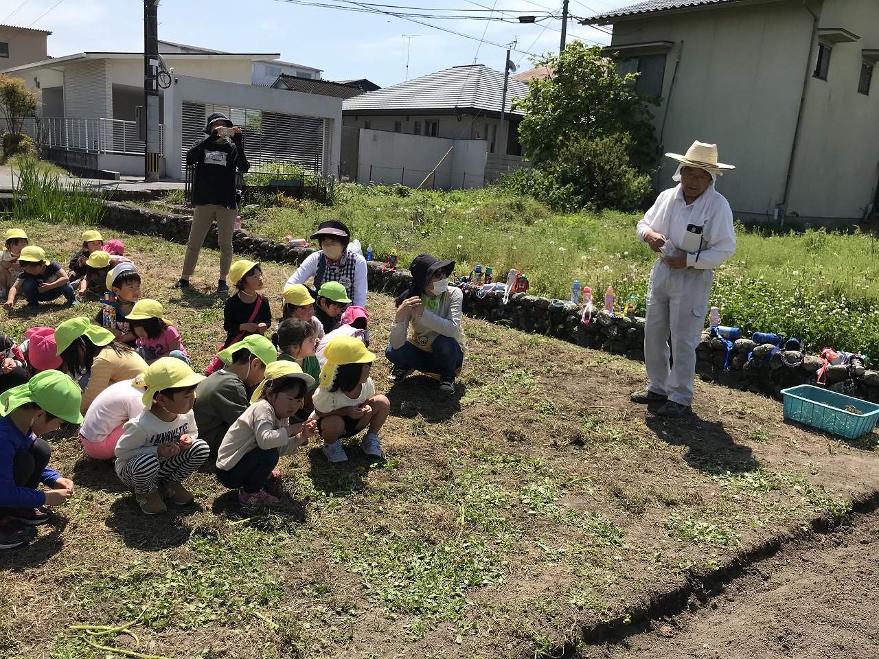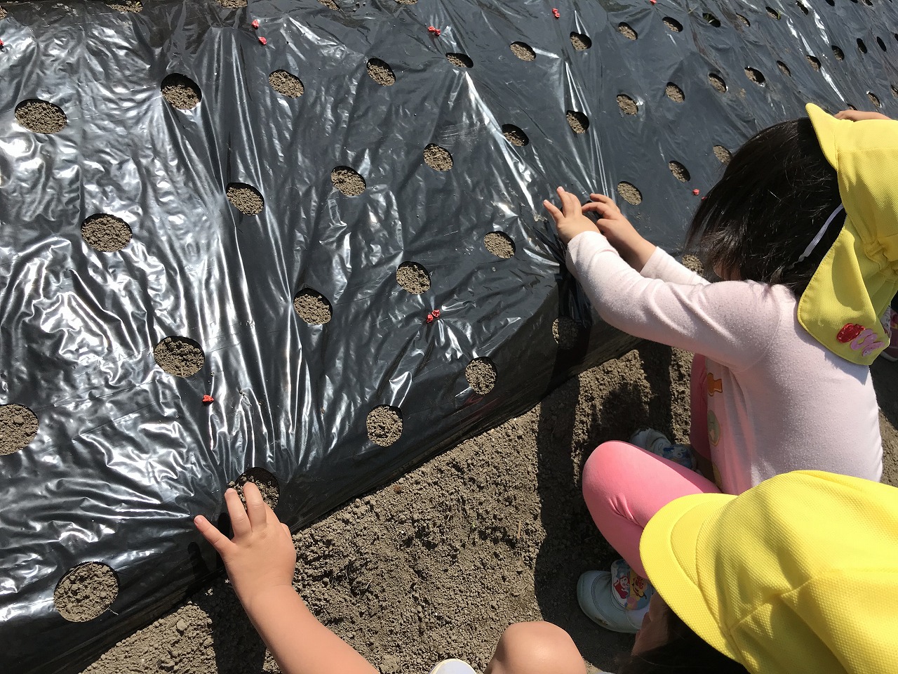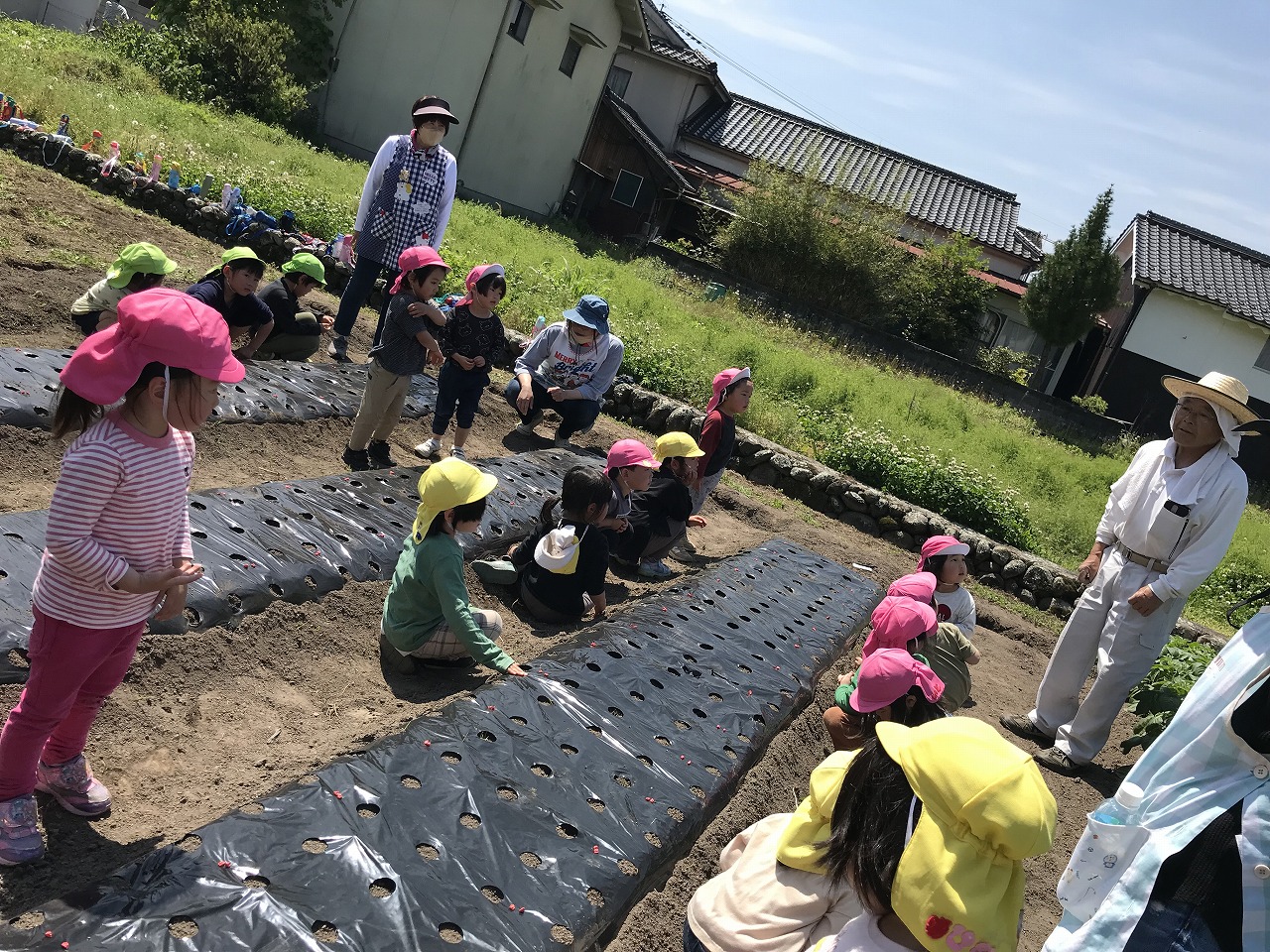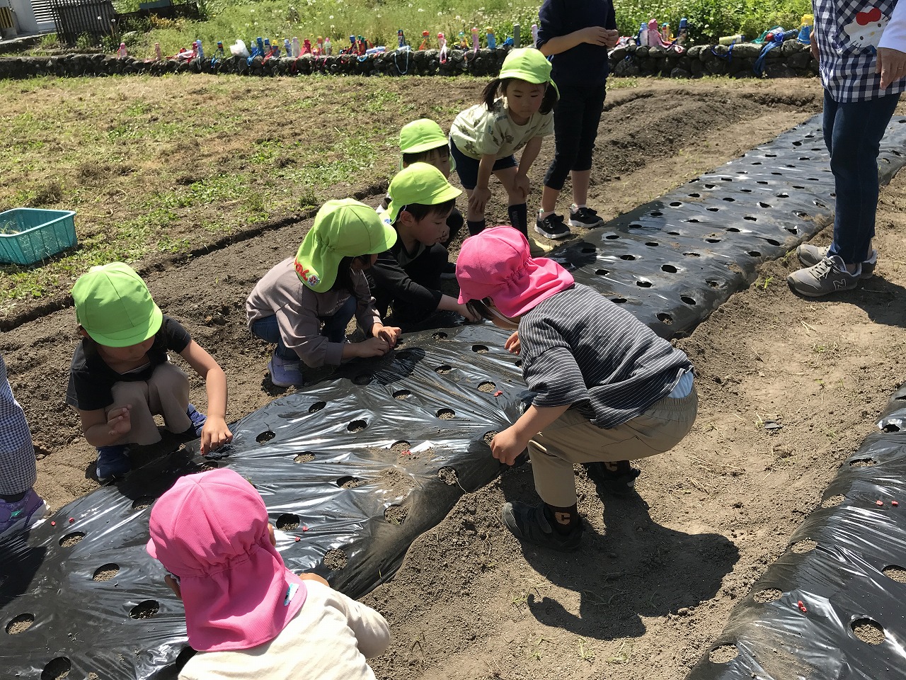 以上児(3.4.5歳児)は、とうもろこしの種植えに行きました!畑まで少し遠いので、ももぐみさん(5歳児)は小さいお友達の手をつなぎ「車がきたよ」「溝におちないように気を付けてね」等、優しく声を掛けながら散歩道をリードしてくれました。畑に到着してからは、ももさんに種植えの準備のお手伝いをお願いしました。置き場所、数に約束があり、自分たちで数を数え、考えながら手伝ってくれました。その間、さくらぐみさん(4歳児)とうめぐみさん(3歳児)はとうもろこしの赤い種を不思議そうに観察していました!準備が出来たら、種植えです。“どんなふうに大きくなるんだろう?!”と期待を持ちながら植えていたこども達。最後は畑のお世話をして下さっている先生に “どうしてとうもろこしの種は赤いの?” “ずっと種のまま?”等の疑問にこたえて頂き、新たに知った事への面白さを感じているようでした。また、生長の様子を見にいきたいと思います!