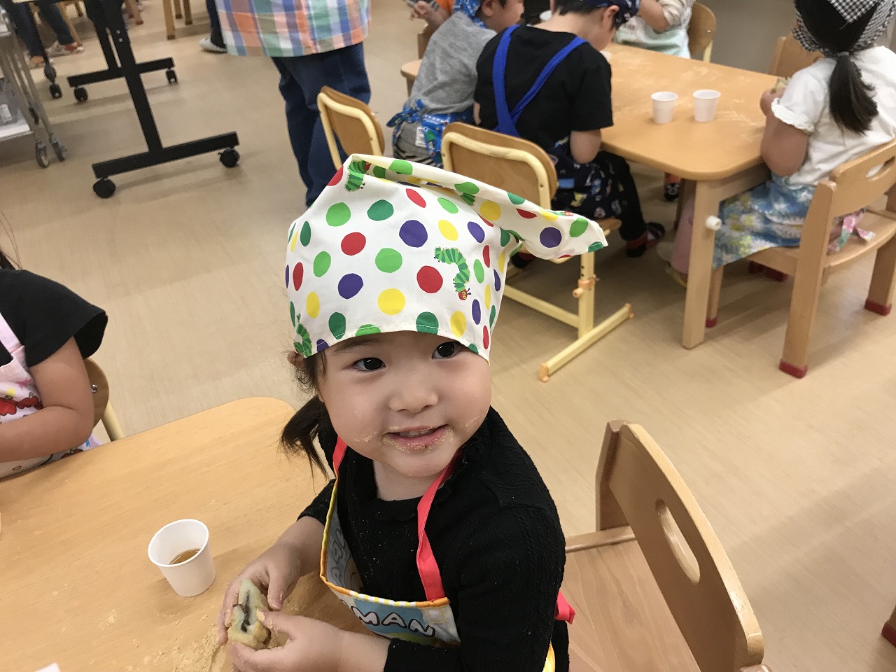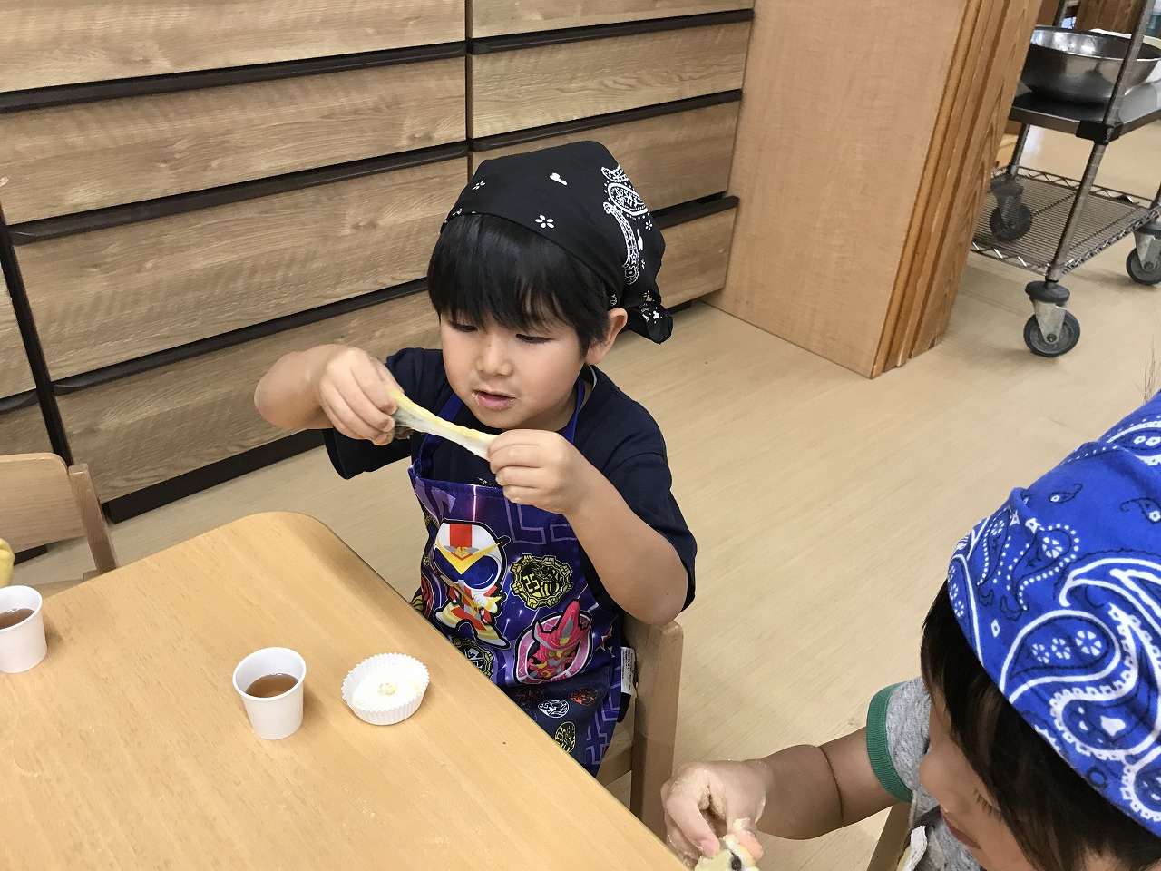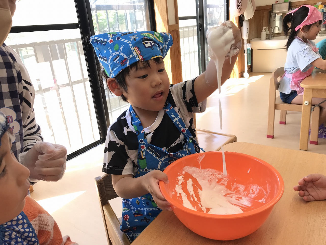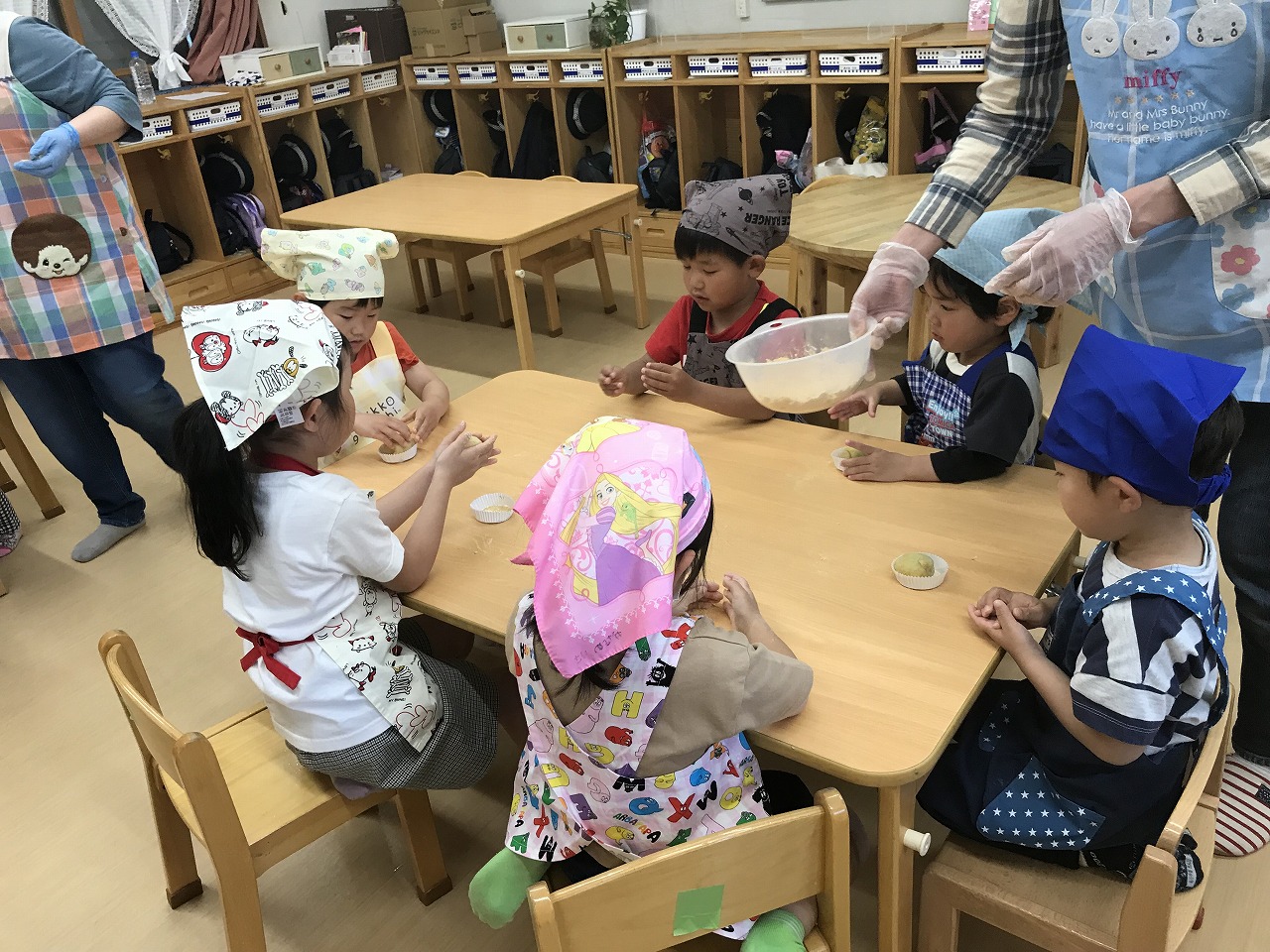 クッキングは異年齢児(3歳じ、4歳児、5歳児)のグループで行いました。