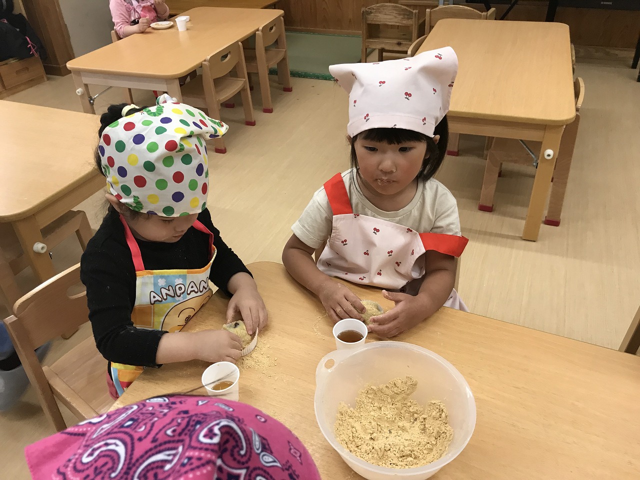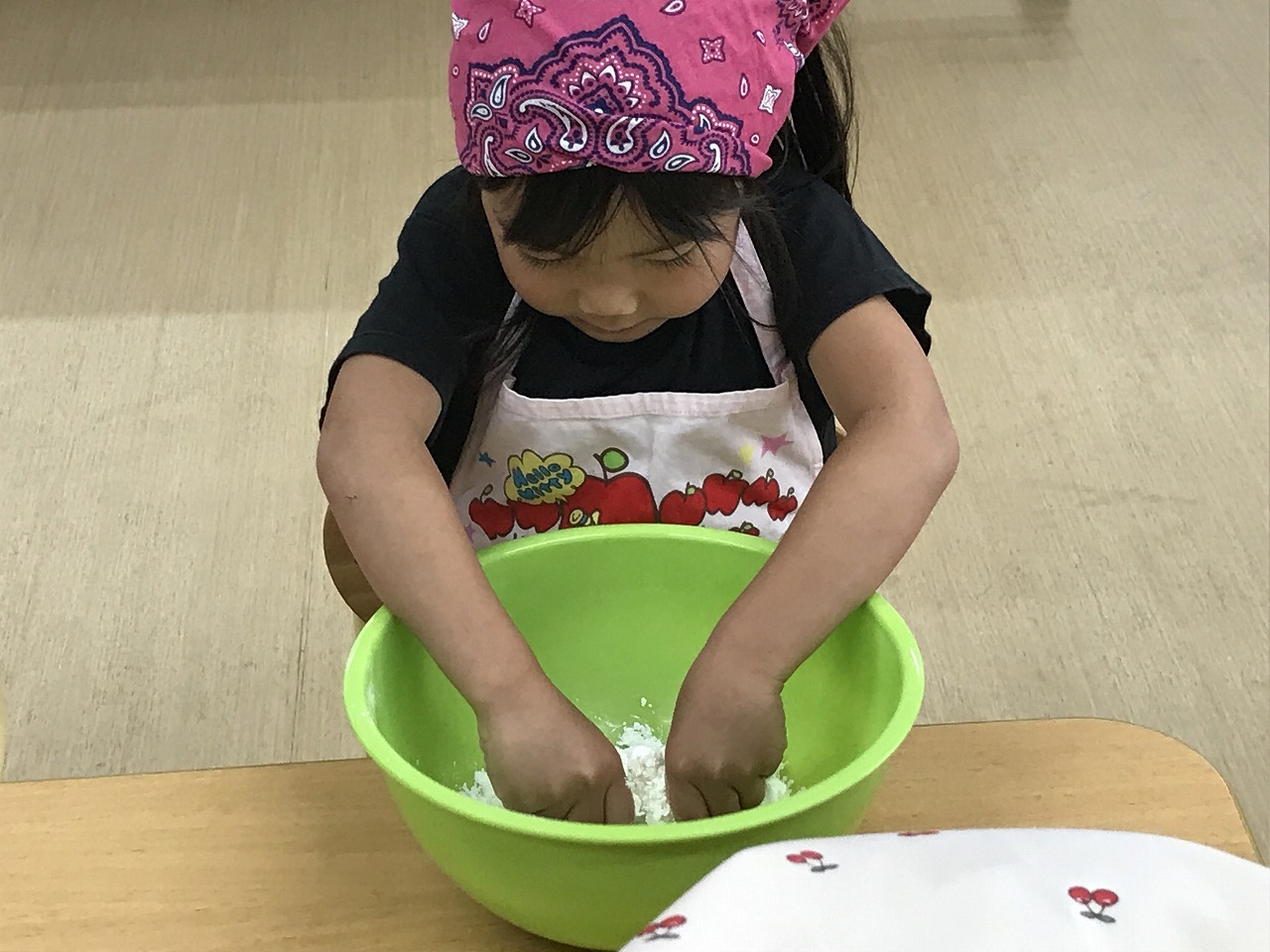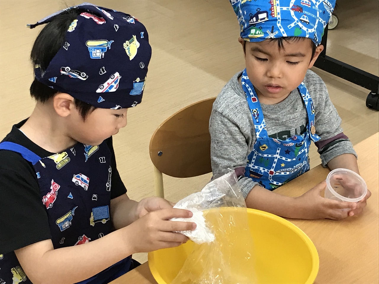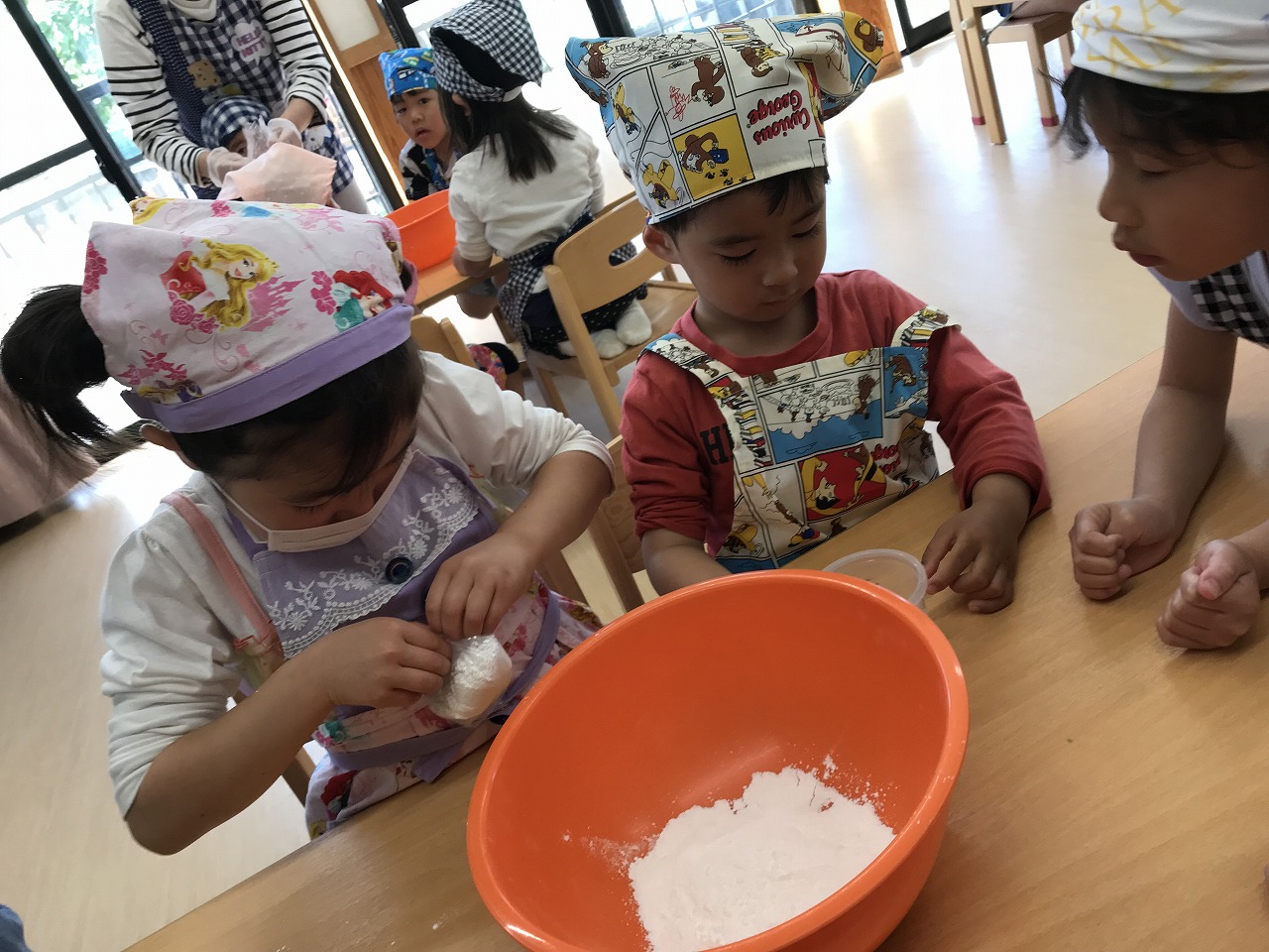 もも組はさくら組(4歳児)をリードしながら粉や水を入れて混ぜ、固まっていく様子をうめ組(3歳児)が眺めながら「団子になってきたね」と出来上がりを待っていました。