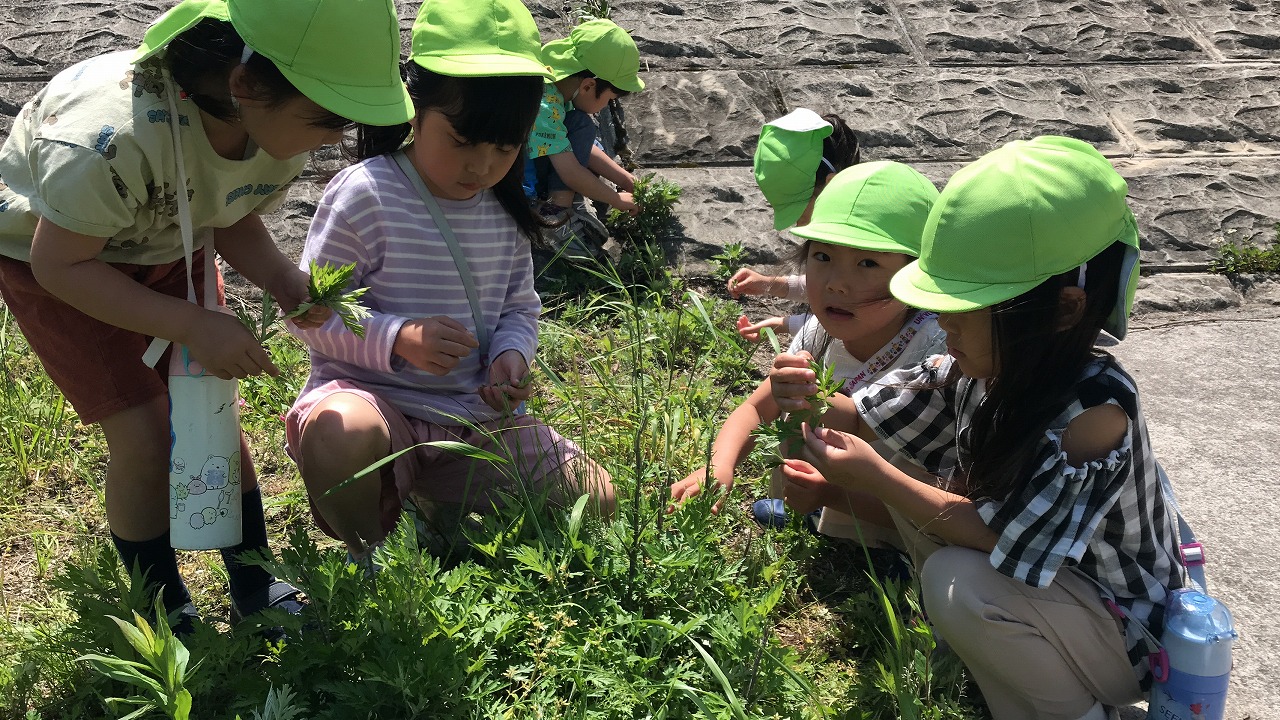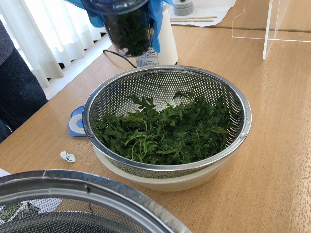 よもぎは事前にもも組(5歳児)が収穫し実際に茹でる工程まで行いました。よもぎの色の変化を実際に見ることでクッキングを行う楽しさがわいてきたようで、今日のクッキングを楽しみにしていました。