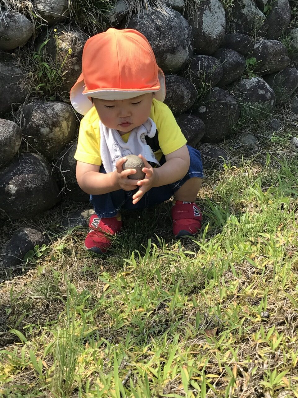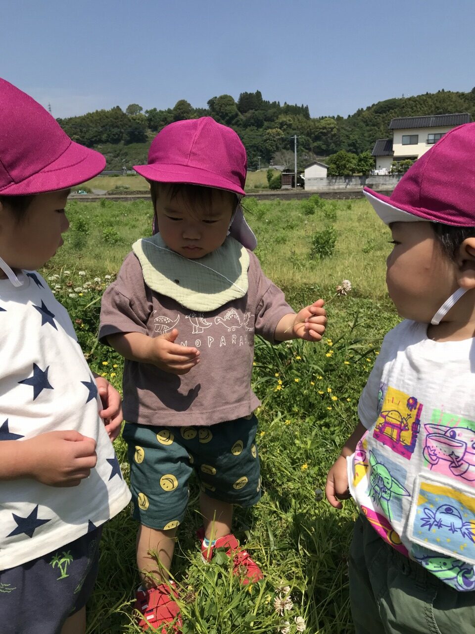 すみれ組(1歳児)はお散歩に行きました。ご近所の方に会うと、バイバイと手を振ってご挨拶をする子ども達の微笑ましい姿に、出会った方も優しくこたえてくださいました。今日は子ども達の好きな田んぼの横の道まで行きました。到着すると、元気いっぱいに駆け出していきました。アスファルトではないので少しよろけながらも身体を支えながらしっかりと走っていました。シロツメクサなどの可愛いお花を見つけると立ち止まったり、座ってちよんちょんと指先で触ってみたり自分で摘んだりと一人ひとりの反応も違います。草花の中によく見るとテントウムシがいました。触ってみようとすると飛んでいったり、思ったようにつかまえられないので不思議そうに見つめる子どもの姿もありました。身近な自然には子どもの心をわくわくさせるものがたくさんあります。これからも自然にふれながら子ども達の興味や関心が広がるような経験を重ねていきたいです。お部屋ではホールに出てリトルジムで遊んだり好きな遊びを楽しみました。たくさん遊んでお昼寝もぐっすりの子どもたちです。元気を回復して明日も元気いっぱいに遊びましょうね。