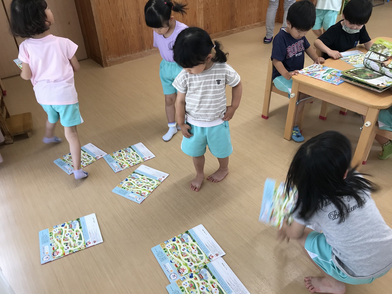 始めは、絵本の裏を見て迷路に挑戦しました。「最初は自分で迷路をしてみてゴールまでの道が分かった人は静かに手を挙げて知らせてね」と保育士が伝えると、さっそく自分達で迷路に挑戦し、答えがわかるとお約束通りに静かに手を挙げて知らせてくれていたさくら組(4歳児)さんです。