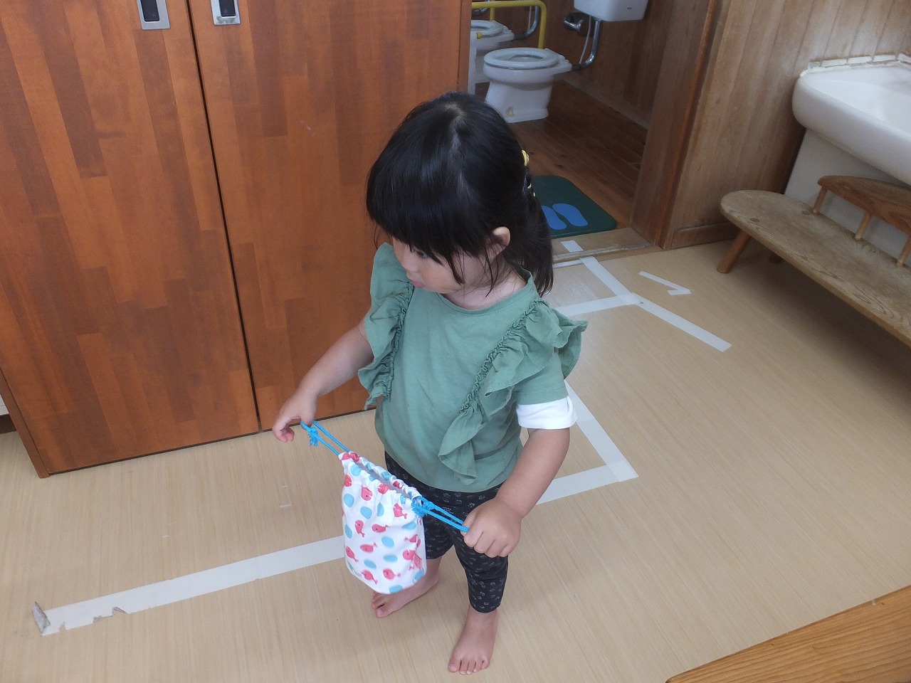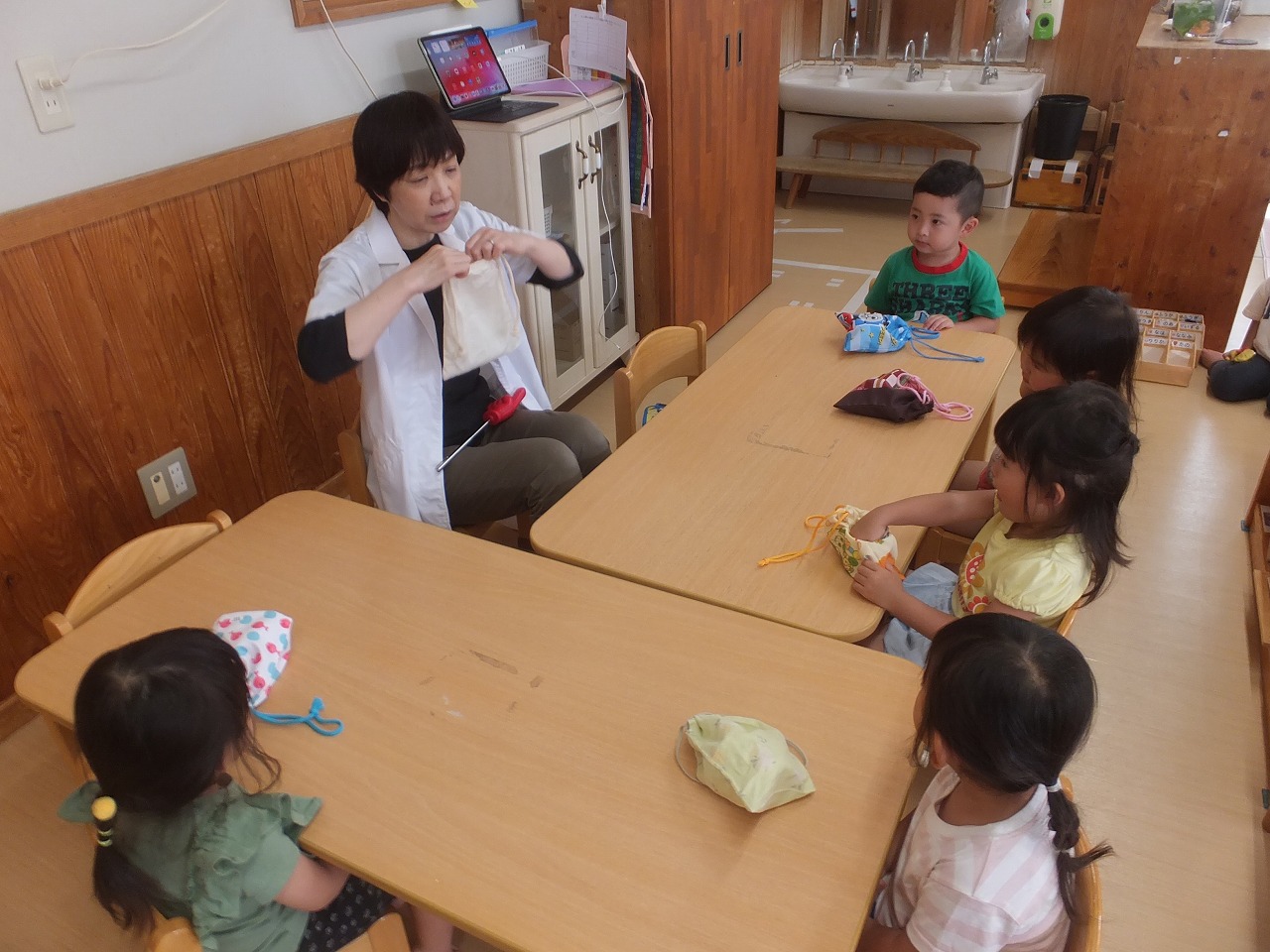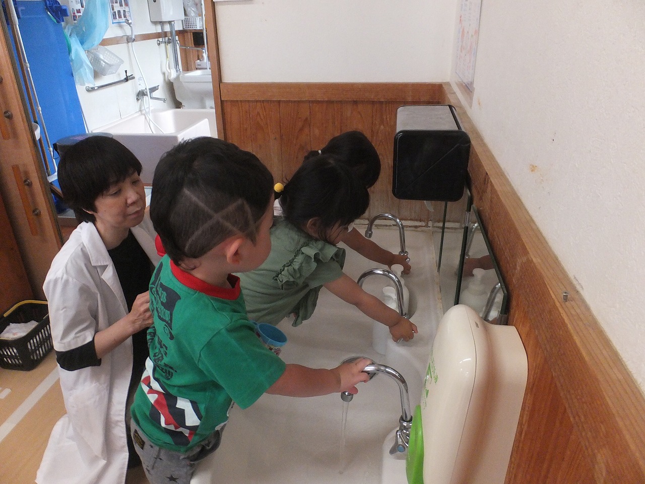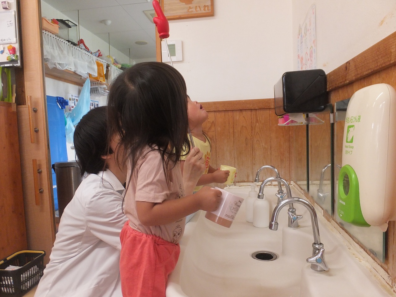 今年度初めての保健指導は、たんぽぽ組からスタートです。4・5・6・7月生まれのお友だち5名が対象でした。まずは「エアーブクブク」という、水を含まず練習する方法で2~3回練習してからいざ本番です。最初は口の中のばい菌を少量の水を含み「エアーブクブク」の要領で出します。次に天井のアンパンマンが見えたら大きな口を開け「あ~」と声を出すと自然にブクブクが出来ています。それを2回してうがいは終了です。口から水が流れ服が濡れることもなく5人とも上手に出来ました。随時、個別指導を進めていきます。昼食前に実施していきます。