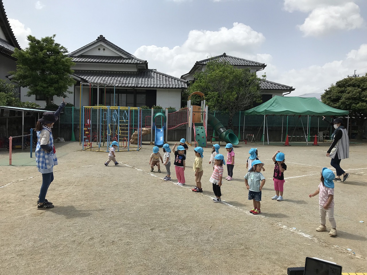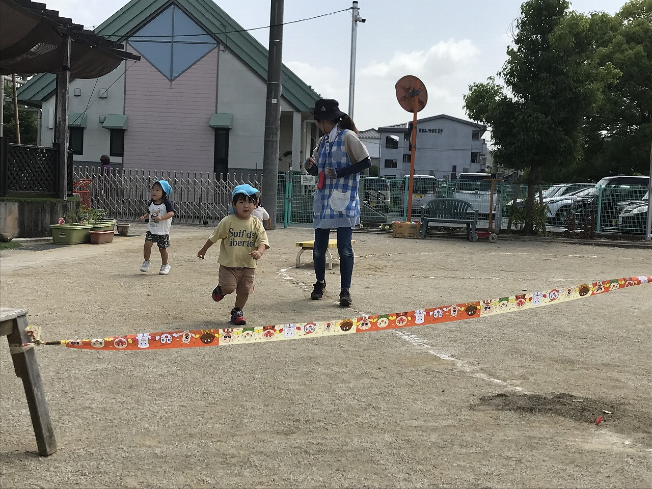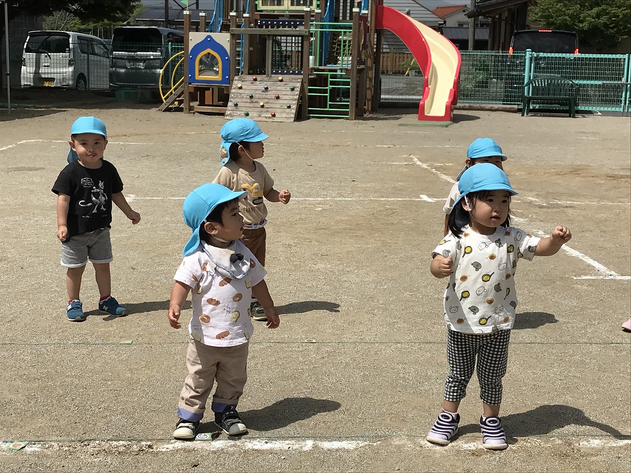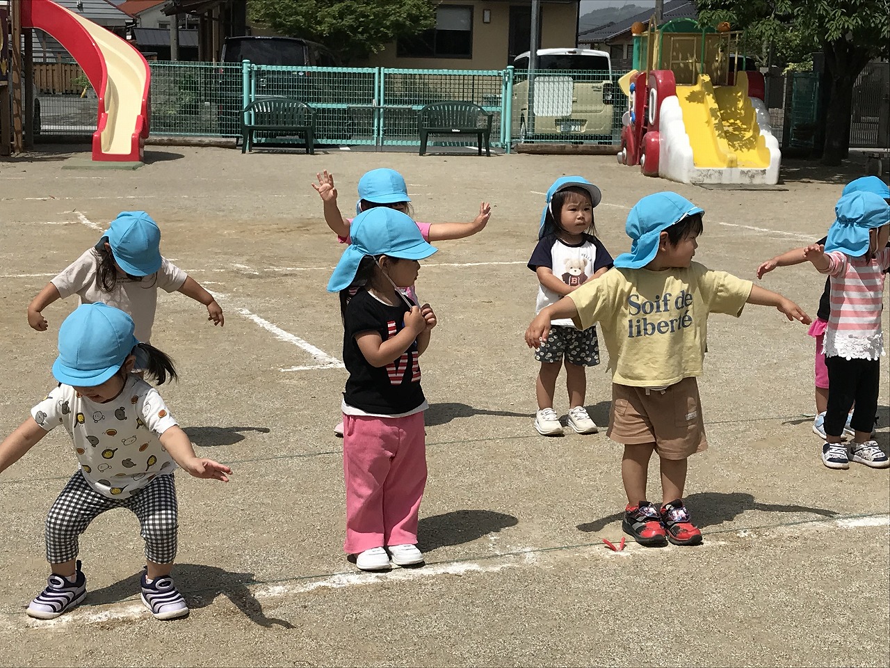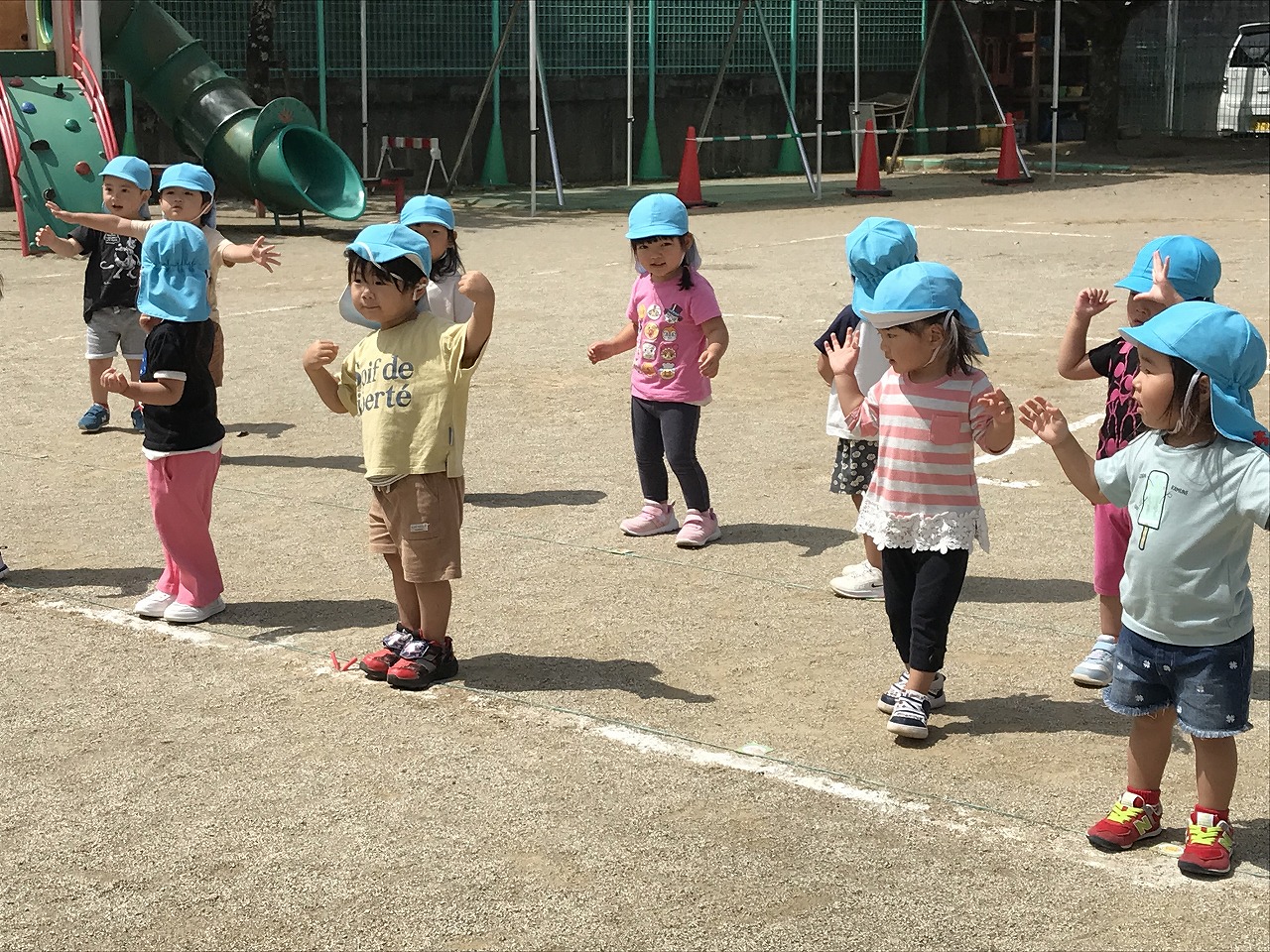 踊りが大好きなたんぽぽ組(2歳児)の子ども達。運動会で踊るリズムの練習を初めて園庭でしました。自分のマークを見つけると、「あった!!」と嬉しそうにマークのところに立っていました!保育士等が前で踊ると、振りつけもとても上手になってきて、少しずつ笑顔で楽しくできるようになってきています。その後はかけっこの練習もしました。大きな声で返事するよ!手は大きくあげてね!とお話をすると、上手に大きな声で返事ができる子が増えてきました。初めてコーナーを走るたんぽぽ組さん(2歳児)、また大きな体育館で緊張したり戸惑ったりもあると思いますが、本番に向けて楽しく練習に取り組んでいる子ども達です。その後は、園庭で好きな遊びを見つけて楽しく過ごしました!最近は三輪車をこげるようになってきた子が増えてきて、「せんせーみて!!」と嬉しそうに乗って遊ぶ姿が見られます。運動力も高まってきて、活発に遊びを楽しんでいる子ども達です。