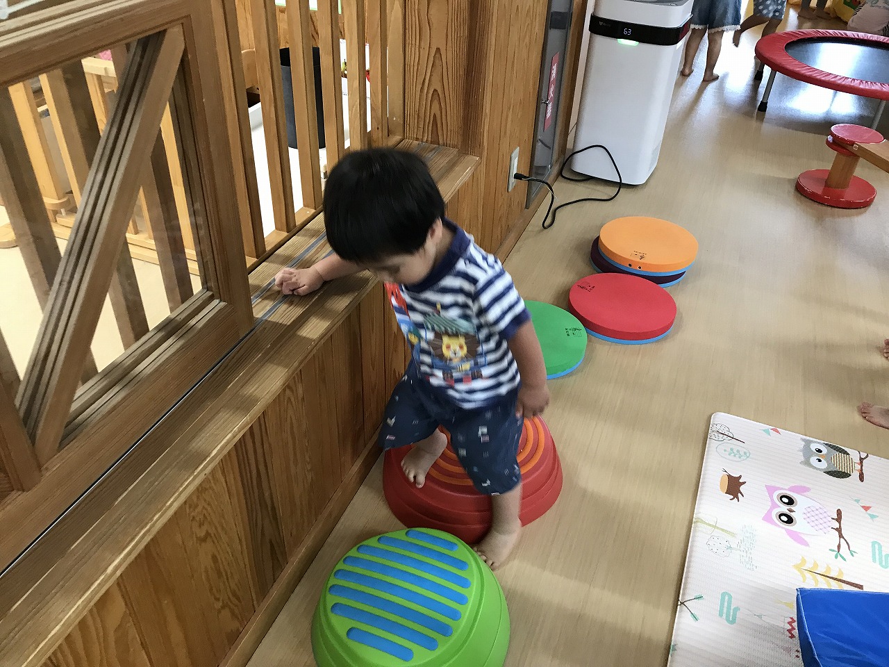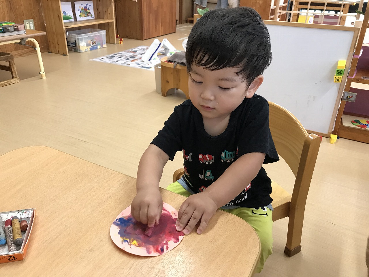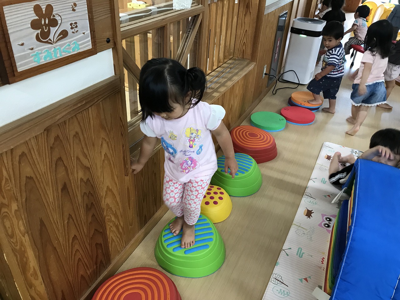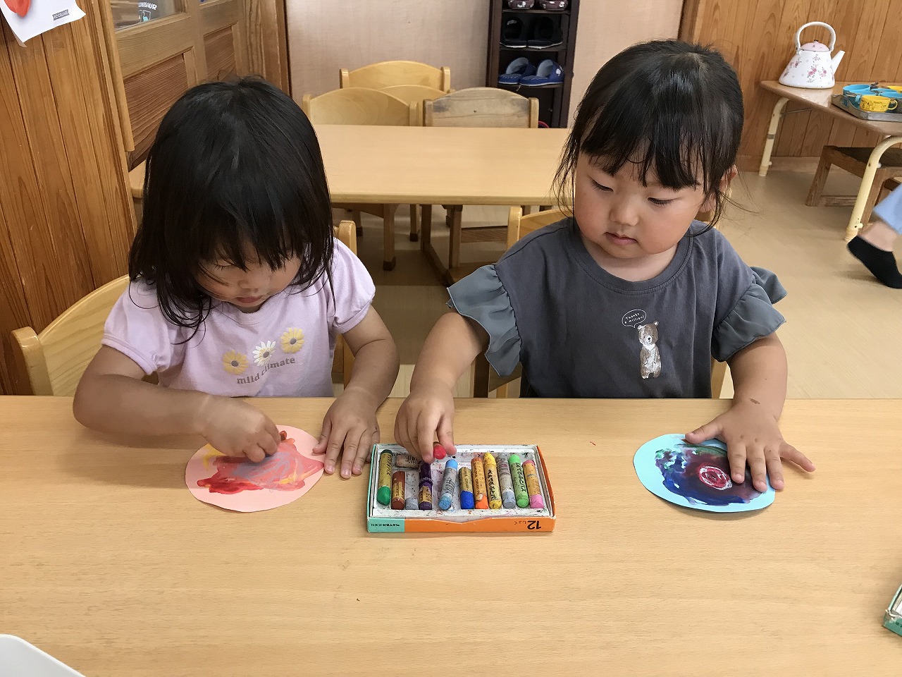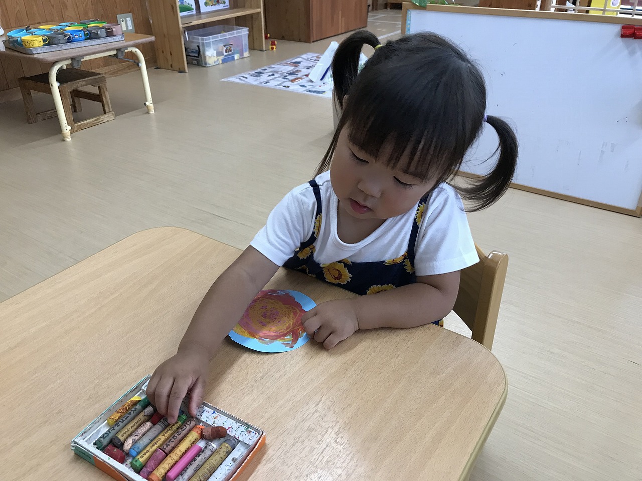 今日も朝から凄い雨でした。たんぽぽ組(2歳児)は、雨も吹き飛ばそうとお部屋で元気に過ごしました。先週部屋の模様替えをしたので、いろいろ楽しいおもちゃがあり、また今日はすみれ組(1歳児)が運動遊びをしていたので、参加させてもらったりしました。4月に絵の具遊びをした丸い作品、何かできないかと考え、今日はぐるぐるクレヨンでお絵描き。ほとんどの子が〇が描けるようになってきました。これは雨の大好きなかたつむりになりそうです!続きは明日、出来るかな。楽しみです!