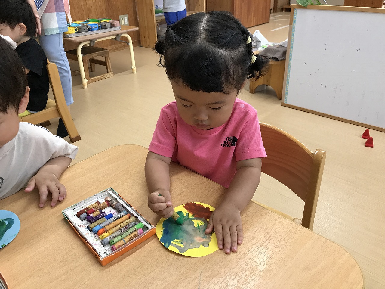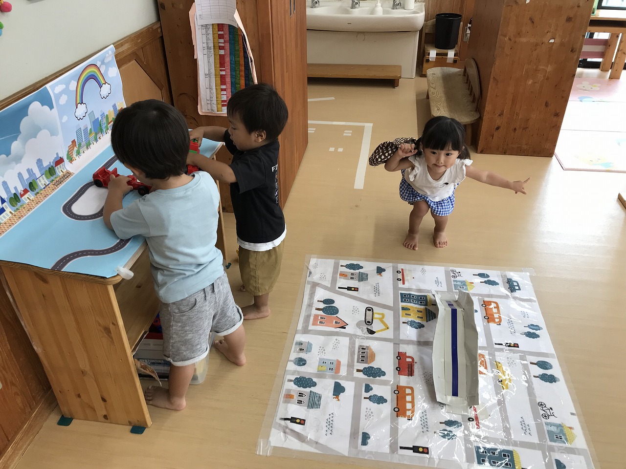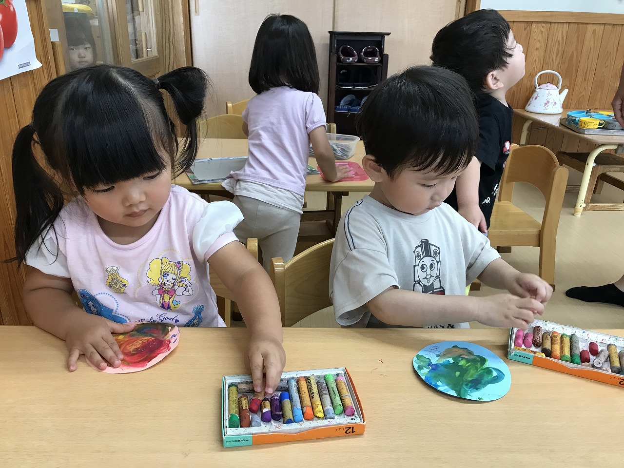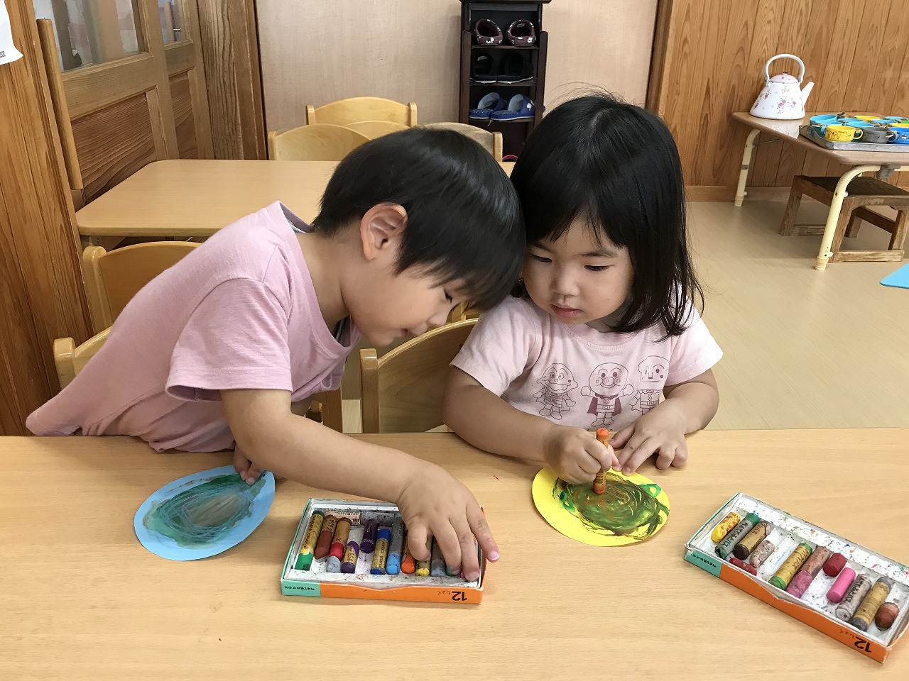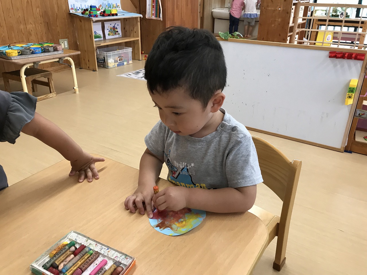 今日も朝から凄い雨でした。たんぽぽ組(2歳児)は、雨も吹き飛ばそうとお部屋で元気に過ごしました。先週部屋の模様替えをしたので、いろいろ楽しいおもちゃがあり、また今日はすみれ組(1歳児)が運動遊びをしていたので、参加させてもらったりしました。4月に絵の具遊びをした丸い作品、何かできないかと考え、今日はぐるぐるクレヨンでお絵描き。ほとんどの子が〇が描けるようになってきました。これは雨の大好きなかたつむりになりそうです!続きは明日、出来るかな。楽しみです!