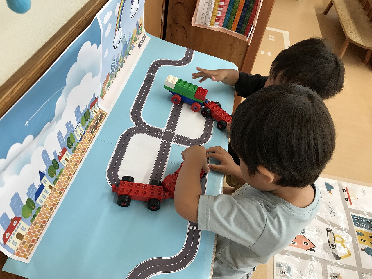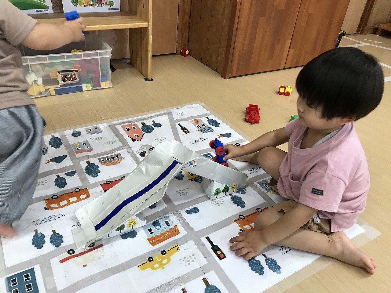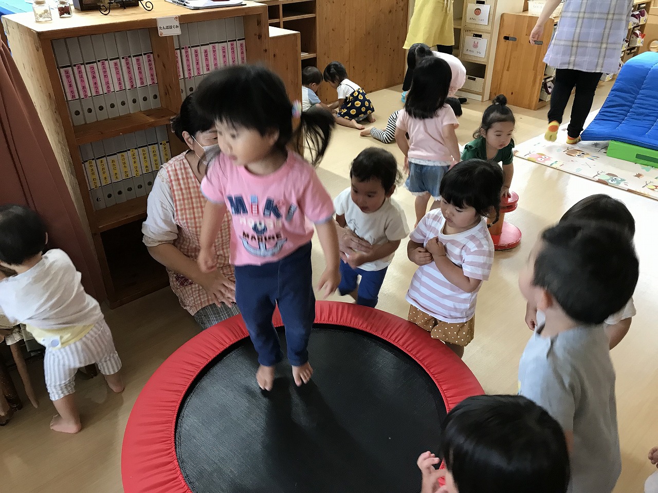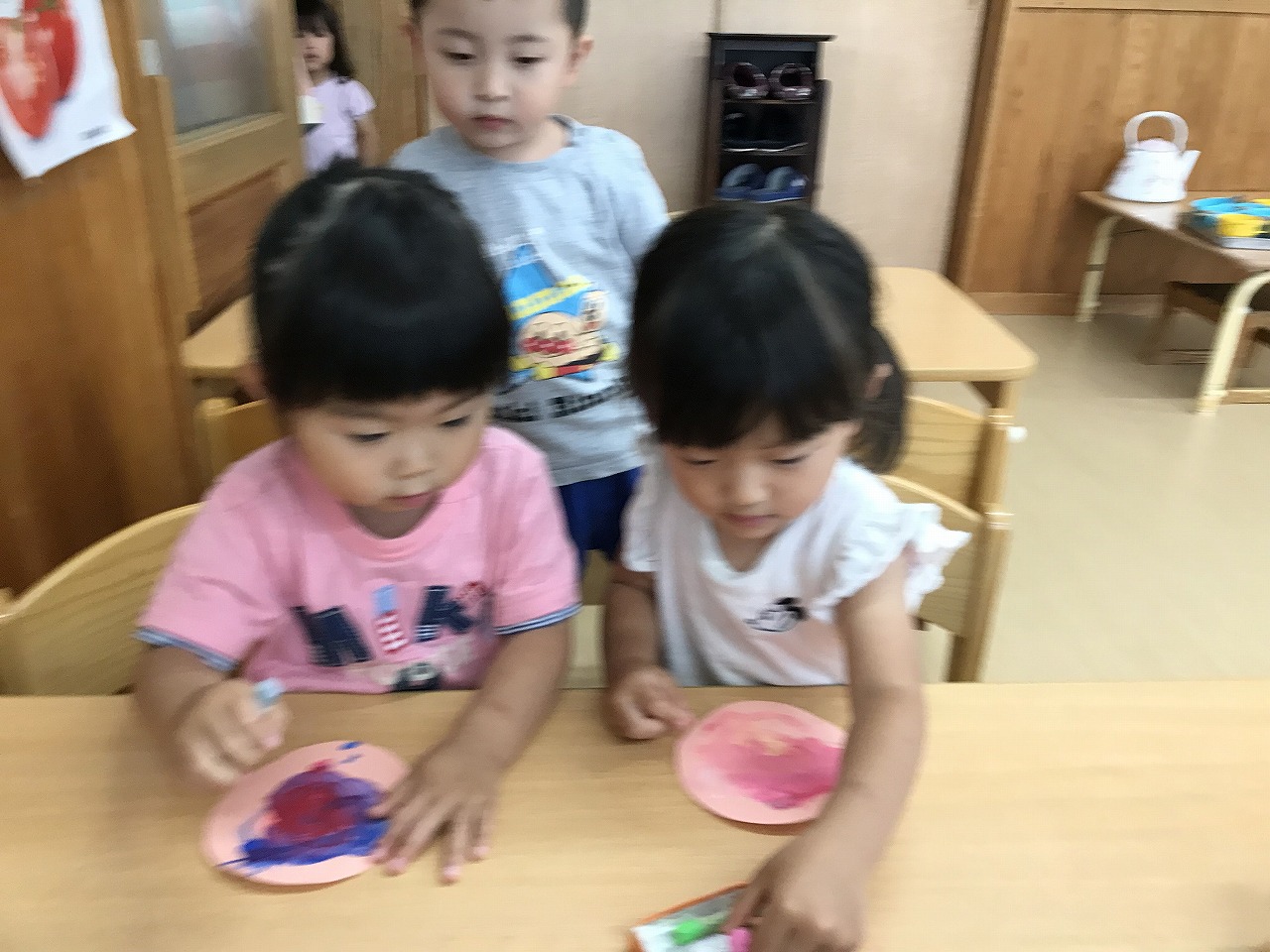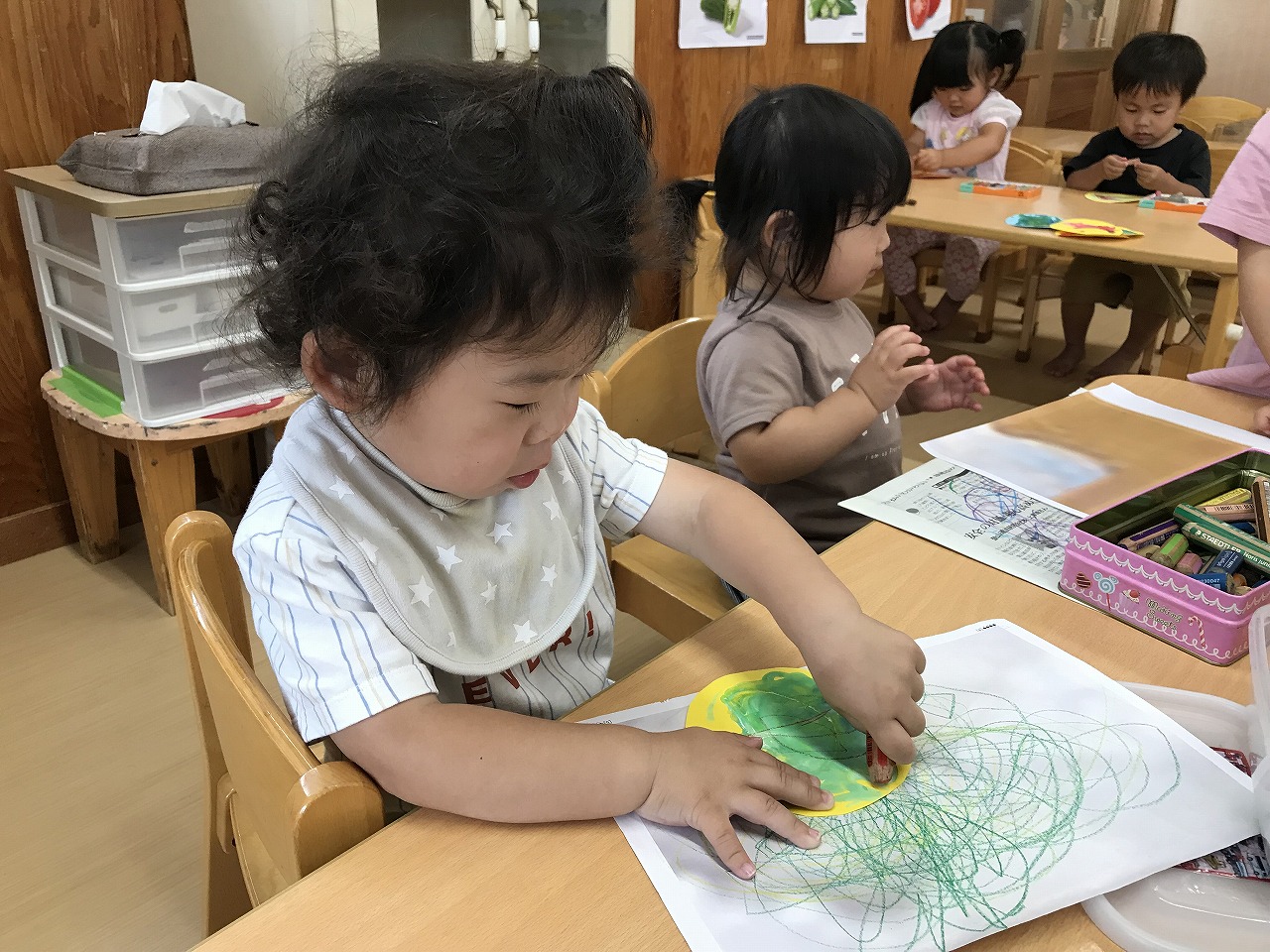今日も朝から凄い雨でした。たんぽぽ組(2歳児)は、雨も吹き飛ばそうとお部屋で元気に過ごしました。先週部屋の模様替えをしたので、いろいろ楽しいおもちゃがあり、また今日はすみれ組(1歳児)が運動遊びをしていたので、参加させてもらったりしました。4月に絵の具遊びをした丸い作品、何かできないかと考え、今日はぐるぐるクレヨンでお絵描き。ほとんどの子が〇が描けるようになってきました。これは雨の大好きなかたつむりになりそうです!続きは明日、出来るかな。楽しみです!