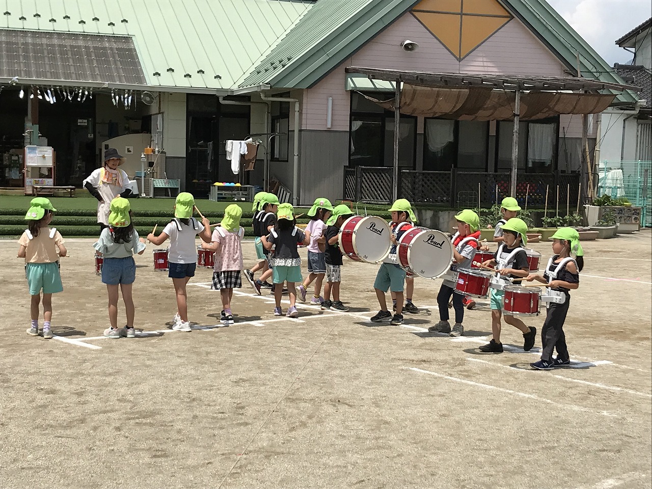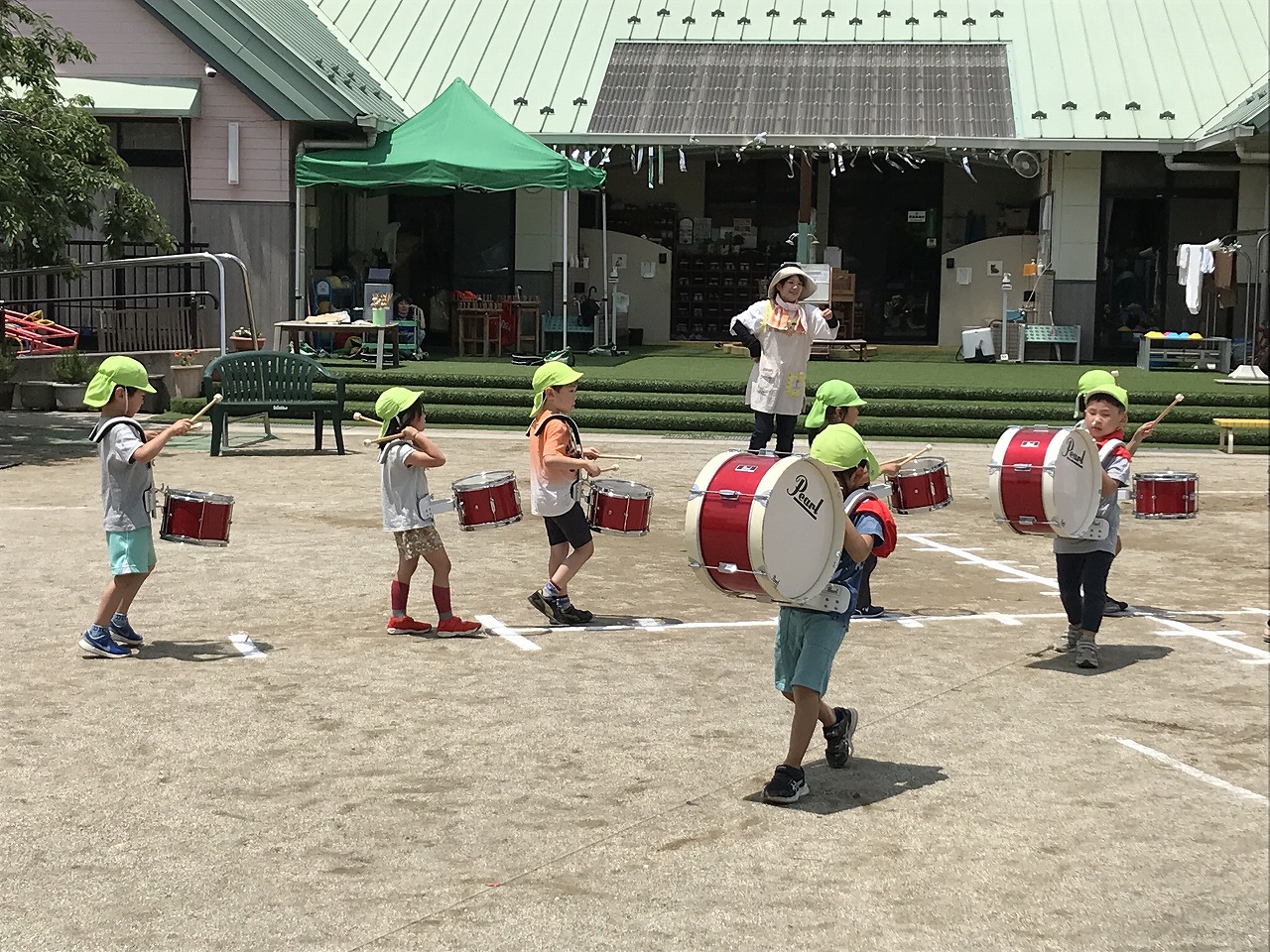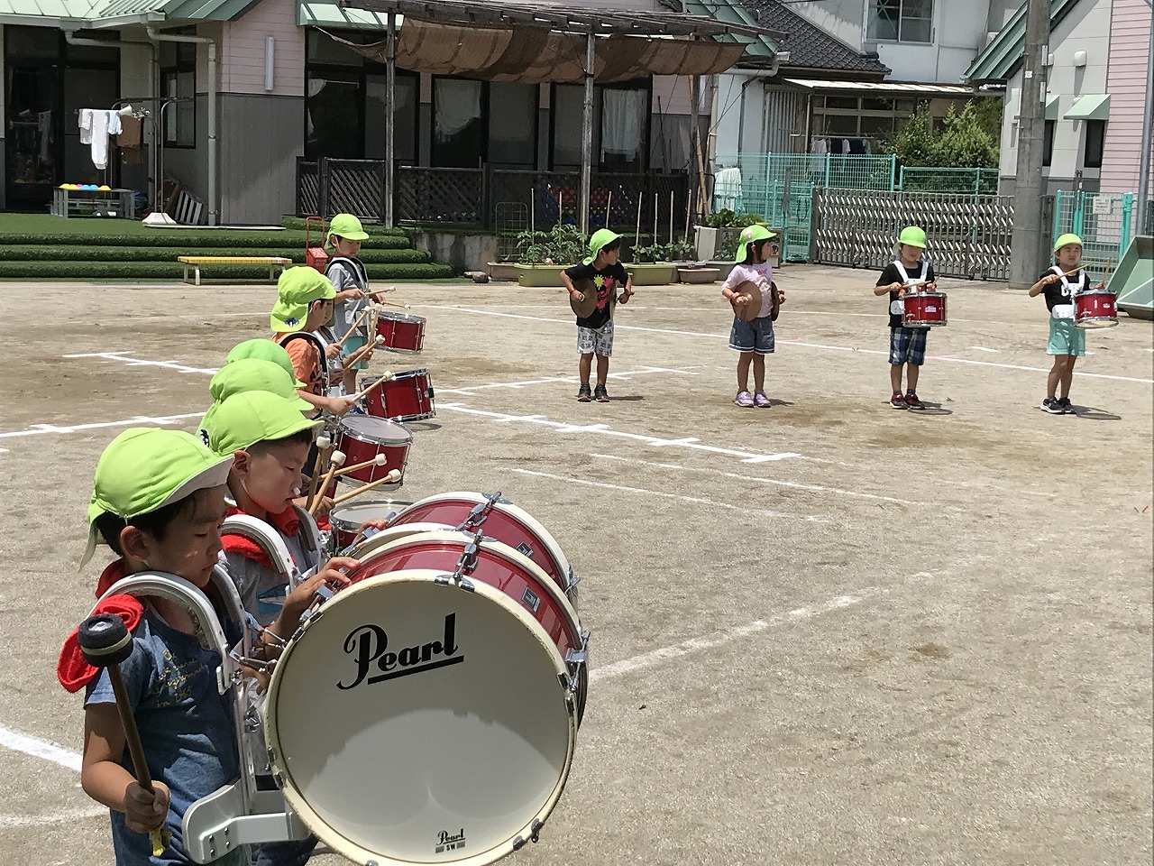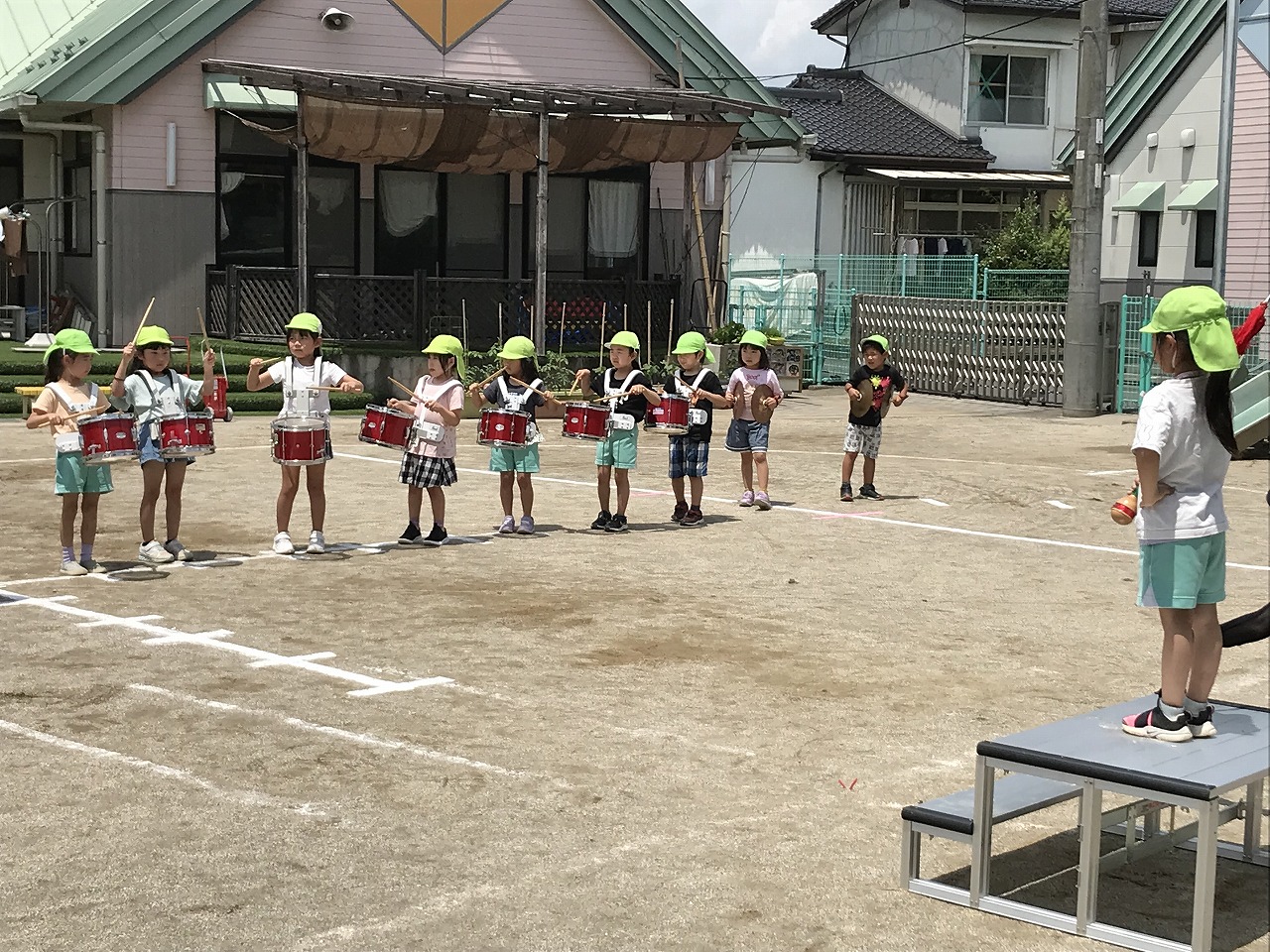 今日は、やっとお天気が良くなり、暑い中でしたが、うめ組(3歳児)・さくら組(4歳児)・もも組(5歳児)の以上児は、園庭に出て運動会の練習を元気いっぱい楽しんでいました。各クラスで競技、遊戯に取り組んだり、異年齢のグループでリレーをしたり、午後からも、もも組(5歳児)は、鼓隊の練習に一生懸命励んでいました。子どもたちのパワーは、本当に凄い!!明日は、第2リハーサルがあります。本番まで残り10日。「みんな!ガンバレー!!」