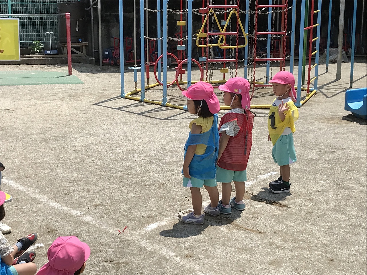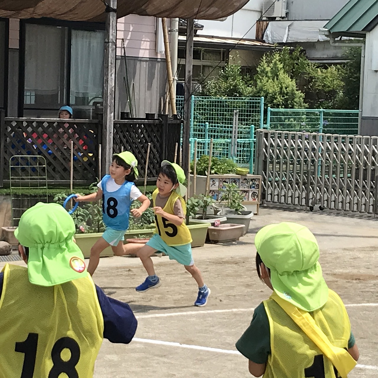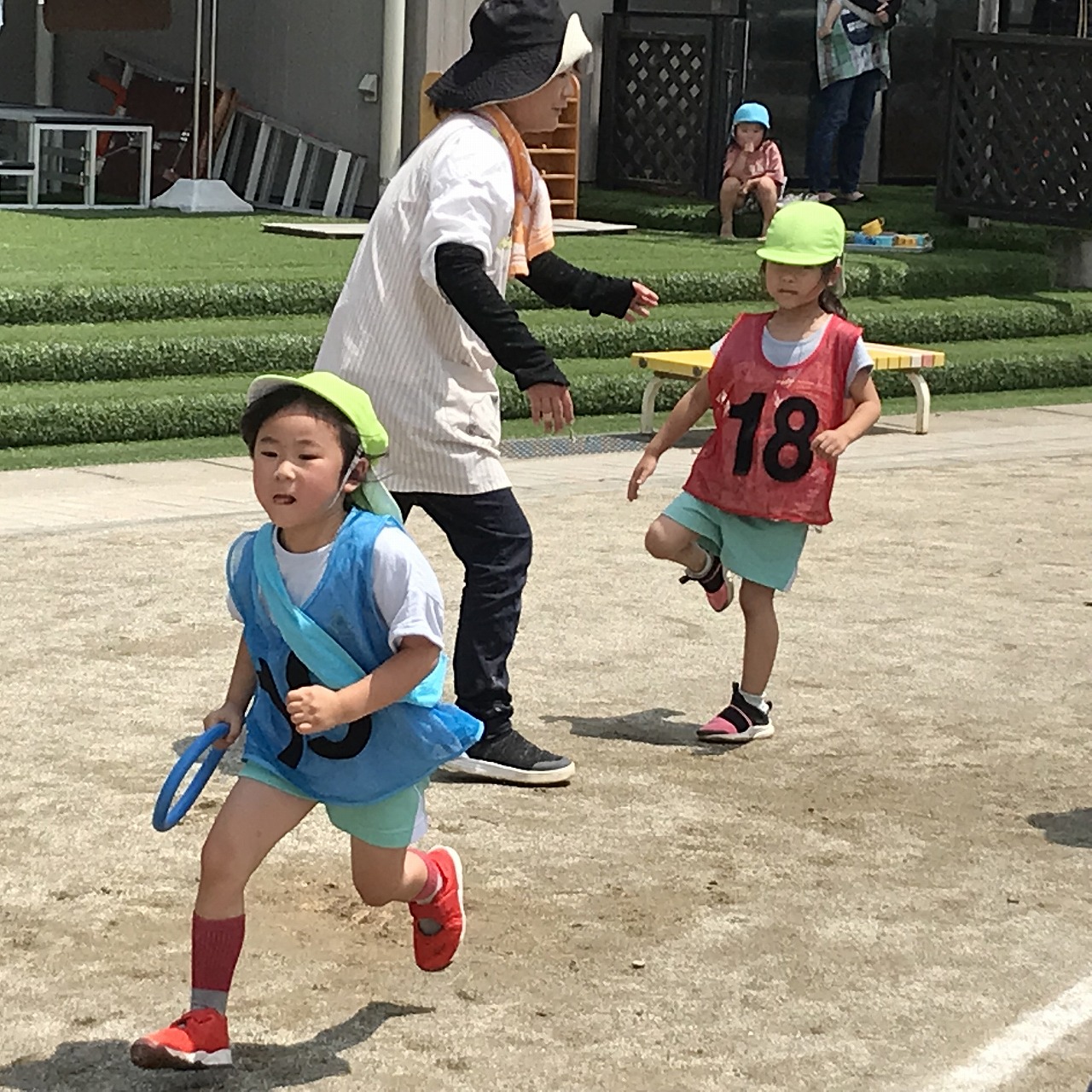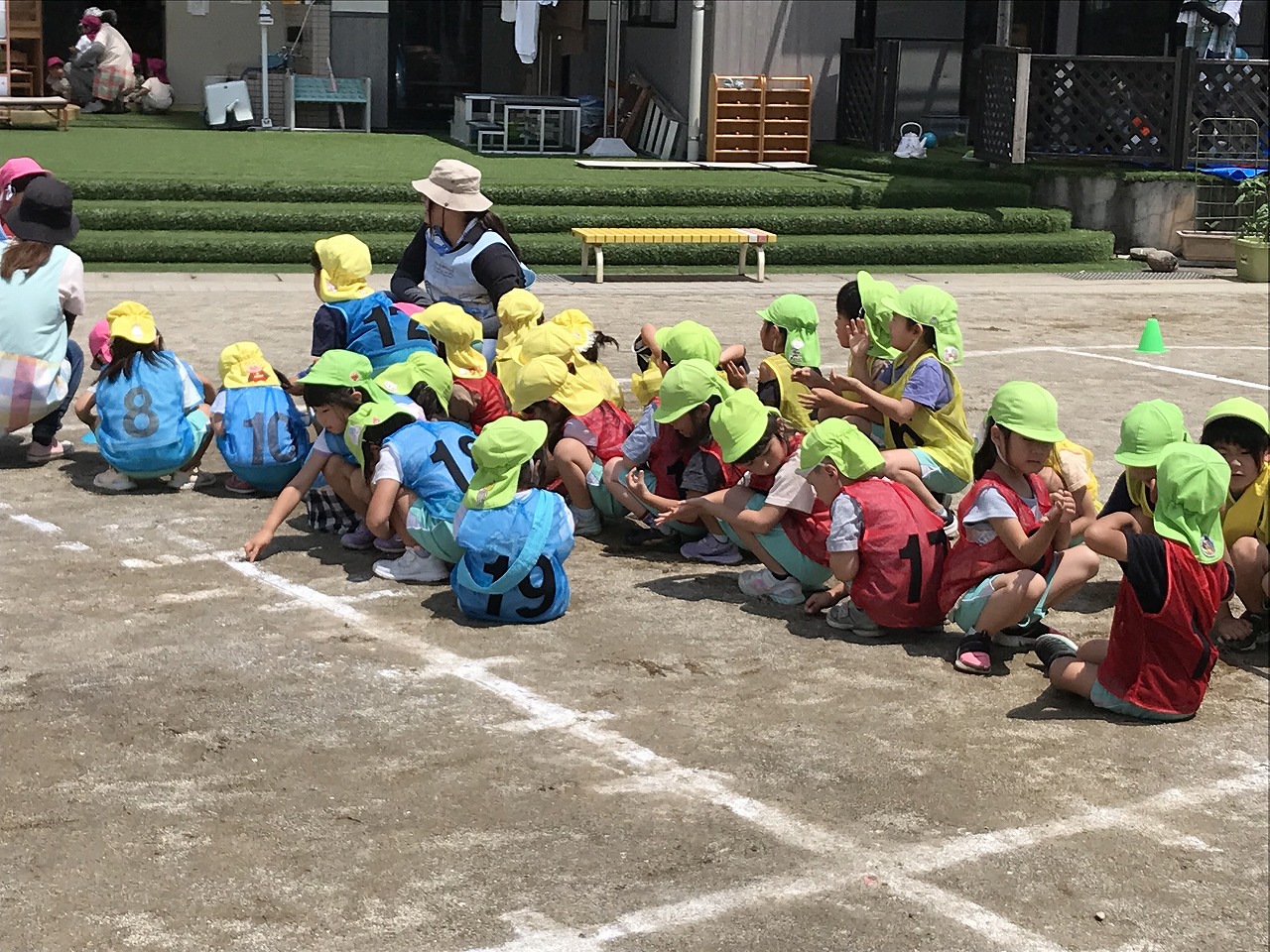 今日は、やっとお天気が良くなり、暑い中でしたが、うめ組(3歳児)・さくら組(4歳児)・もも組(5歳児)の以上児は、園庭に出て運動会の練習を元気いっぱい楽しんでいました。各クラスで競技、遊戯に取り組んだり、異年齢のグループでリレーをしたり、午後からも、もも組(5歳児)は、鼓隊の練習に一生懸命励んでいました。子どもたちのパワーは、本当に凄い!!明日は、第2リハーサルがあります。本番まで残り10日。「みんな!ガンバレー!!」