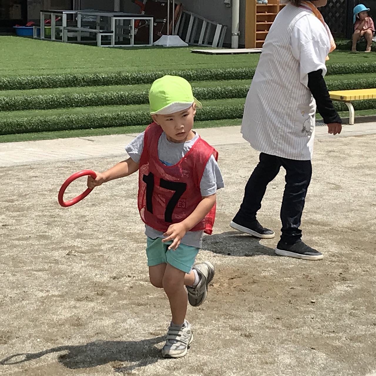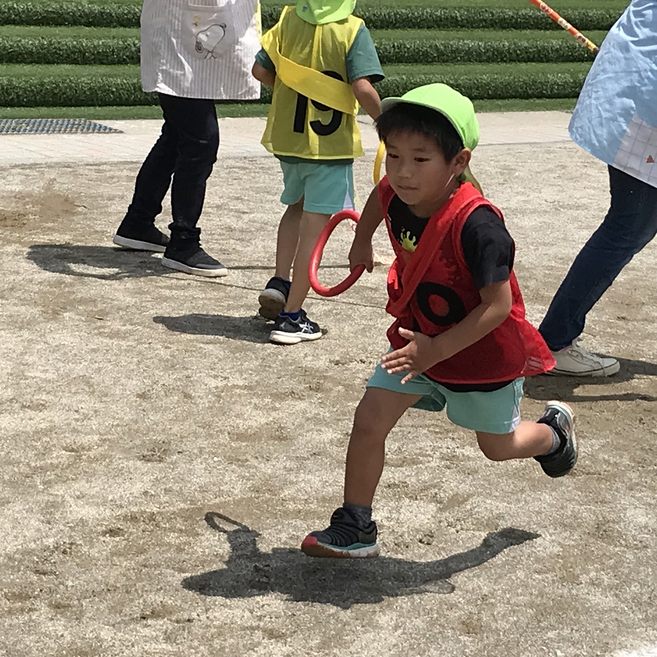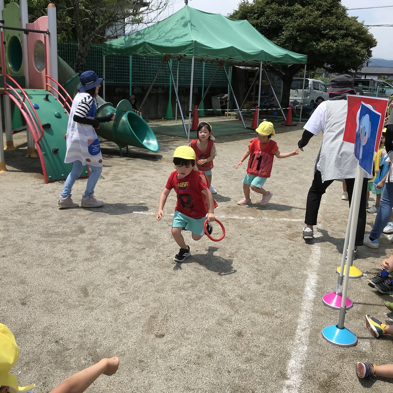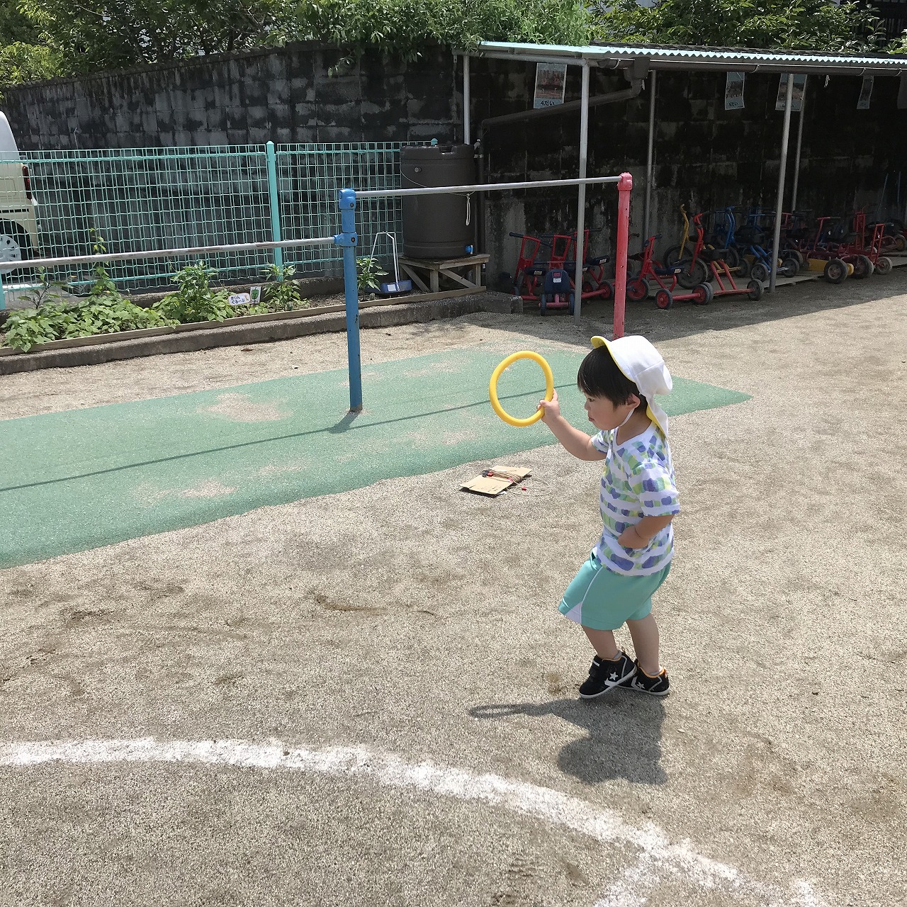 今日は、やっとお天気が良くなり、暑い中でしたが、うめ組(3歳児)・さくら組(4歳児)・もも組(5歳児)の以上児は、園庭に出て運動会の練習を元気いっぱい楽しんでいました。各クラスで競技、遊戯に取り組んだり、異年齢のグループでリレーをしたり、午後からも、もも組(5歳児)は、鼓隊の練習に一生懸命励んでいました。子どもたちのパワーは、本当に凄い!!明日は、第2リハーサルがあります。本番まで残り10日。「みんな!ガンバレー!!」
