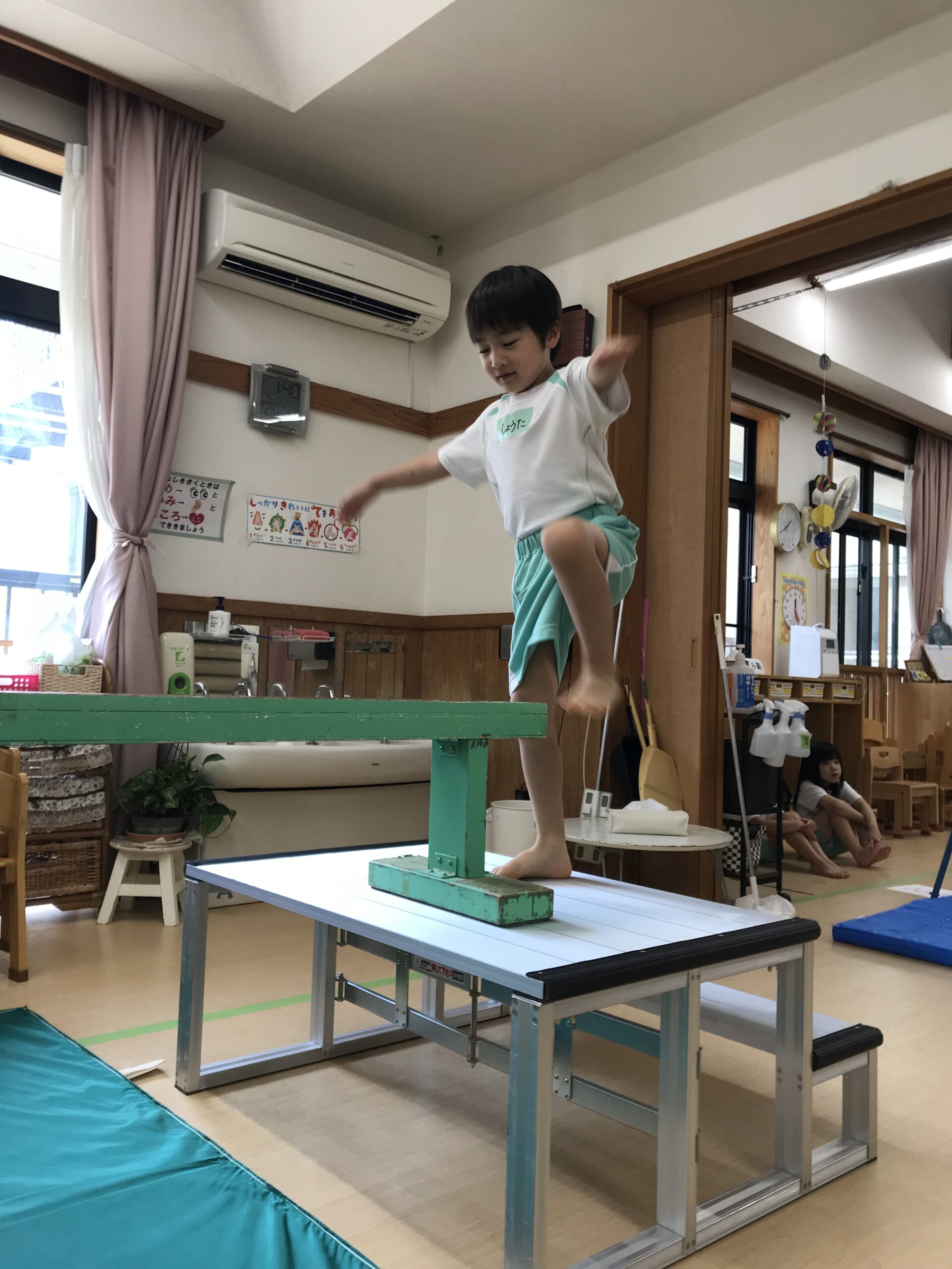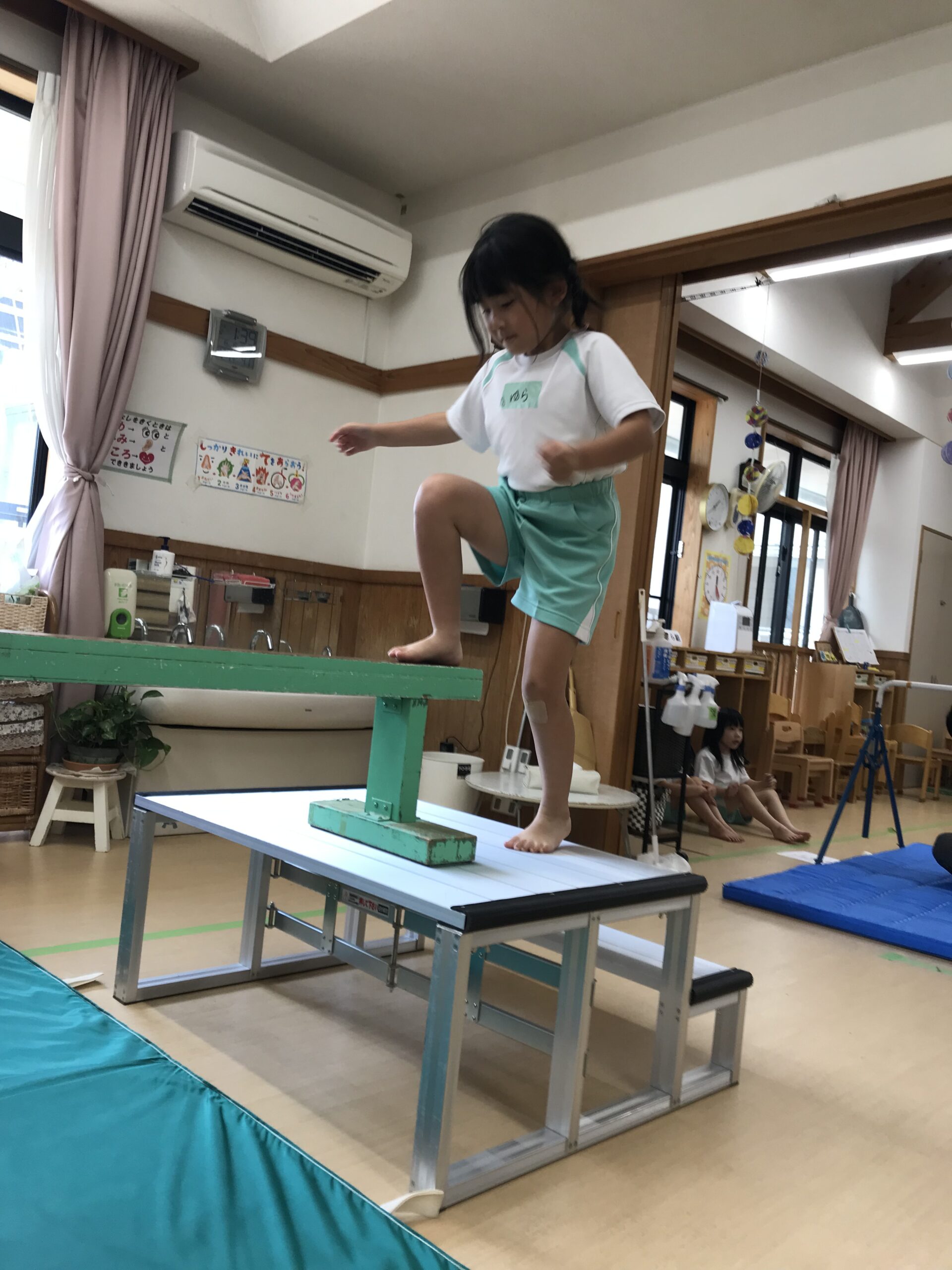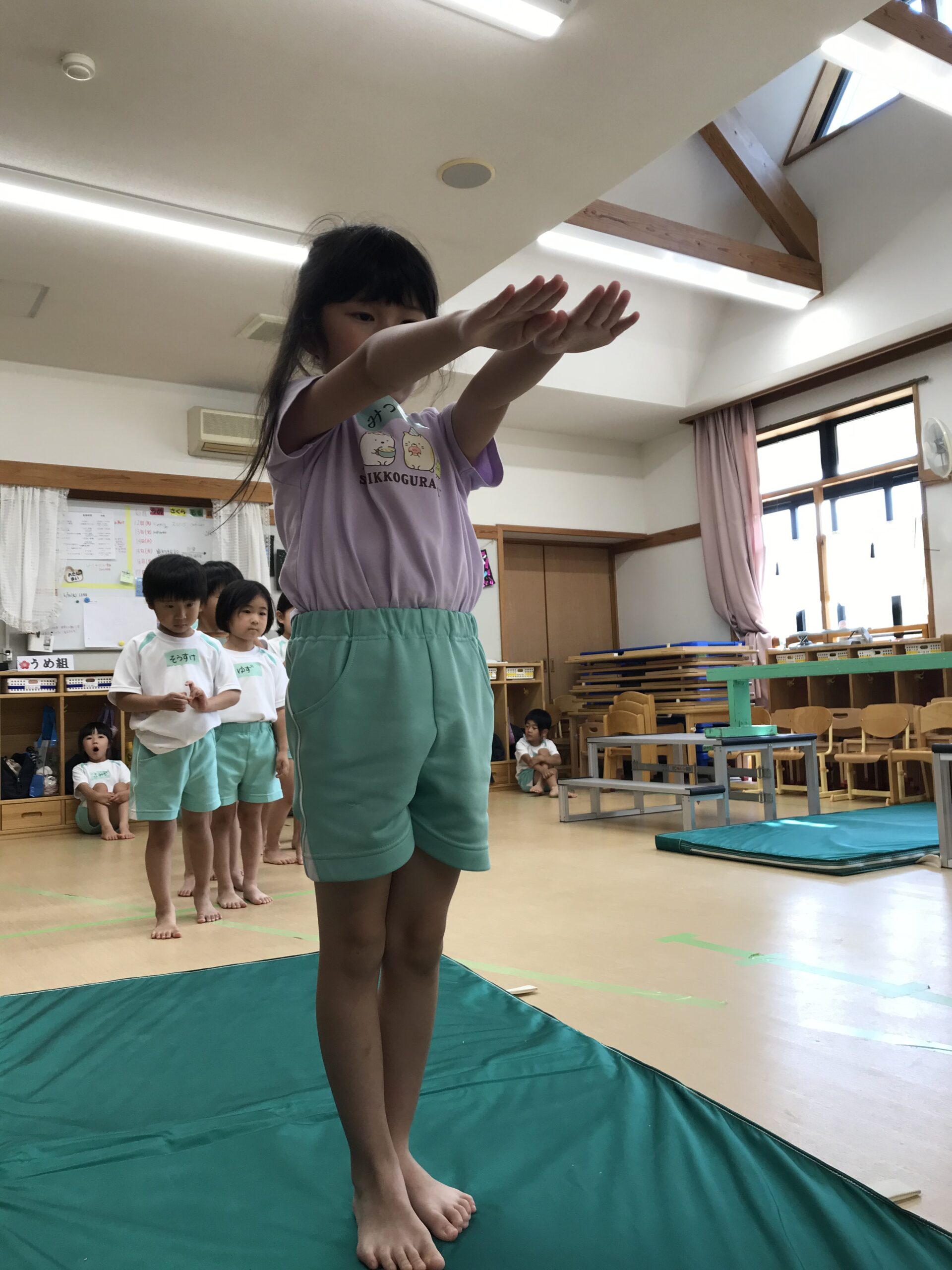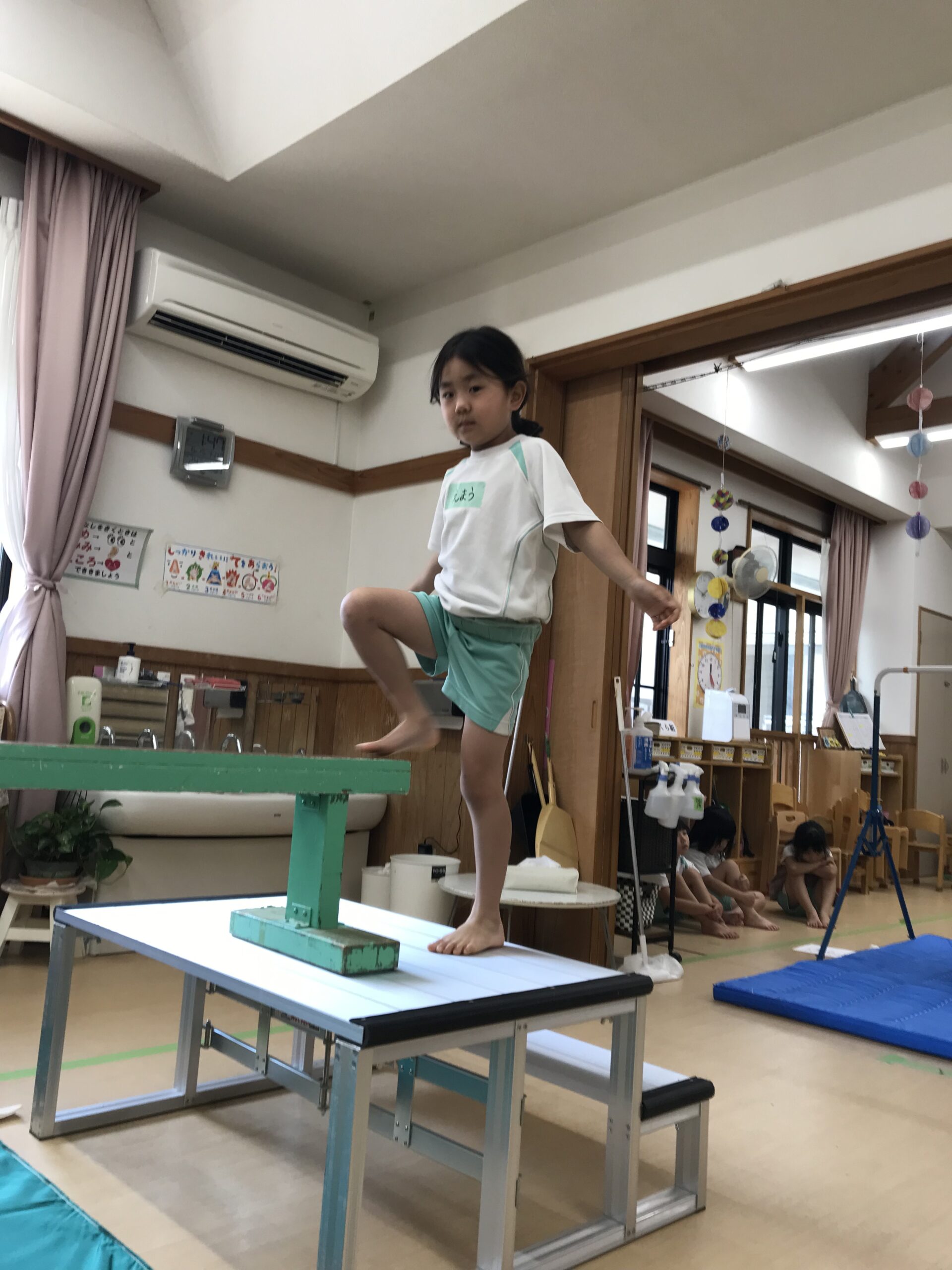 運動会まであと1日。もも組(5歳児)さんは朝から「運動会頑張りカード」を見ながらドキドキわくわく!今日も鼓隊やバルーンの練習を一生懸命頑張っていました。運動会の日が近づくとともに緊張感のあるかっこいいもも組さんの練習の様子が見られます。今日は体操教室がありました。体操教室では運動会で行う競技の「チャレンジ」の練習が行われました。逆上がりや跳び箱、縄跳びやマット運動、平均台と沢山の種目に挑戦します。練習を続けていくうちに、出来なかったことができるようになって、さらに練習を続けて技がレベルアップして…と子ども達の頑張る姿や挑戦する姿、沢山の成長が見られます。本番までもう少し。頑張れもも組(5歳児)さん!