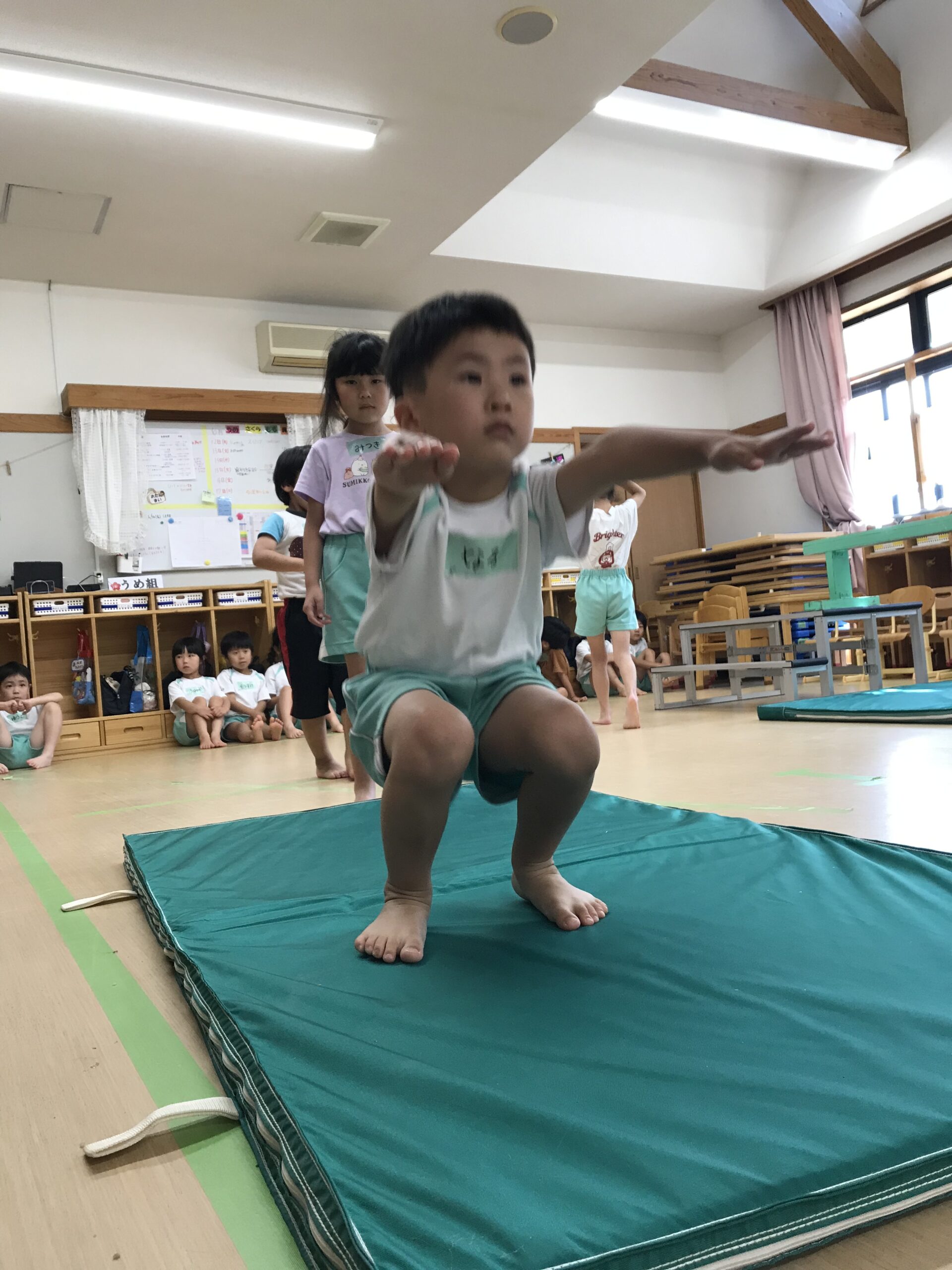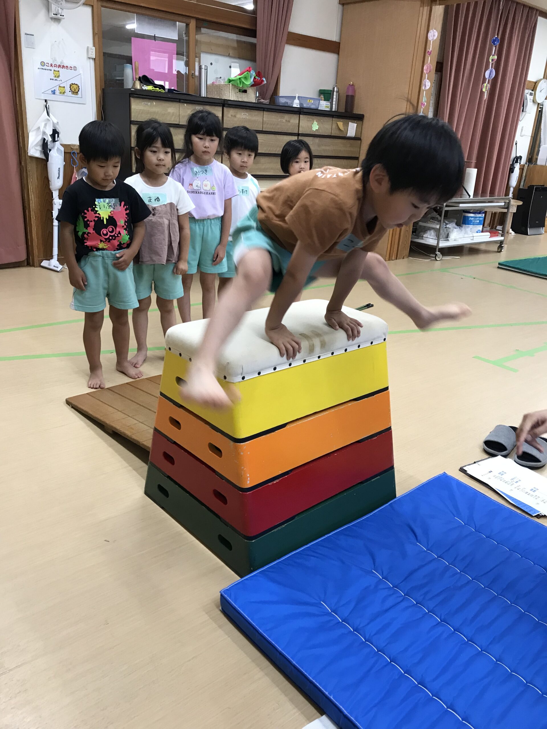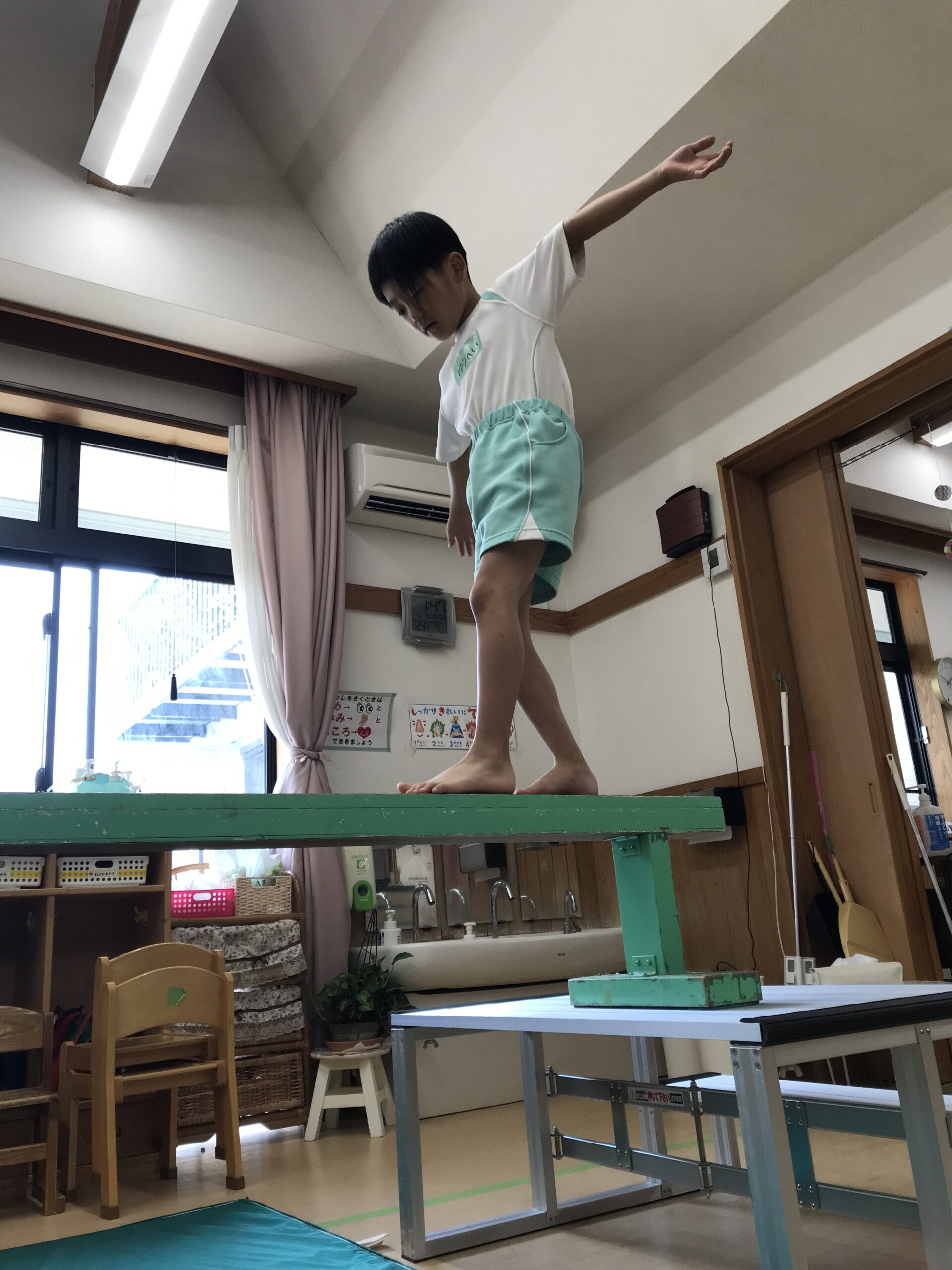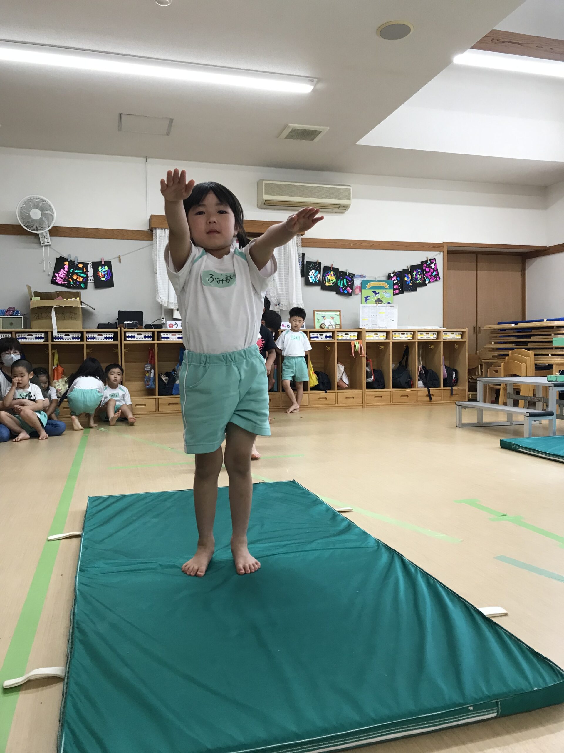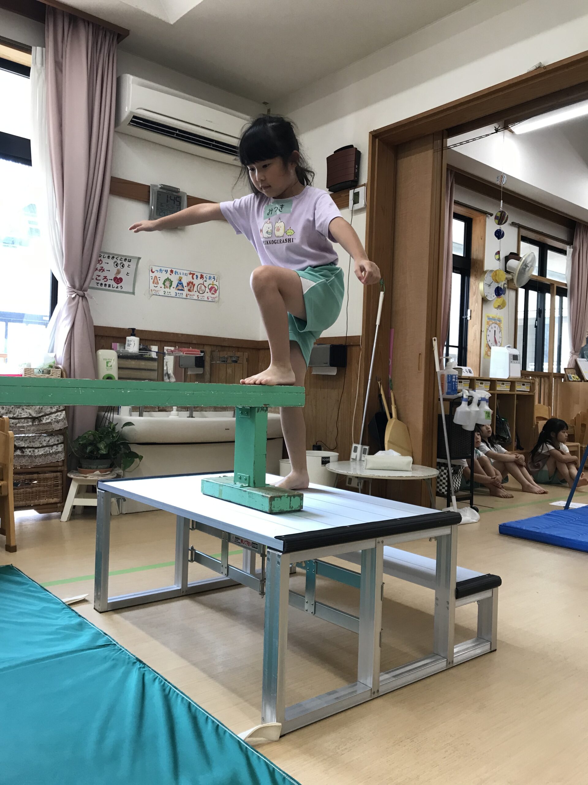 運動会まであと1日。もも組(5歳児)さんは朝から「運動会頑張りカード」を見ながらドキドキわくわく!今日も鼓隊やバルーンの練習を一生懸命頑張っていました。運動会の日が近づくとともに緊張感のあるかっこいいもも組さんの練習の様子が見られます。今日は体操教室がありました。体操教室では運動会で行う競技の「チャレンジ」の練習が行われました。逆上がりや跳び箱、縄跳びやマット運動、平均台と沢山の種目に挑戦します。練習を続けていくうちに、出来なかったことができるようになって、さらに練習を続けて技がレベルアップして…と子ども達の頑張る姿や挑戦する姿、沢山の成長が見られます。本番までもう少し。頑張れもも組(5歳児)さん!