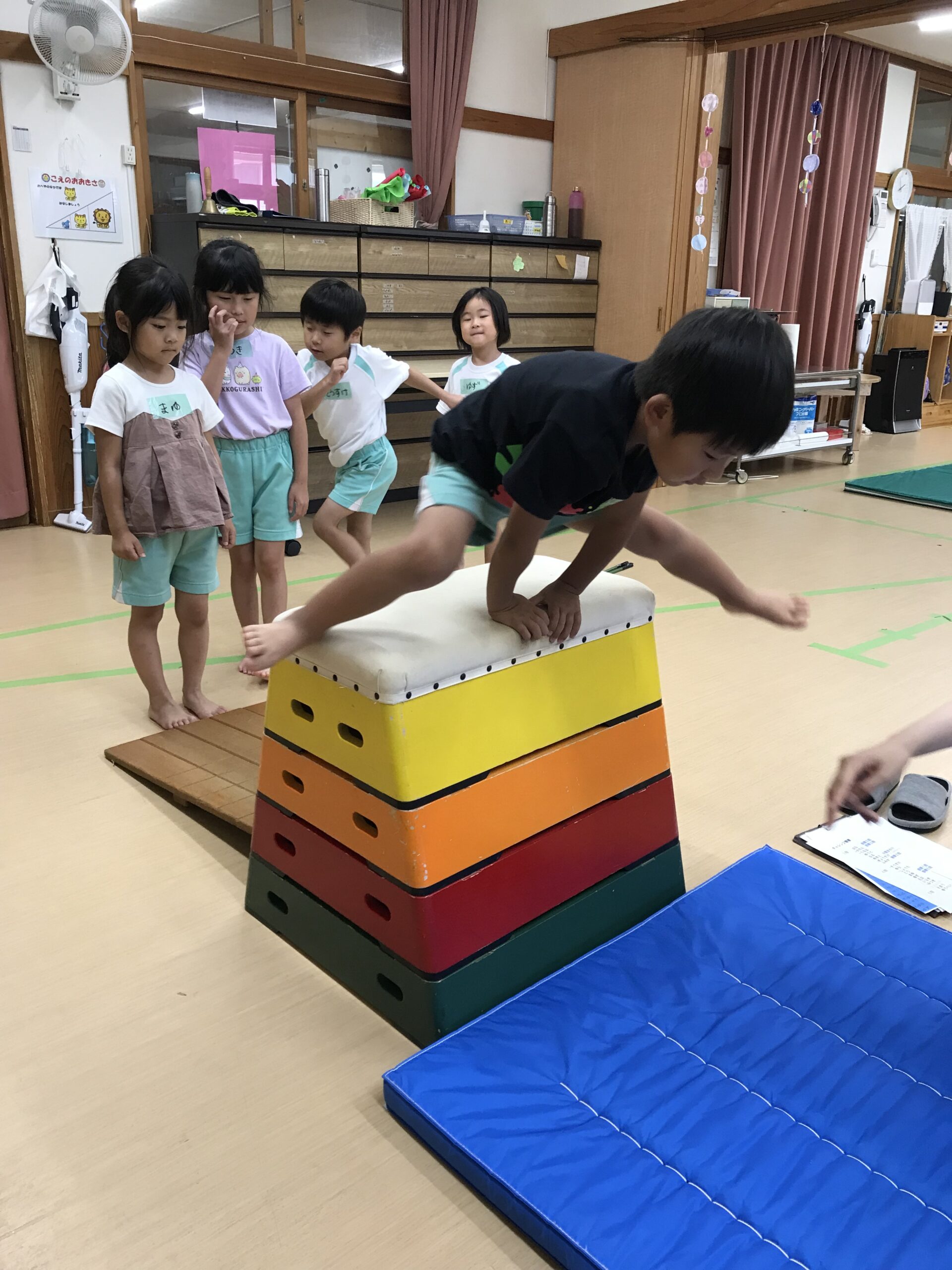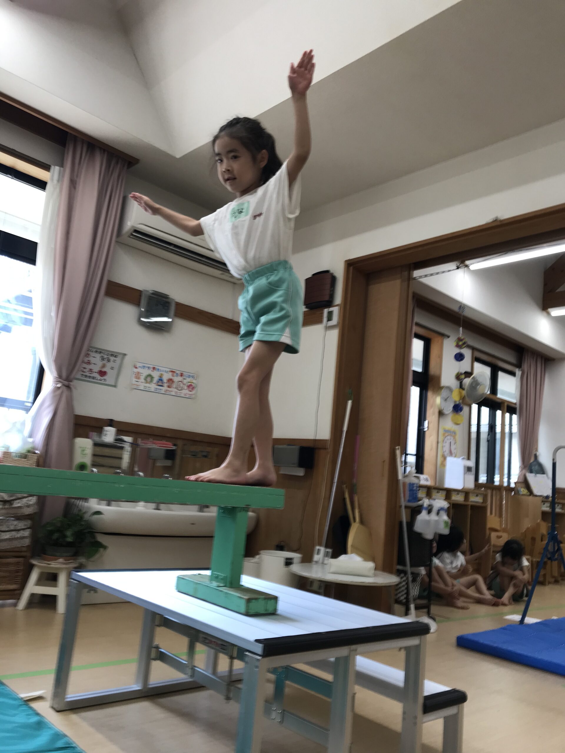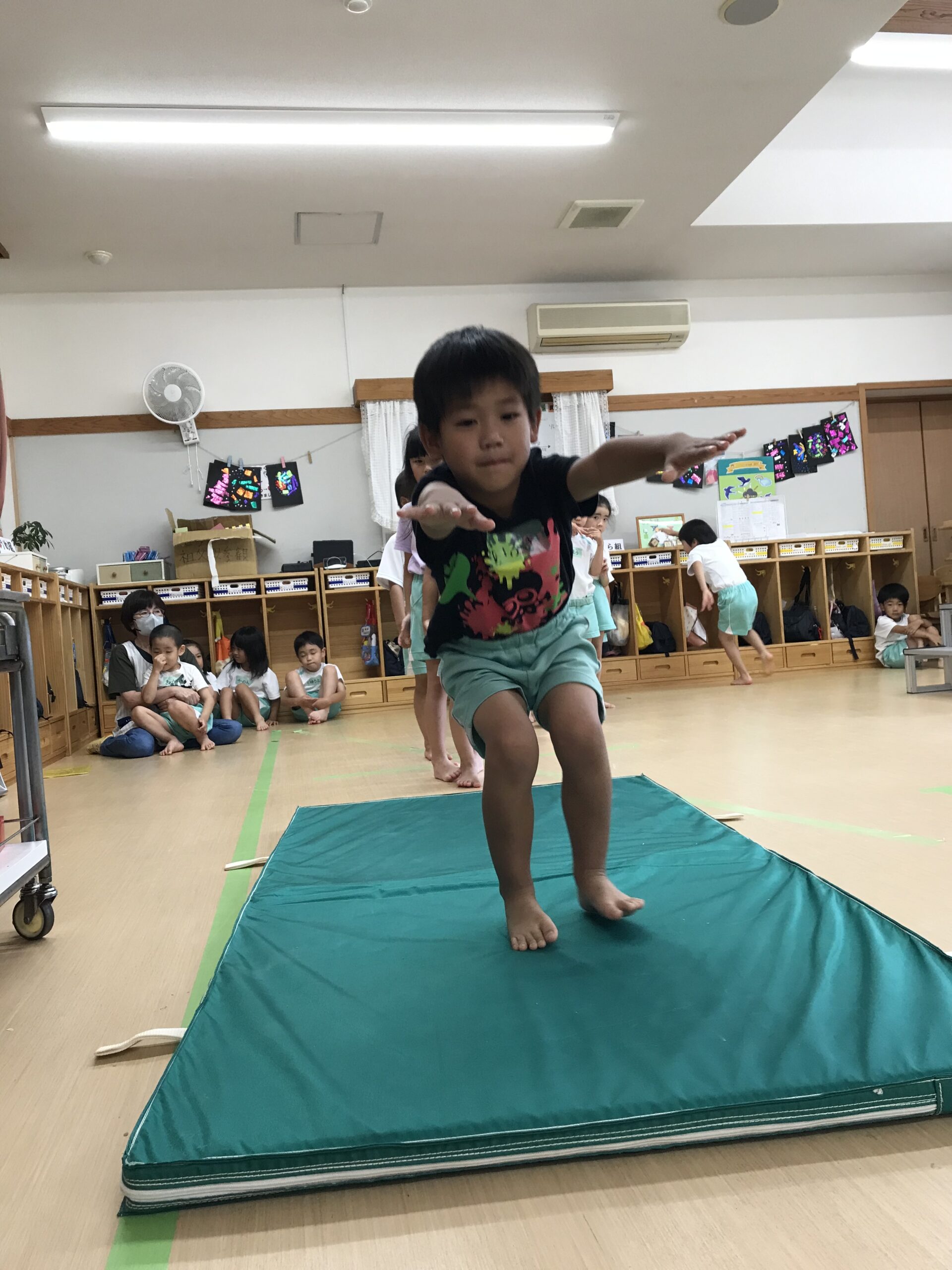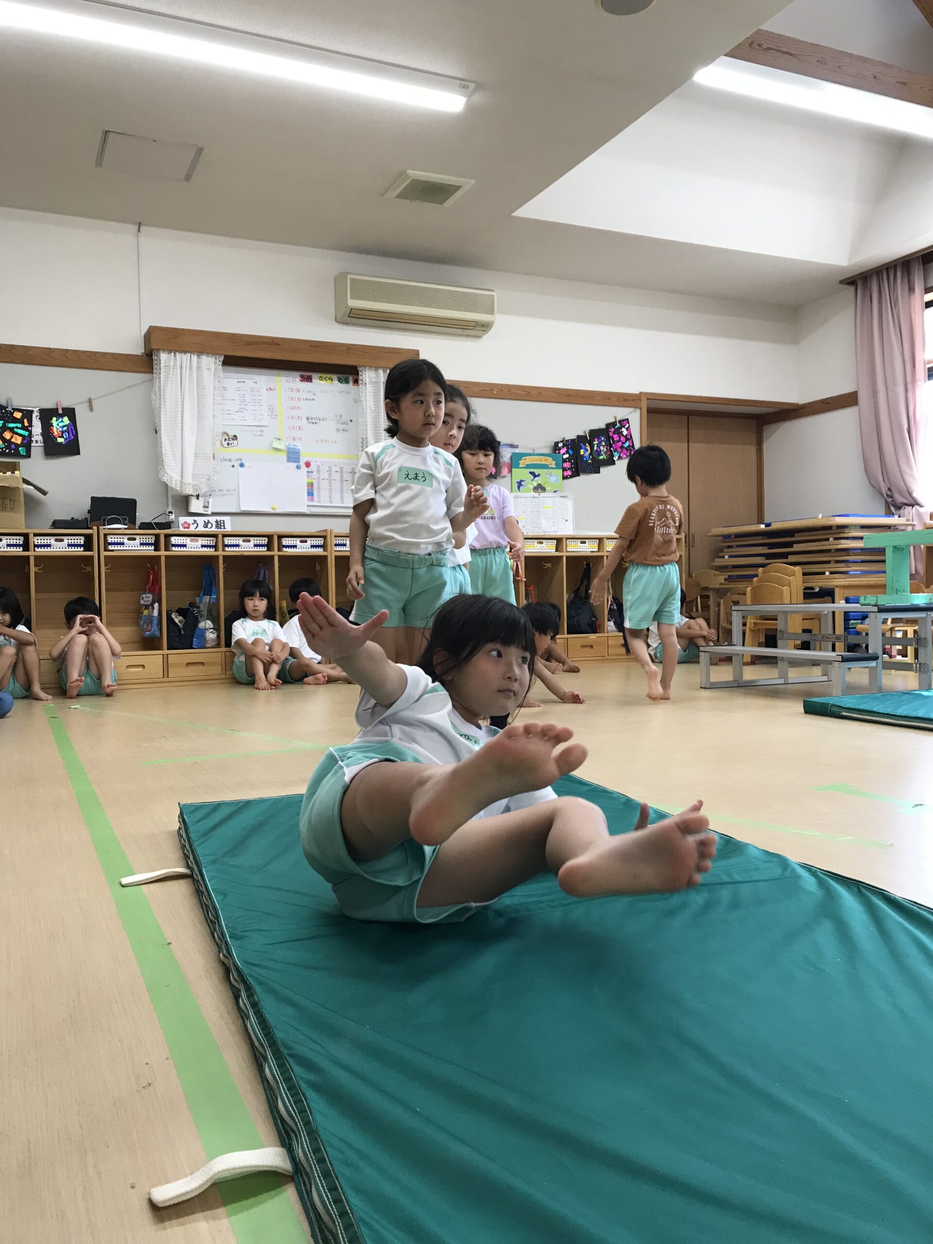 運動会まであと1日。もも組(5歳児)さんは朝から「運動会頑張りカード」を見ながらドキドキわくわく!今日も鼓隊やバルーンの練習を一生懸命頑張っていました。運動会の日が近づくとともに緊張感のあるかっこいいもも組さんの練習の様子が見られます。今日は体操教室がありました。体操教室では運動会で行う競技の「チャレンジ」の練習が行われました。逆上がりや跳び箱、縄跳びやマット運動、平均台と沢山の種目に挑戦します。練習を続けていくうちに、出来なかったことができるようになって、さらに練習を続けて技がレベルアップして…と子ども達の頑張る姿や挑戦する姿、沢山の成長が見られます。本番までもう少し。頑張れもも組(5歳児)さん!