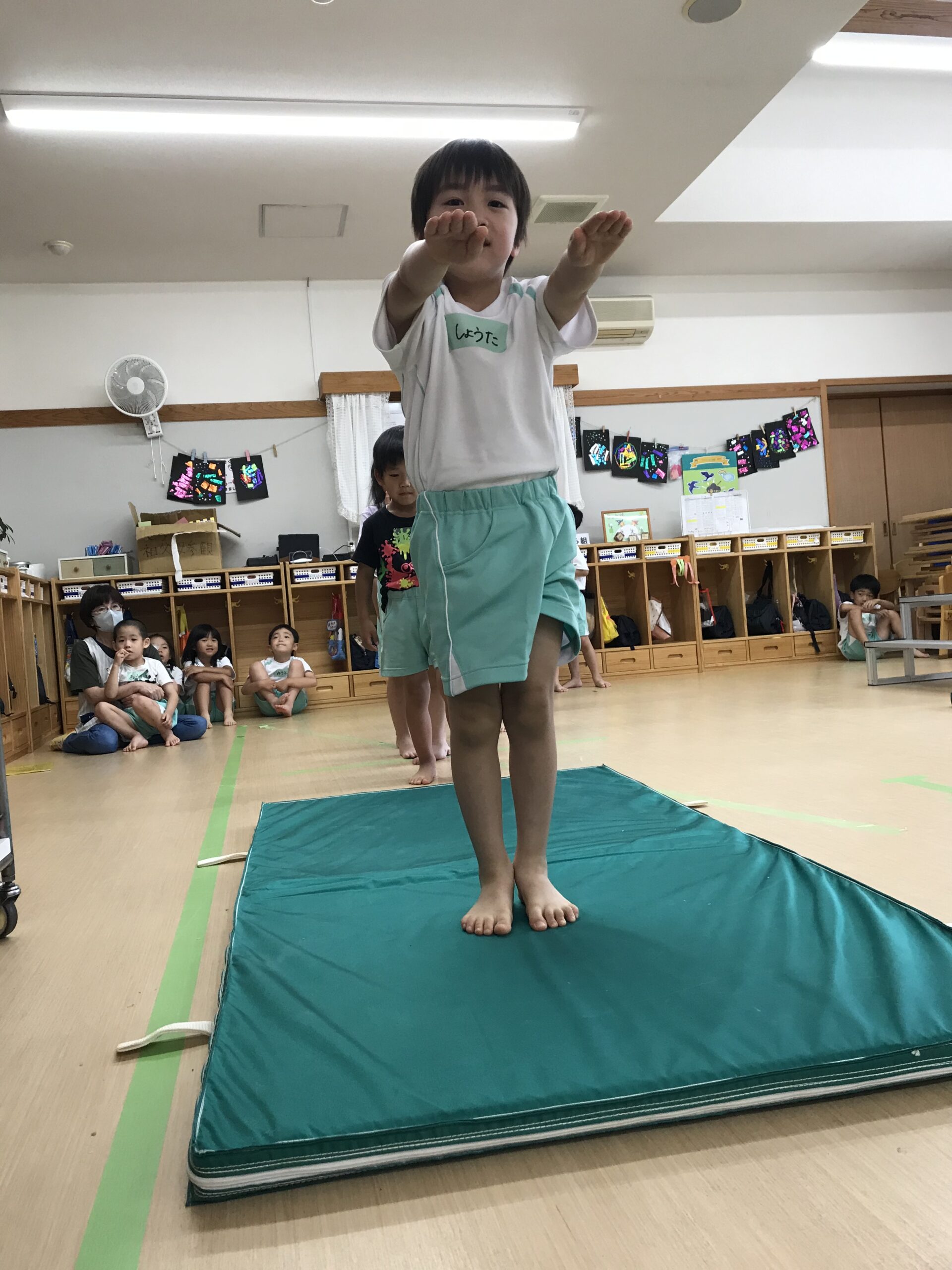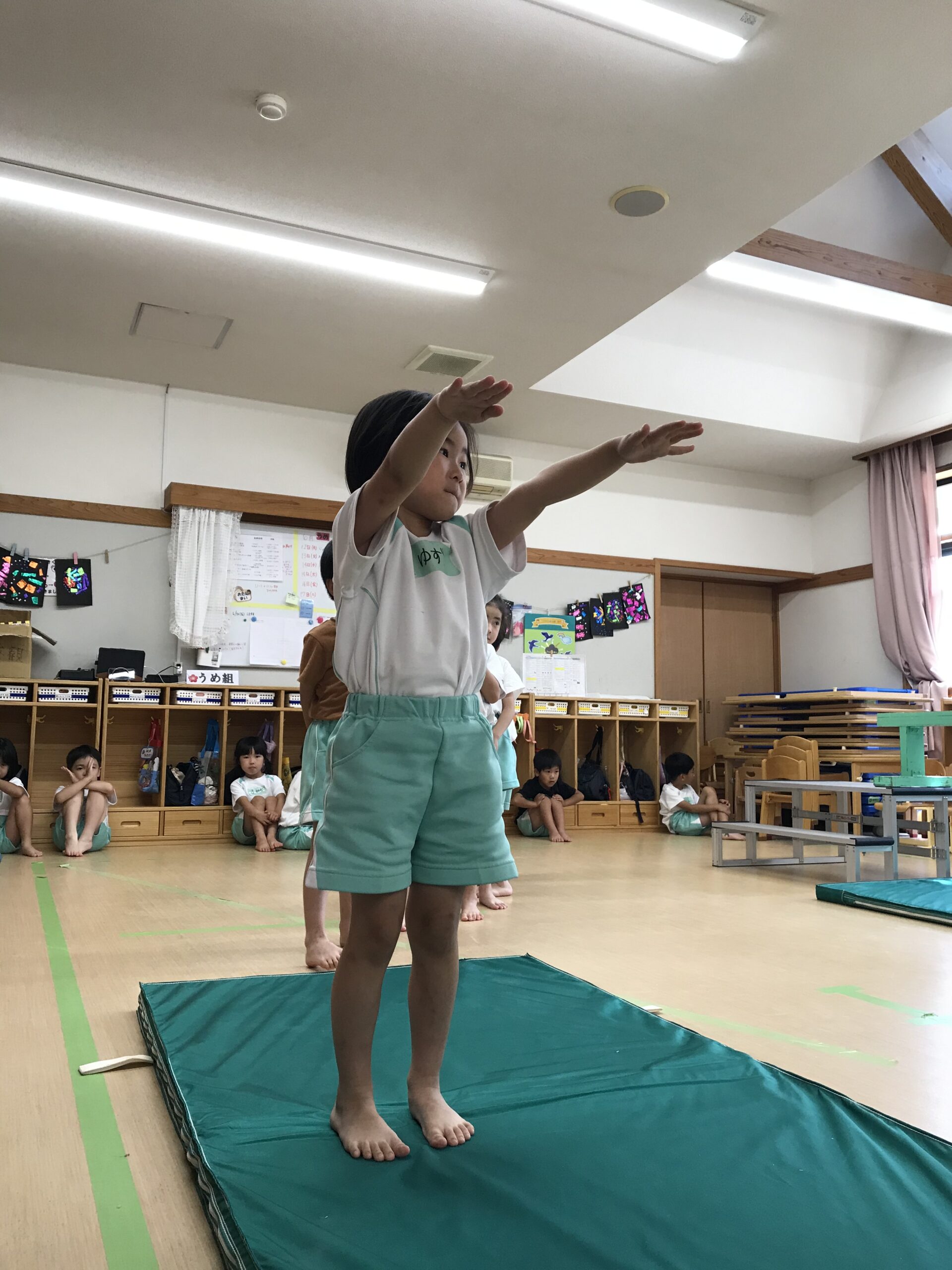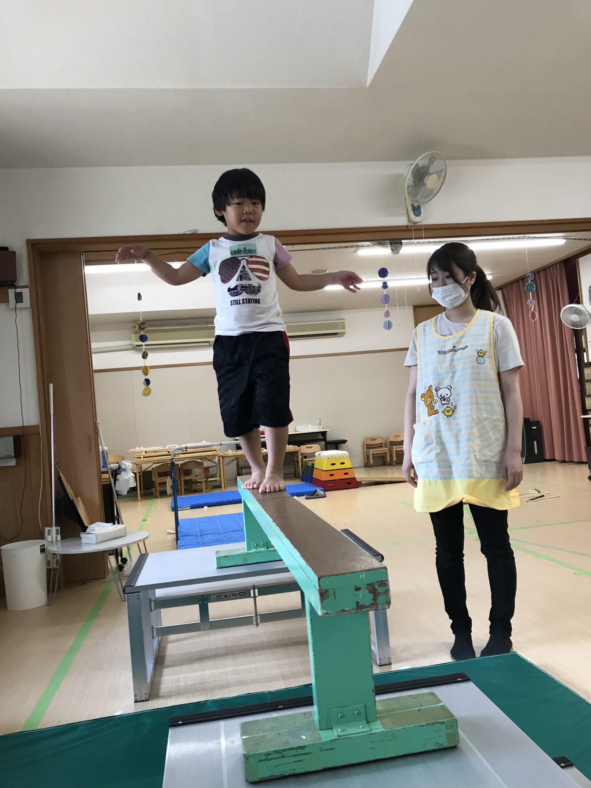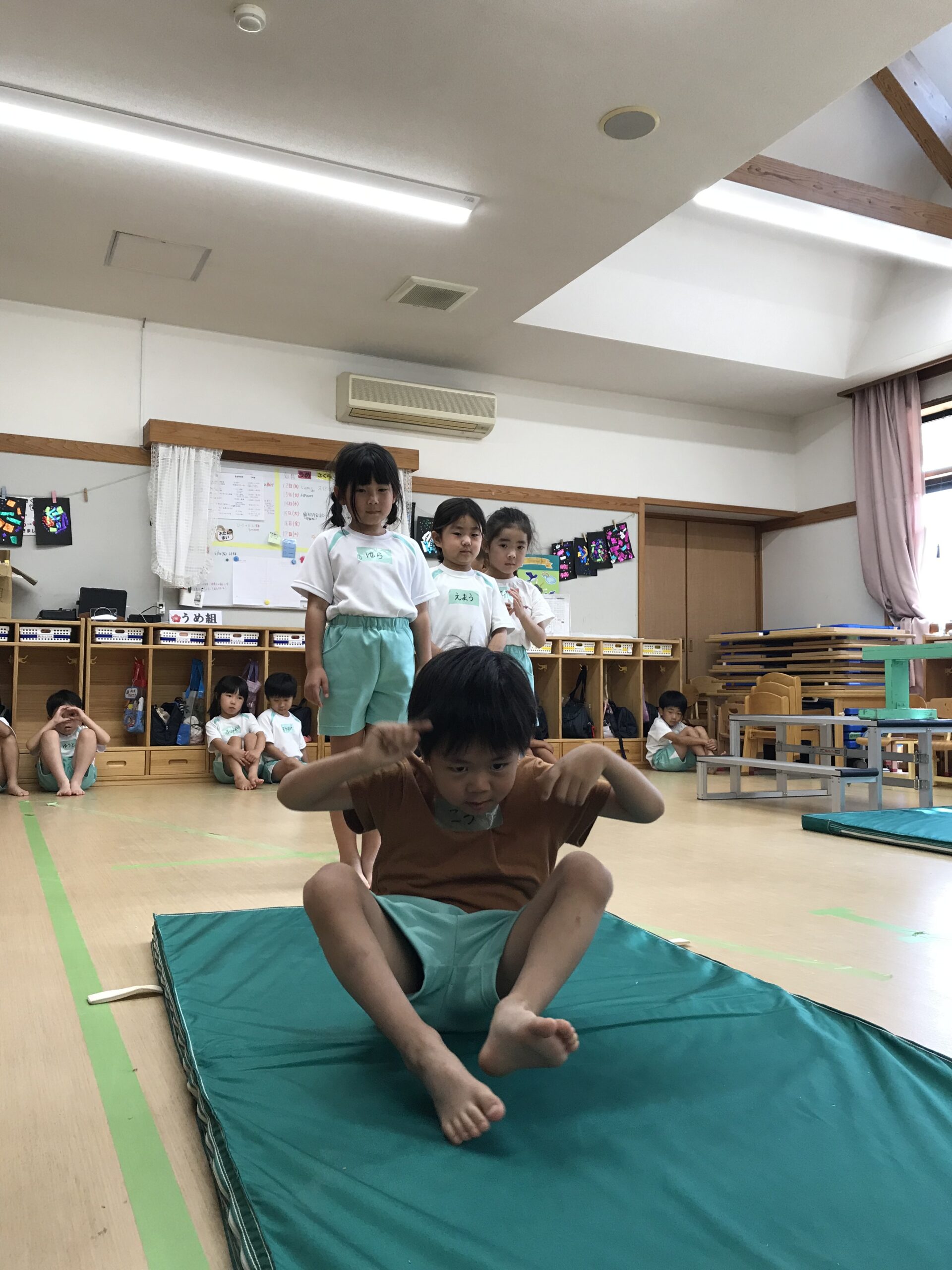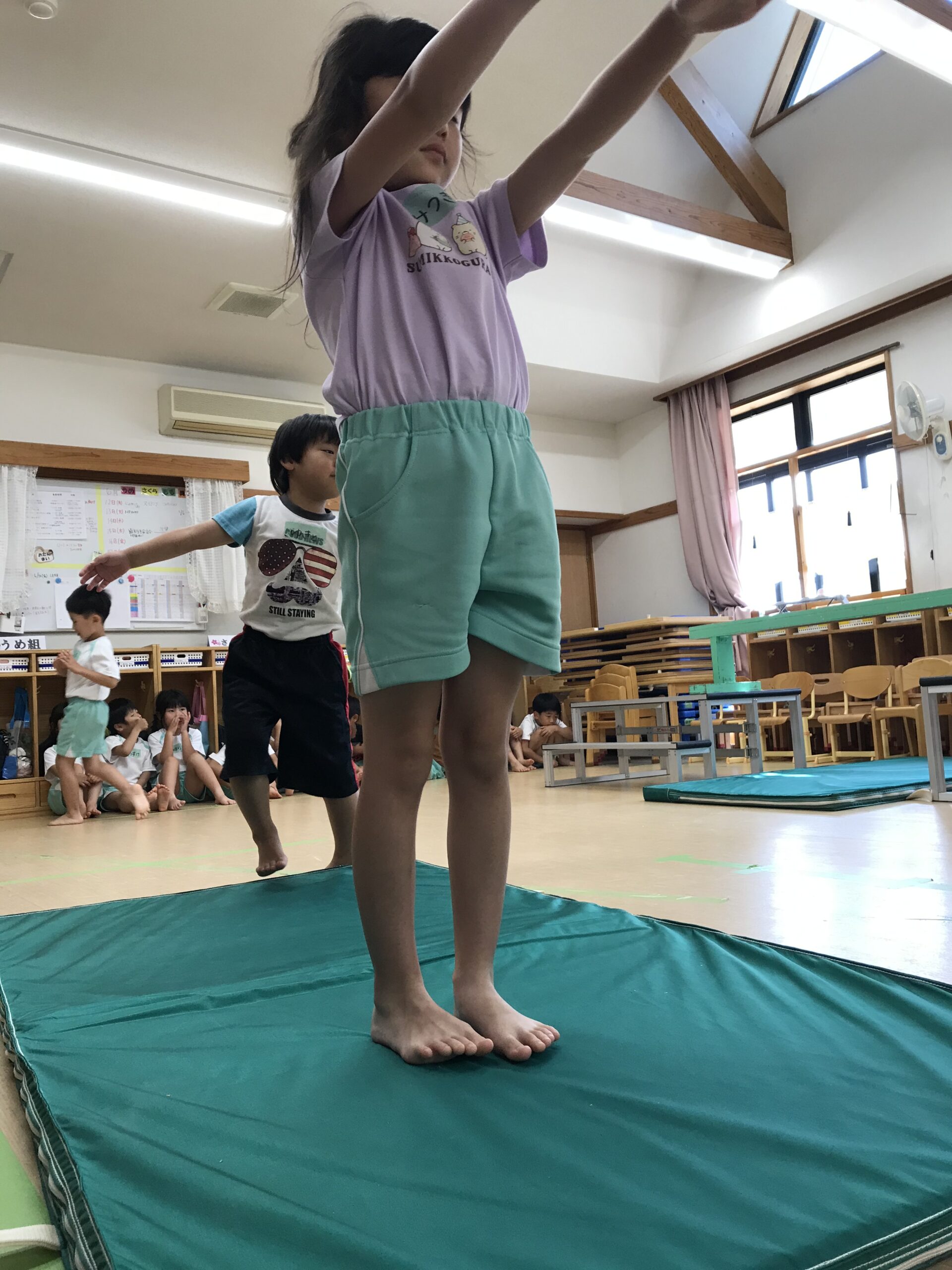 運動会まであと1日。もも組(5歳児)さんは朝から「運動会頑張りカード」を見ながらドキドキわくわく!今日も鼓隊やバルーンの練習を一生懸命頑張っていました。運動会の日が近づくとともに緊張感のあるかっこいいもも組さんの練習の様子が見られます。今日は体操教室がありました。体操教室では運動会で行う競技の「チャレンジ」の練習が行われました。逆上がりや跳び箱、縄跳びやマット運動、平均台と沢山の種目に挑戦します。練習を続けていくうちに、出来なかったことができるようになって、さらに練習を続けて技がレベルアップして…と子ども達の頑張る姿や挑戦する姿、沢山の成長が見られます。本番までもう少し。頑張れもも組(5歳児)さん!