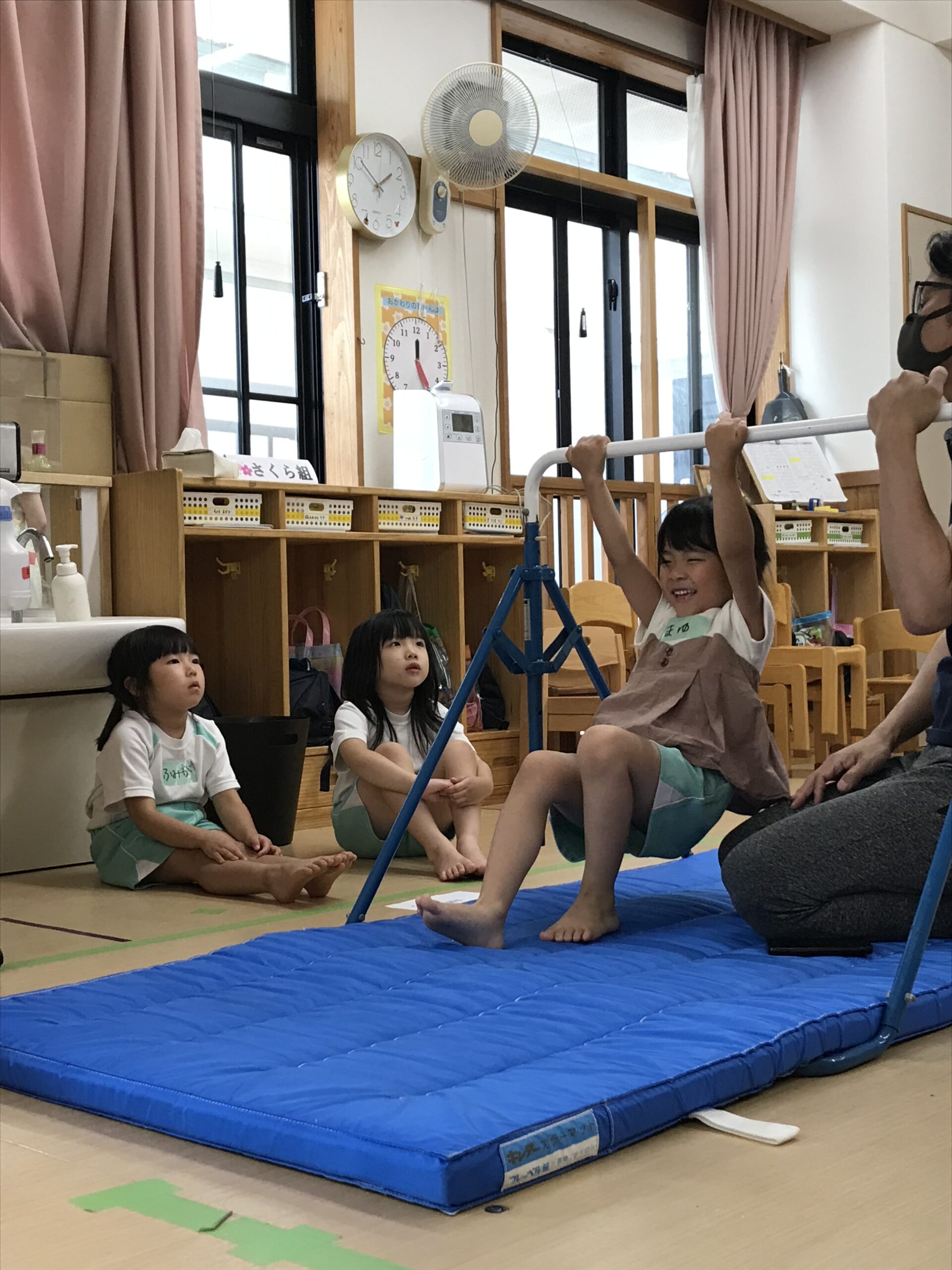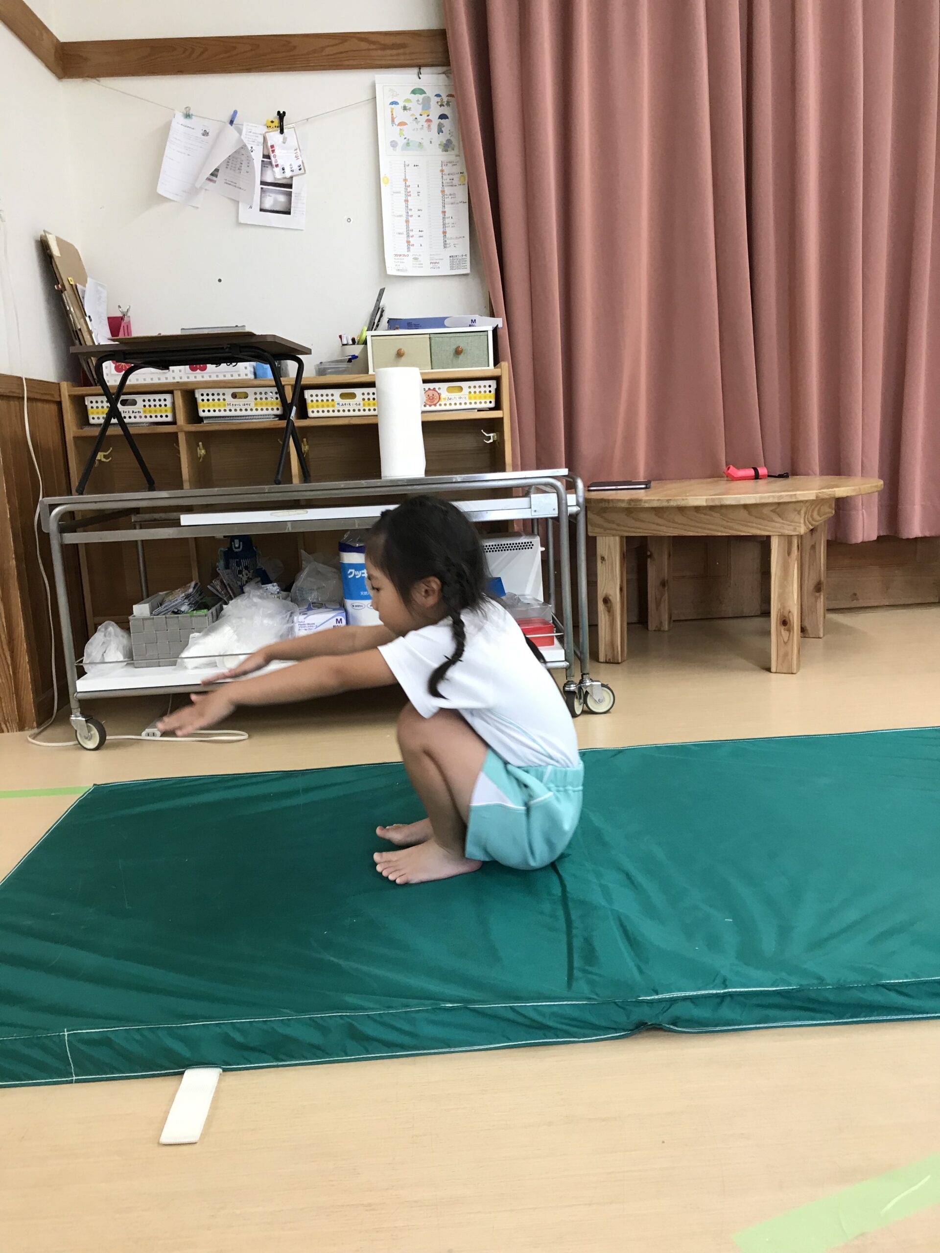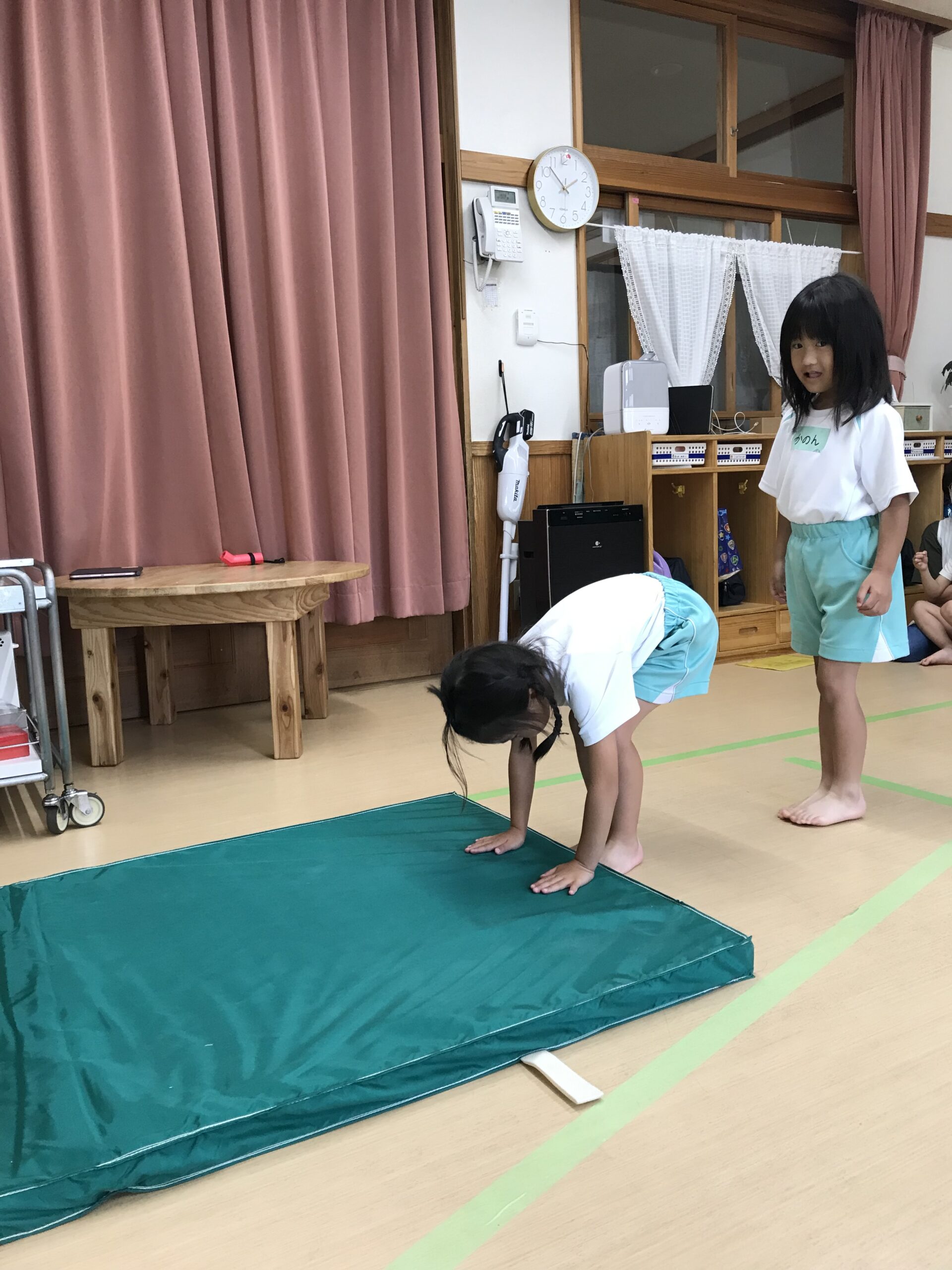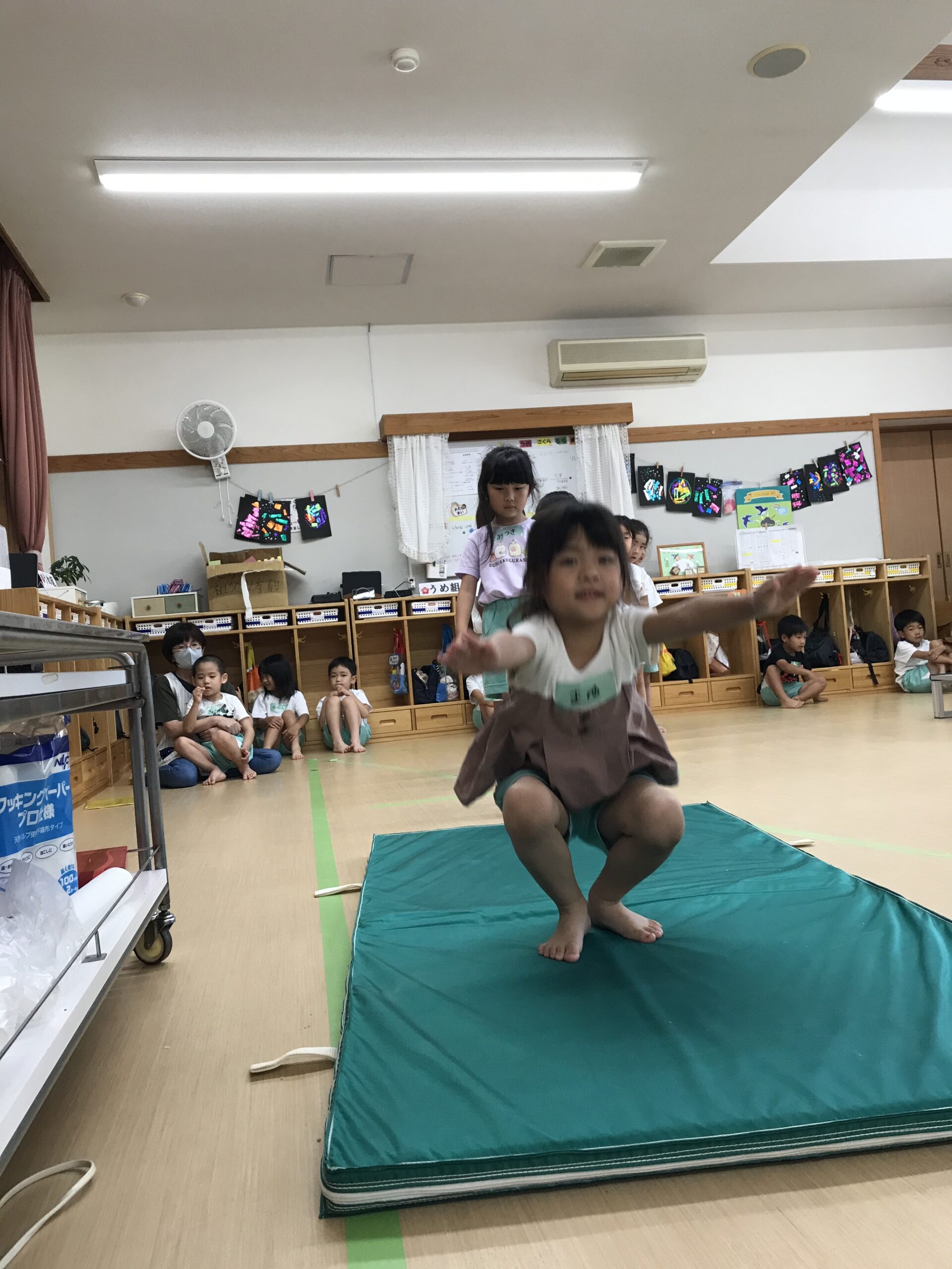 運動会まであと1日。もも組(5歳児)さんは朝から「運動会頑張りカード」を見ながらドキドキわくわく!今日も鼓隊やバルーンの練習を一生懸命頑張っていました。運動会の日が近づくとともに緊張感のあるかっこいいもも組さんの練習の様子が見られます。今日は体操教室がありました。体操教室では運動会で行う競技の「チャレンジ」の練習が行われました。逆上がりや跳び箱、縄跳びやマット運動、平均台と沢山の種目に挑戦します。練習を続けていくうちに、出来なかったことができるようになって、さらに練習を続けて技がレベルアップして…と子ども達の頑張る姿や挑戦する姿、沢山の成長が見られます。本番までもう少し。頑張れもも組(5歳児)さん!
