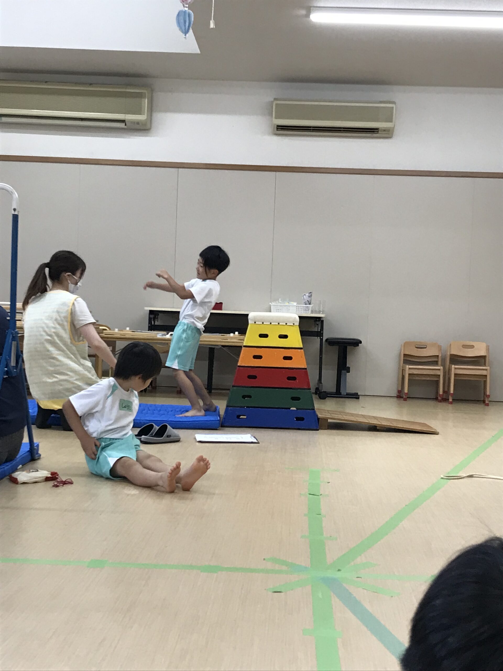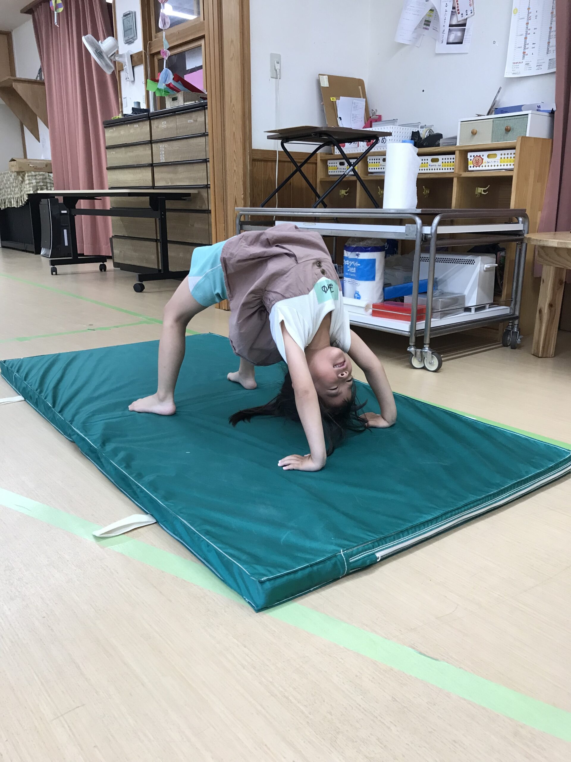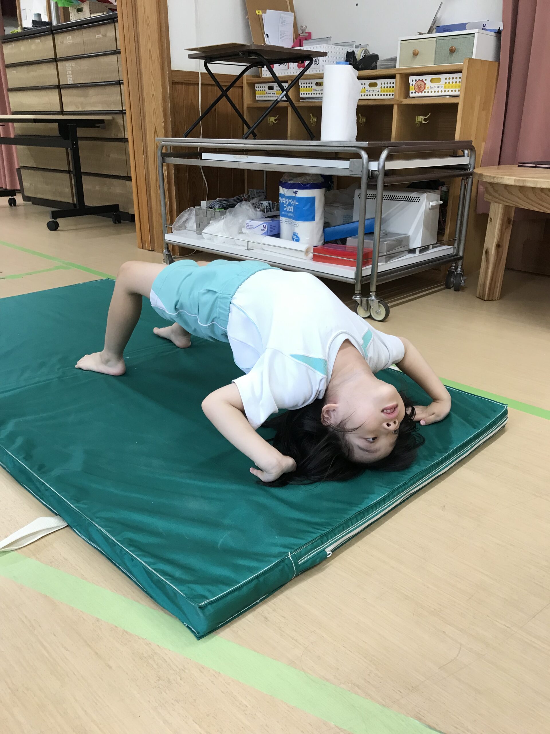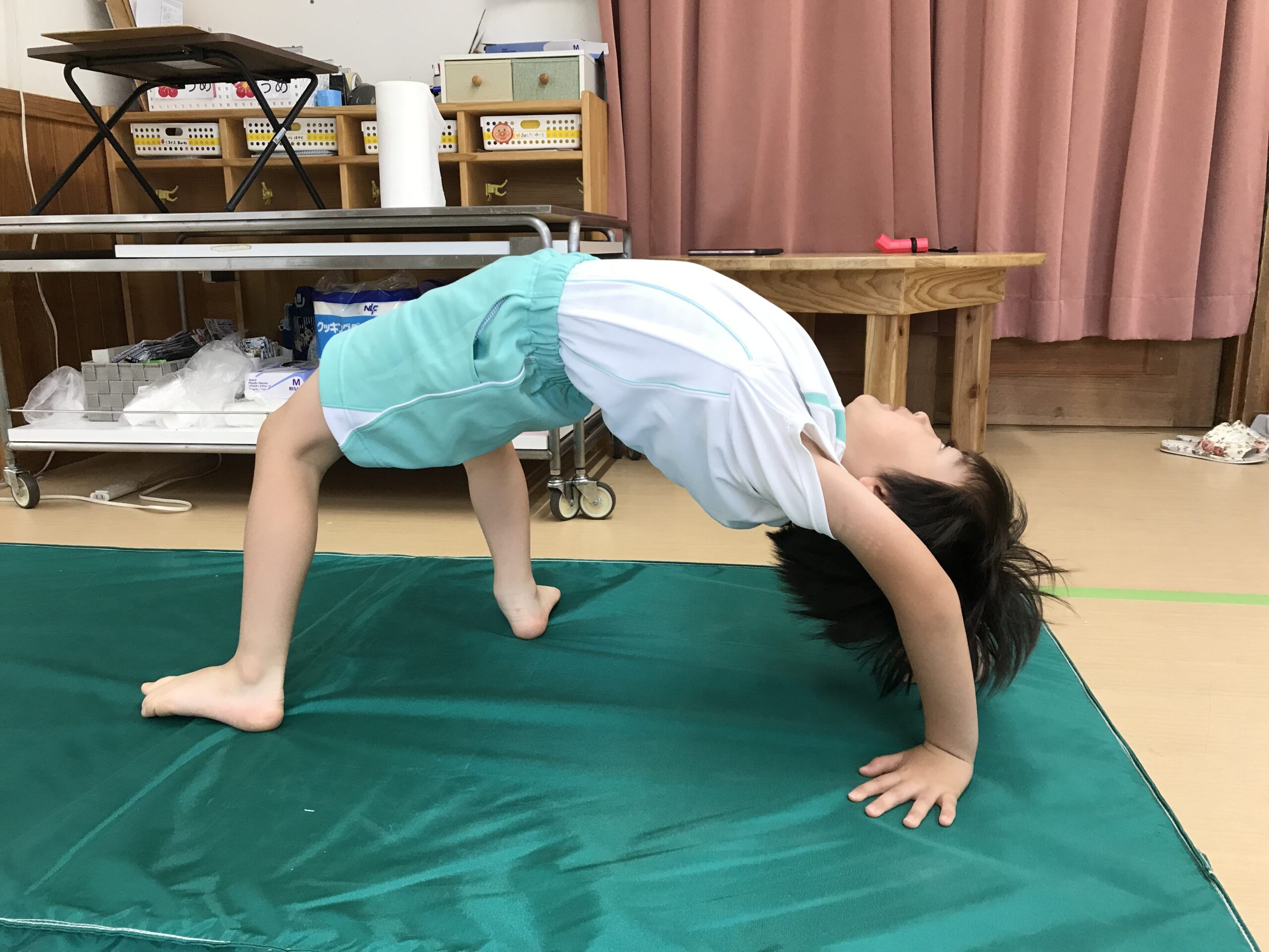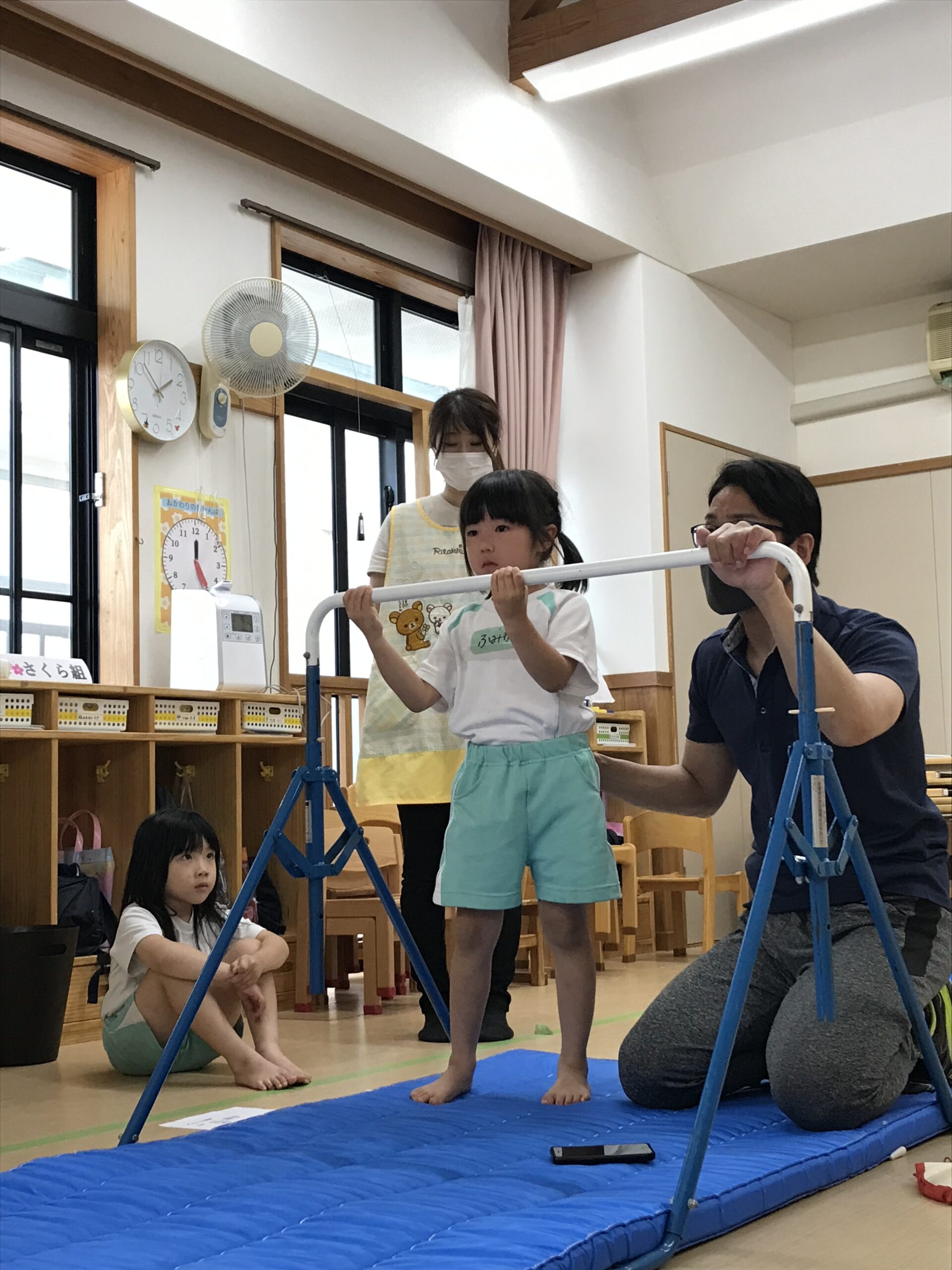 運動会まであと1日。もも組(5歳児)さんは朝から「運動会頑張りカード」を見ながらドキドキわくわく!今日も鼓隊やバルーンの練習を一生懸命頑張っていました。運動会の日が近づくとともに緊張感のあるかっこいいもも組さんの練習の様子が見られます。今日は体操教室がありました。体操教室では運動会で行う競技の「チャレンジ」の練習が行われました。逆上がりや跳び箱、縄跳びやマット運動、平均台と沢山の種目に挑戦します。練習を続けていくうちに、出来なかったことができるようになって、さらに練習を続けて技がレベルアップして…と子ども達の頑張る姿や挑戦する姿、沢山の成長が見られます。本番までもう少し。頑張れもも組(5歳児)さん!