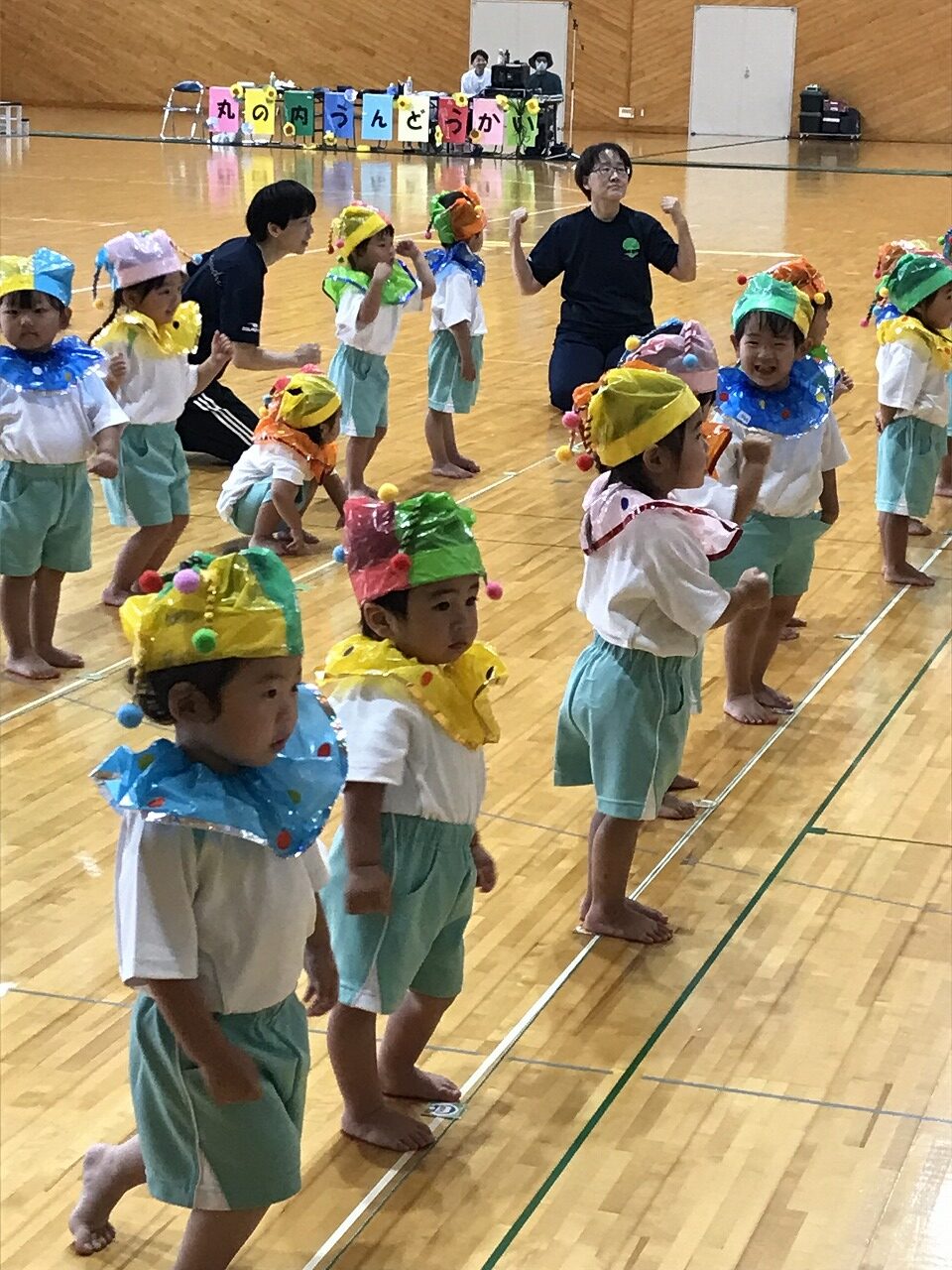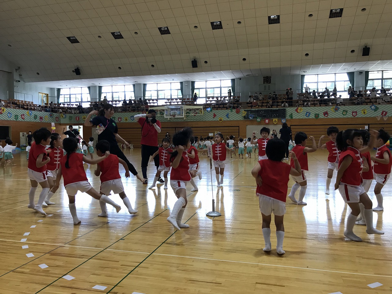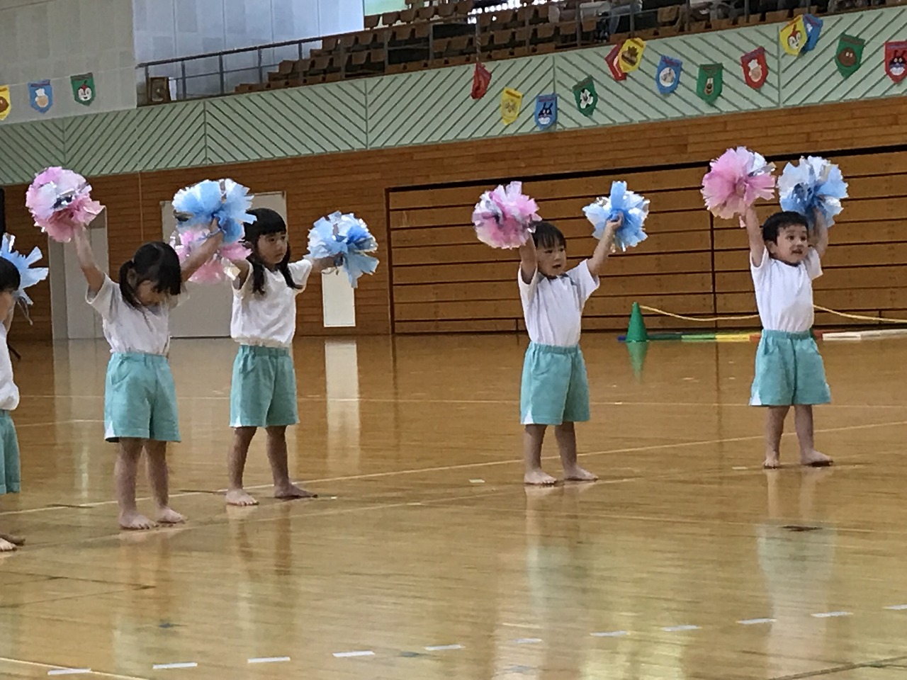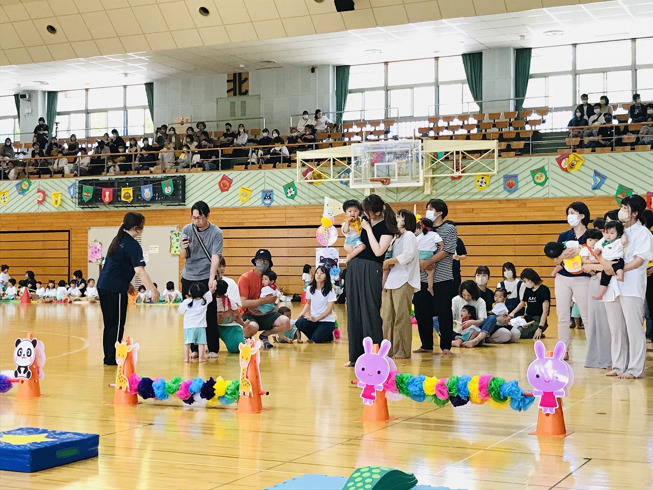 17日土曜日は総合体育館で運動会がありました。入園、進級してすぐの運動会、練習の期間も短く、梅雨入りしたり暑かったり…その中でも子ども達が楽しく取り組み、お家の方に見てもらうのを楽しみにがんばってきました。もも組(5歳児)は最後の運動会、かっこいい衣装を着ての入場や、バルーン等々、とても感動しました。0,1歳児はお家の方と一緒でうれしそうな様子が見られました。2歳からは、リズムやかけっこ最後までがんばりましたね。みんなキラキラ輝いていた運動会でした。