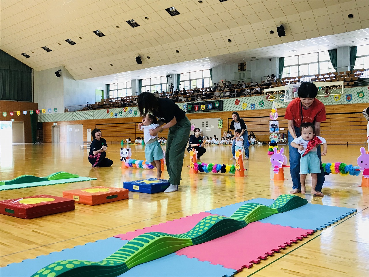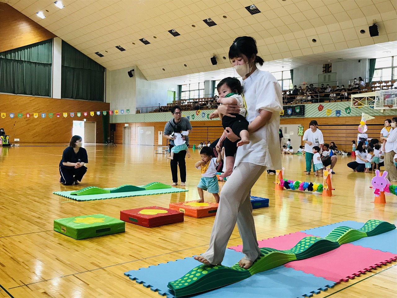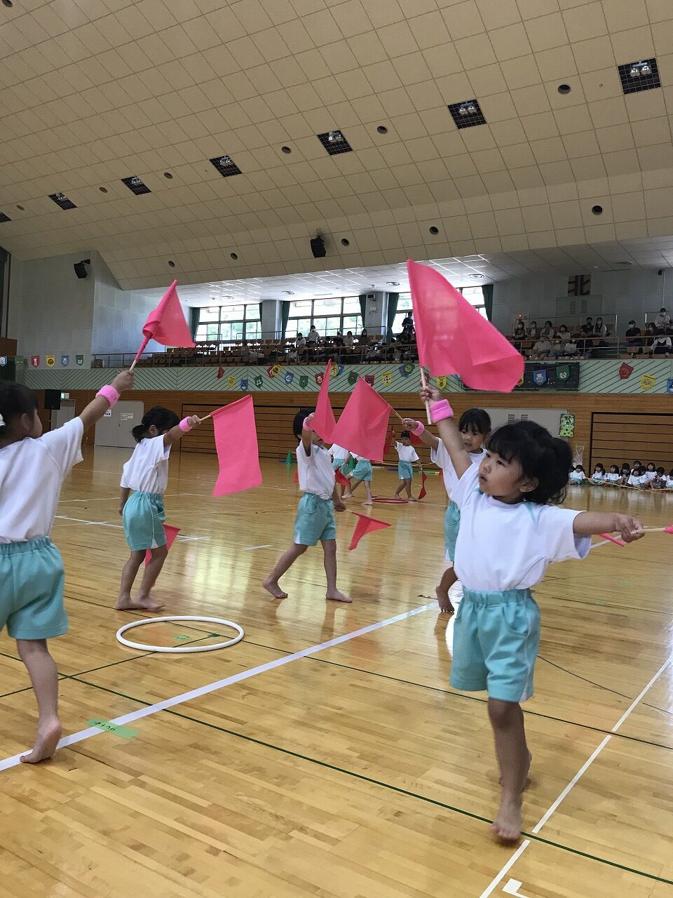 17日土曜日は総合体育館で運動会がありました。入園、進級してすぐの運動会、練習の期間も短く、梅雨入りしたり暑かったり…その中でも子ども達が楽しく取り組み、お家の方に見てもらうのを楽しみにがんばってきました。もも組(5歳児)は最後の運動会、かっこいい衣装を着ての入場や、バルーン等々、とても感動しました。0,1歳児はお家の方と一緒でうれしそうな様子が見られました。2歳からは、リズムやかけっこ最後までがんばりましたね。みんなキラキラ輝いていた運動会でした。