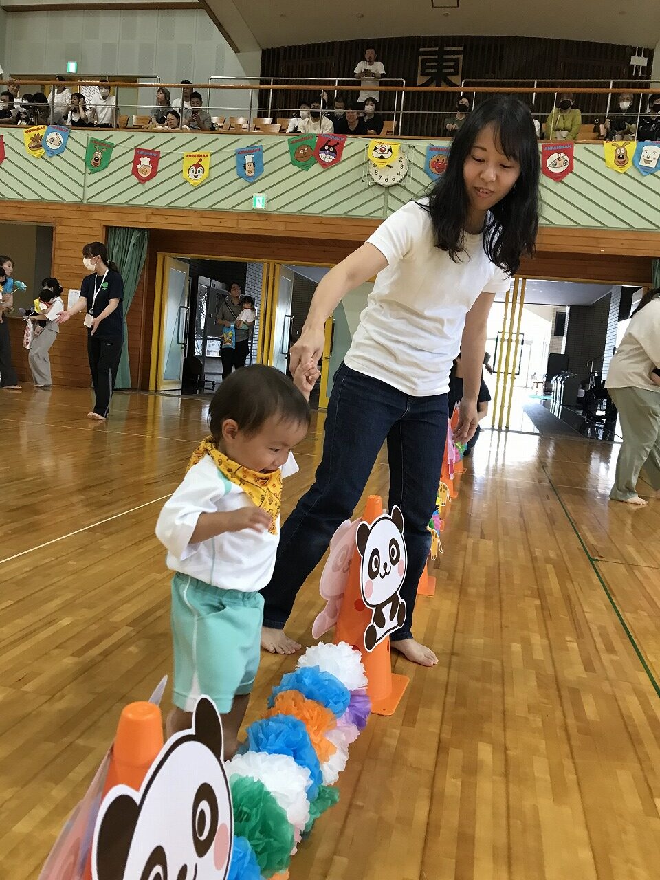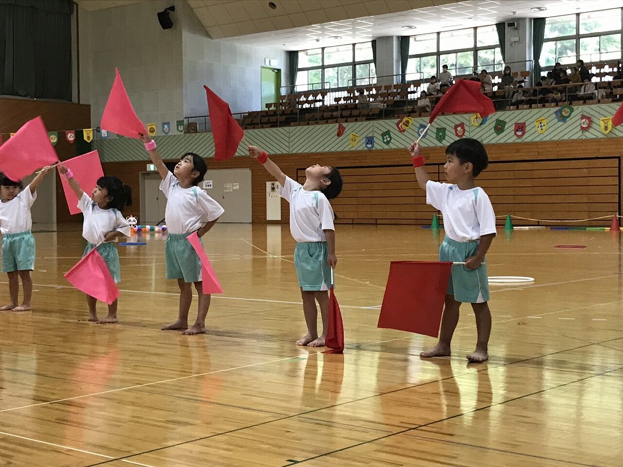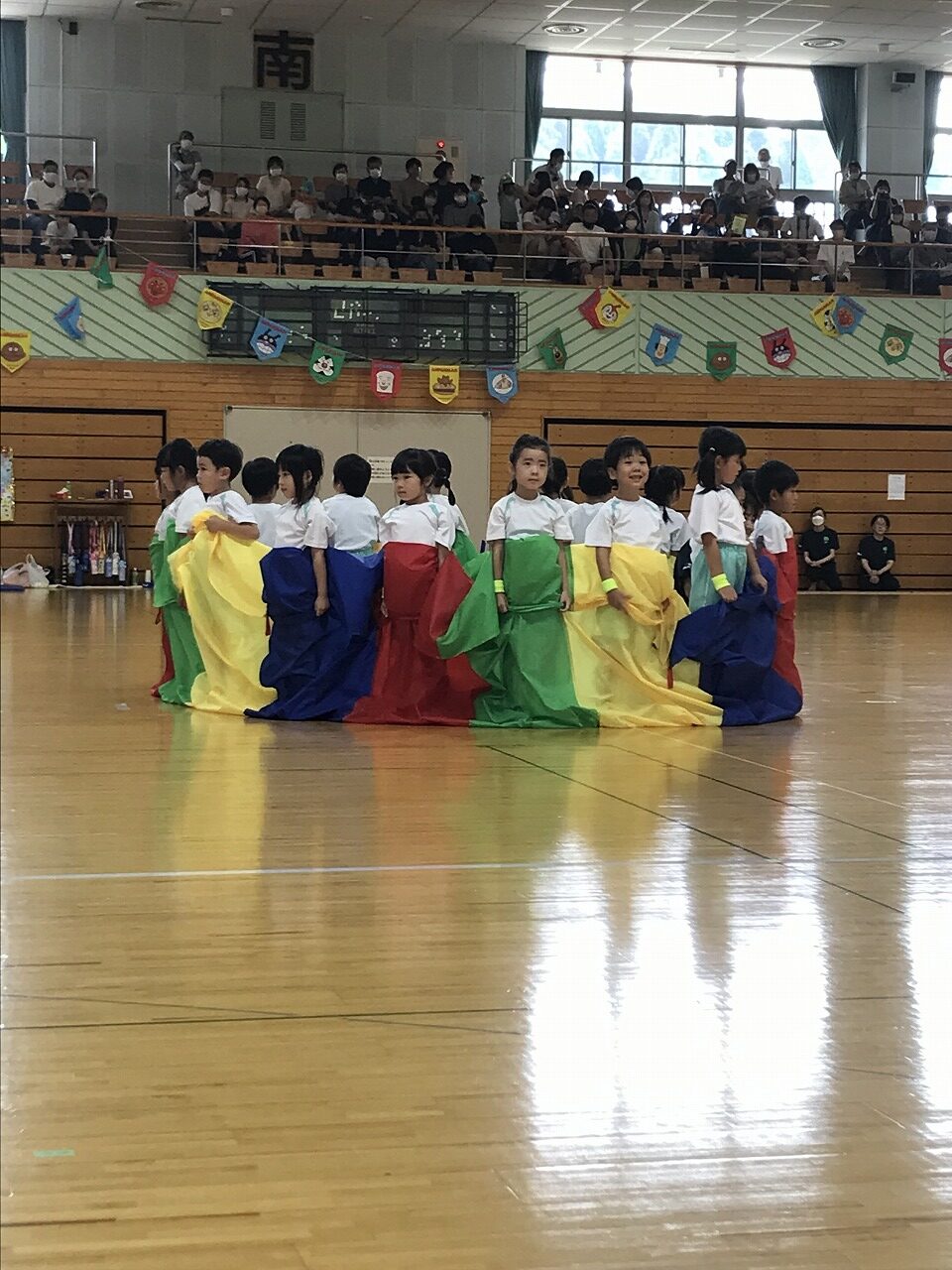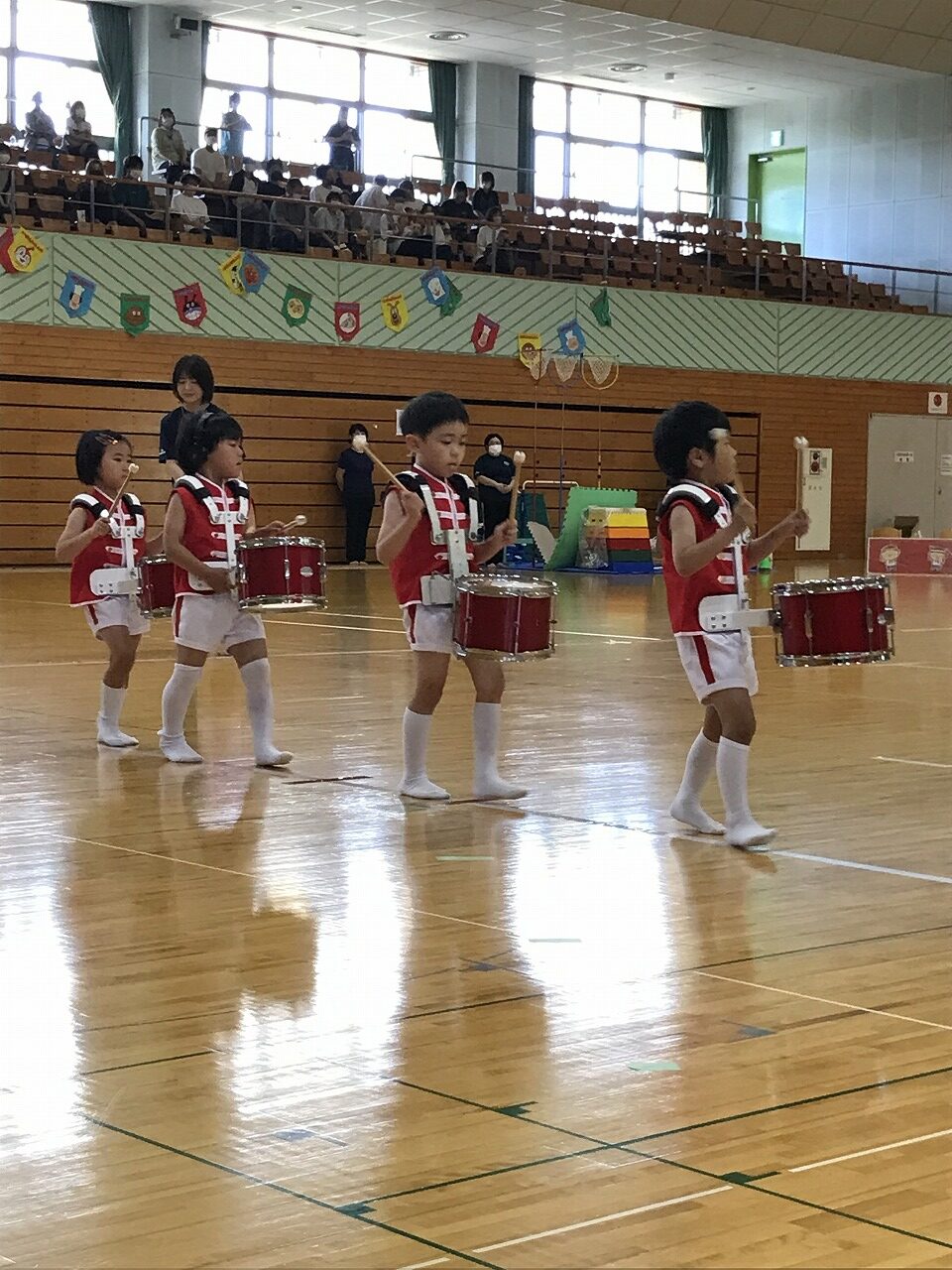 17日土曜日は総合体育館で運動会がありました。入園、進級してすぐの運動会、練習の期間も短く、梅雨入りしたり暑かったり…その中でも子ども達が楽しく取り組み、お家の方に見てもらうのを楽しみにがんばってきました。もも組(5歳児)は最後の運動会、かっこいい衣装を着ての入場や、バルーン等々、とても感動しました。0,1歳児はお家の方と一緒でうれしそうな様子が見られました。2歳からは、リズムやかけっこ最後までがんばりましたね。みんなキラキラ輝いていた運動会でした。
