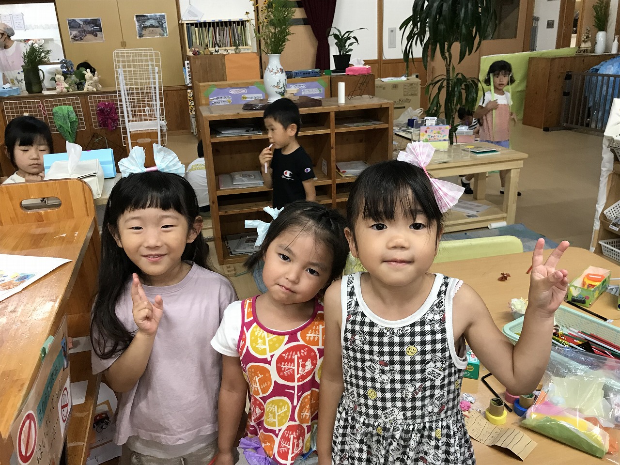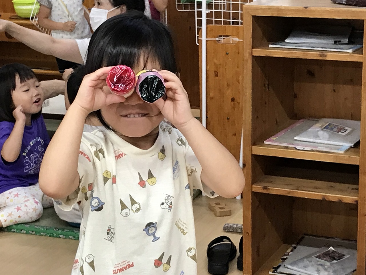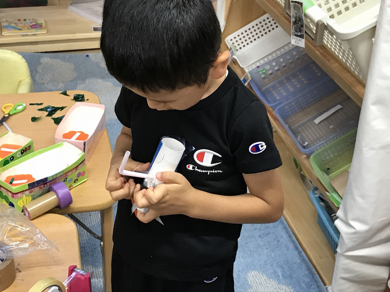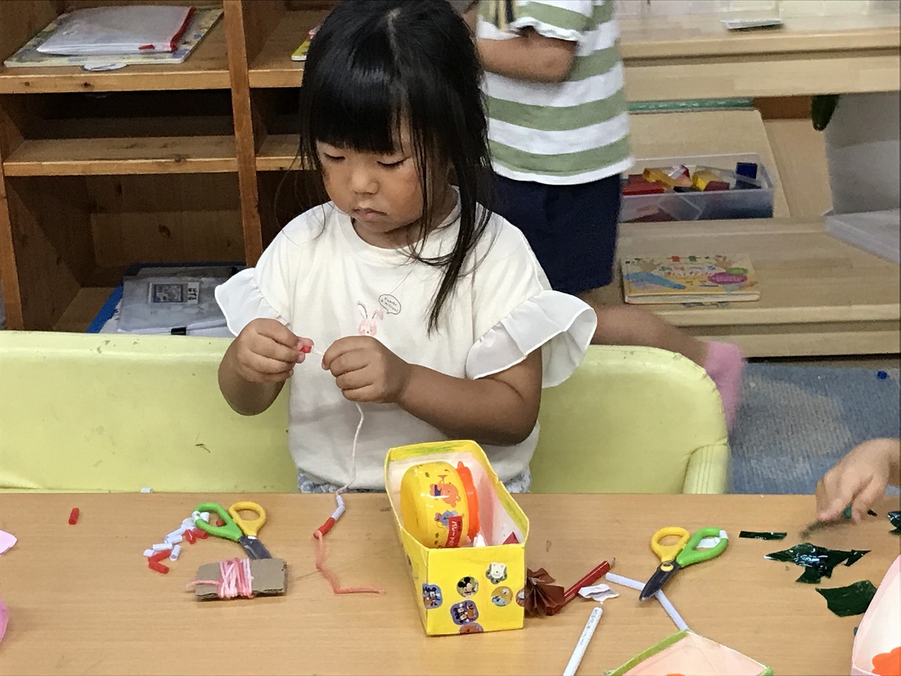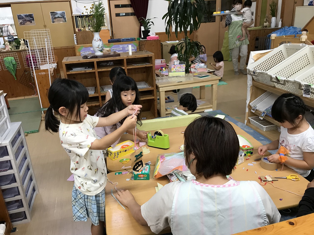 最近は廃材遊びの中でアクセサリーを作る子がブームになり、保育士等のアイデアを元に作っては身に付け、満足感を得ているようです。