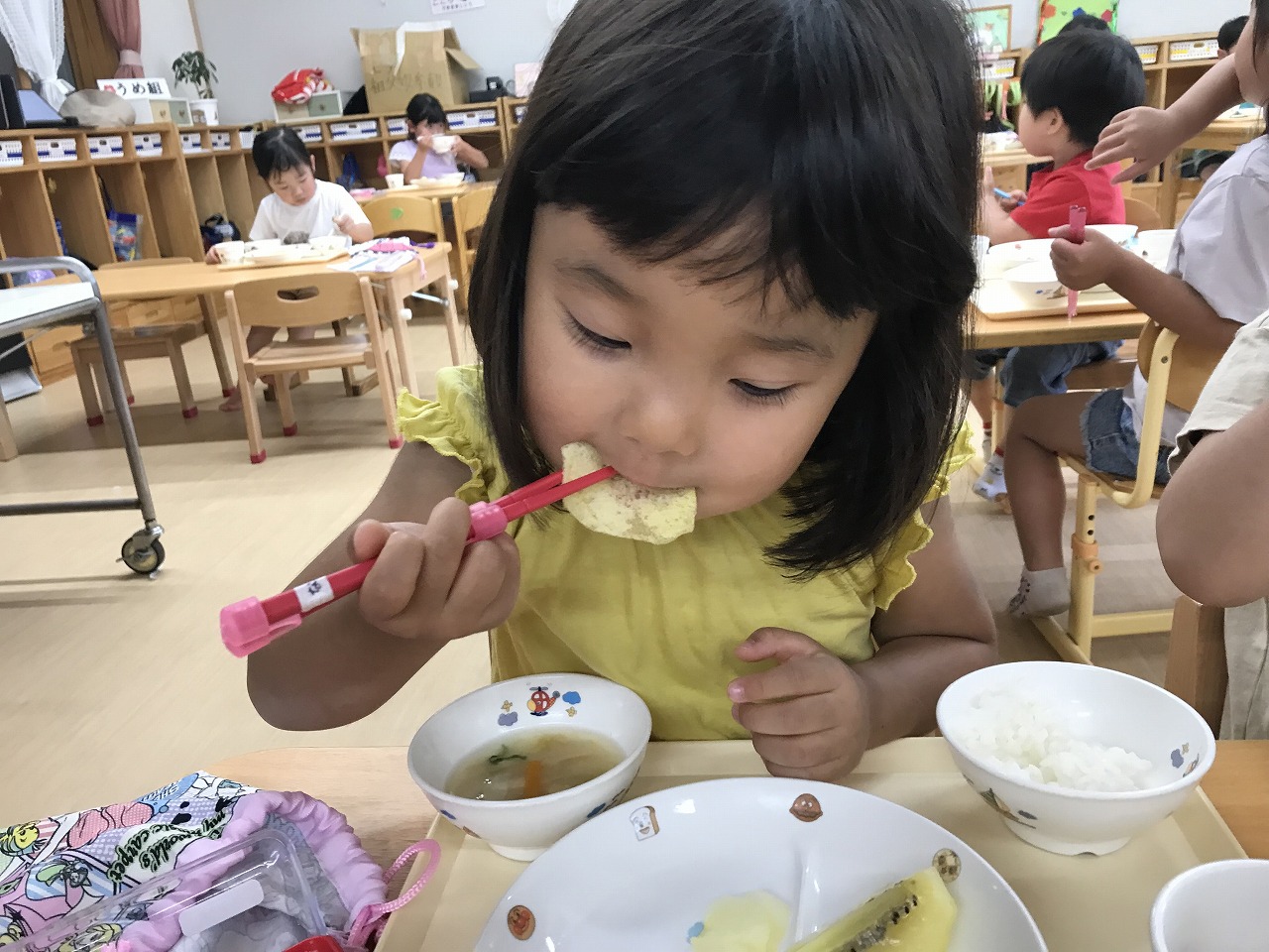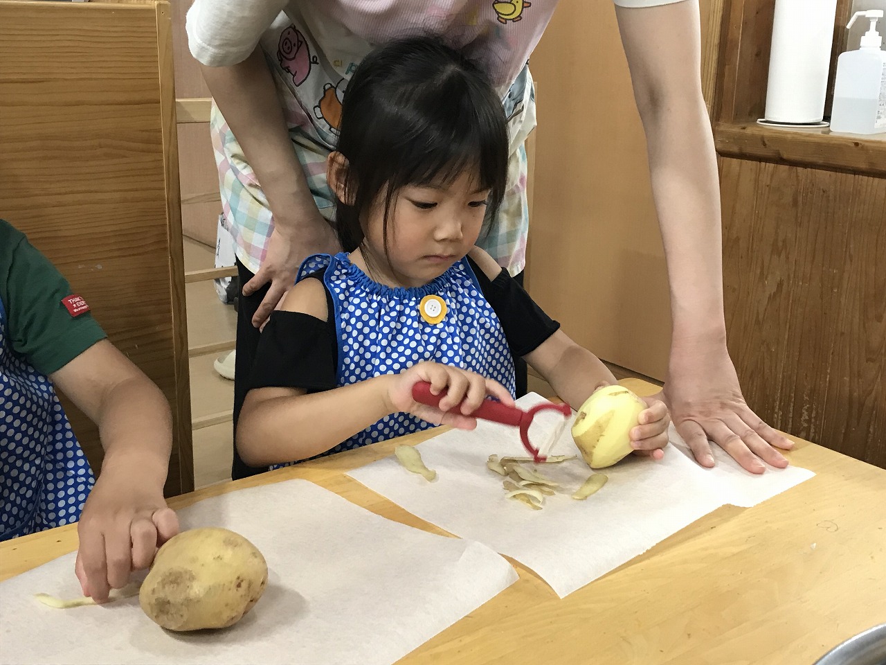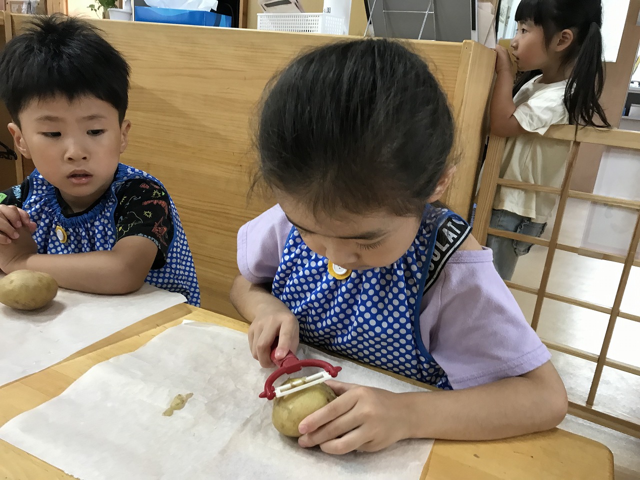 もも組(5歳児)が皮むきをしさくら組がペーパーで水気をふき取りました。