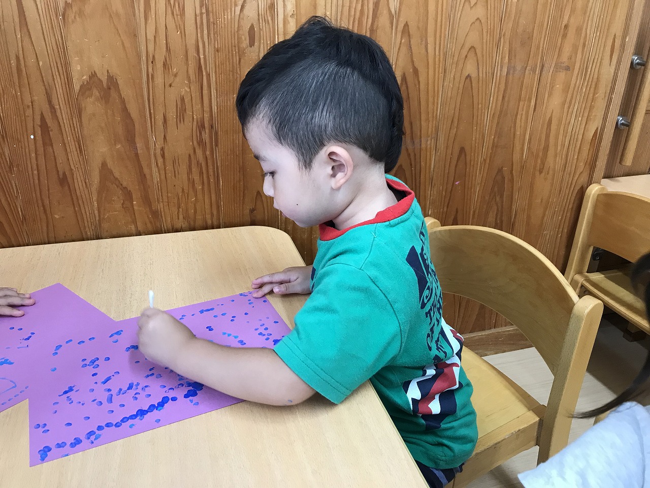 今日はあいにくの雨、、。子ども達も「そとでられんね」と残念そうに窓越しで眺めていました。室内で楽しいことをしようと、今日は絵の具を使って雨の制作を楽しみました。雨ってどんな形かな?と疑問や不思議をみんなで話しながら制作に取りかかりました。少人数ずつ行い、子ども達と一緒に話をしたり、様々な雨の形を表現したりと、一人ひとり個性のある作品に仕上がりました。明日は雨があがって晴れると良いですね!ホールでは運動遊びコーナーを作り、すみれ組(1歳児)さんと一緒に、マットのジャンプや平均台を楽しみました。両足ジャンプも上手になってきたたんぽぽ組(2歳児)さん。体をたくさん動かして元気に過ごしました。