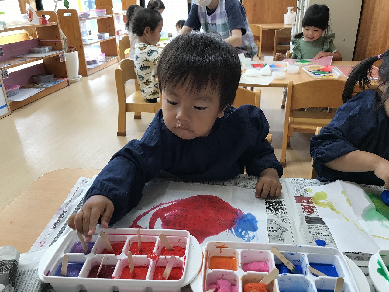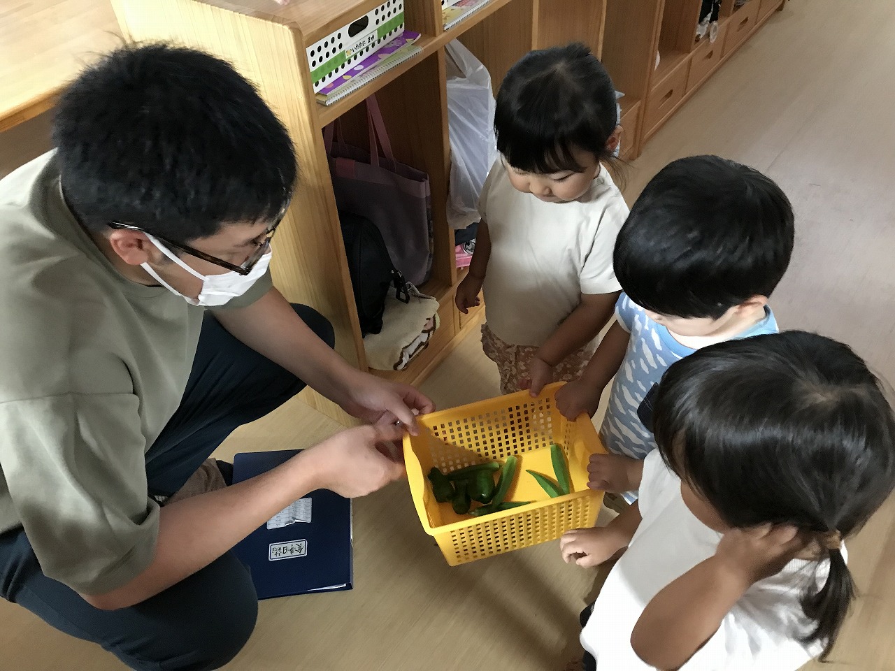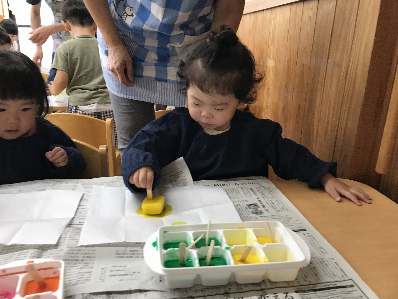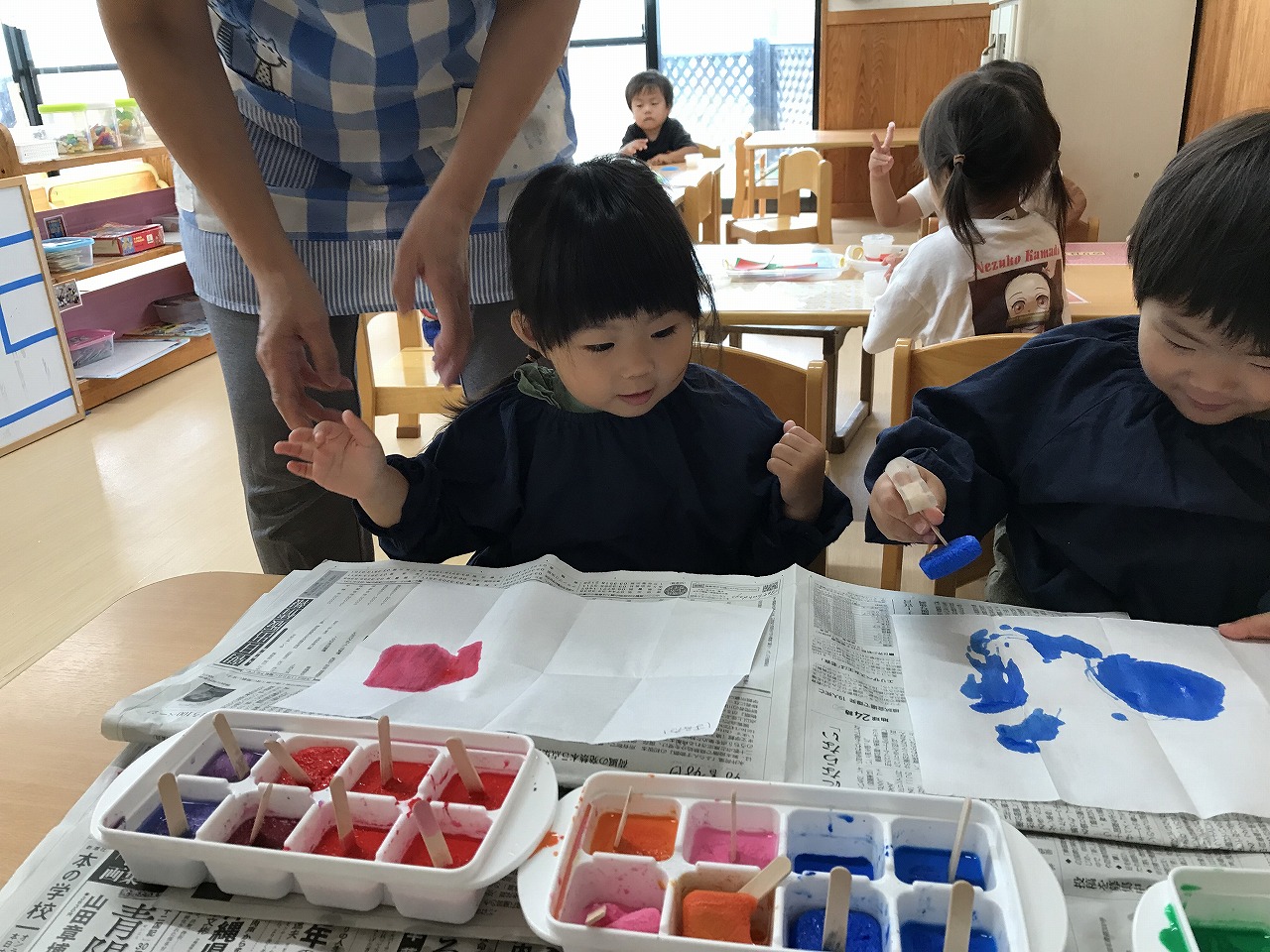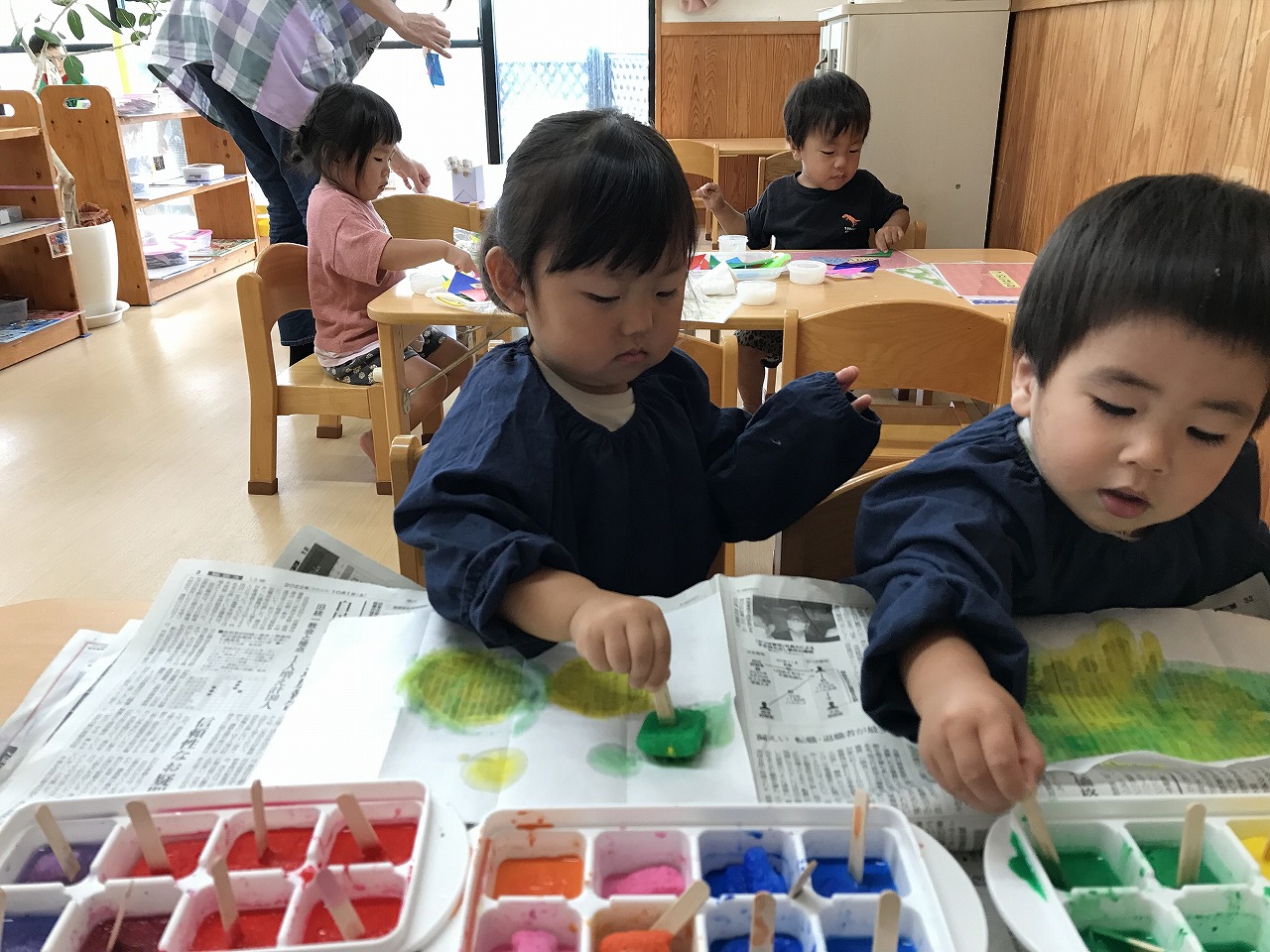 もうすぐ七夕★以前、色水遊びをした際に子ども達がとても楽しそうに興味を持って遊びを広げている姿から、絵の具を製氷皿で凍らせ、氷の絵の具を作りました。今日は、氷の絵の具を使って障子紙にお絵描きをして制作を楽しみました。「つめたーい!!」と氷の感触を楽しみながら、色がついていく様子を不思議そうに眺めていました。もう一つの制作は、丸三角四角の折り紙を、糊でたくさん繋げていきました。集中力が続く子は、長く繋げていき制作を楽しんでいました。その後は、たんぽぽ組(2歳児)さんが、育てている野菜が大きく生長し、オクラやピーマンが収穫できるまでに大きくなっていました。野菜を収穫し、まんまるーむの先生に「おねがいします!」と渡し、料理してもらいました。昼食で、オクラを食べた子ども達は、「おいしい!」「にがーい、、」と様々な感想が聞かれました。これからも自分達で育てている野菜を食べて、食に興味を持ったり、野菜の生長に興味を持って楽しく観察していきたいです。