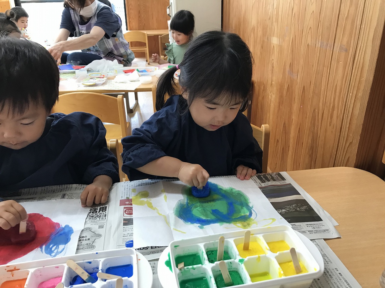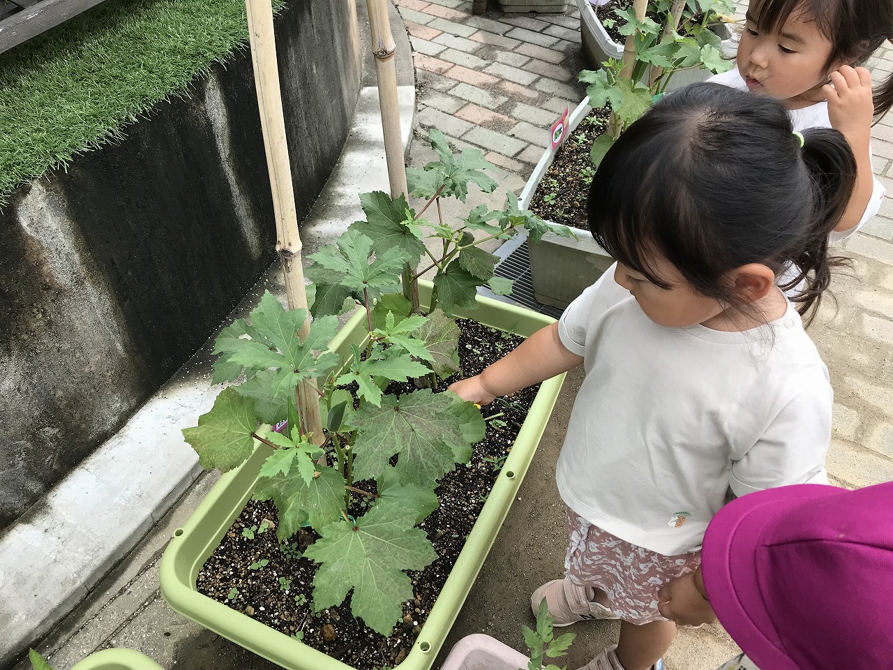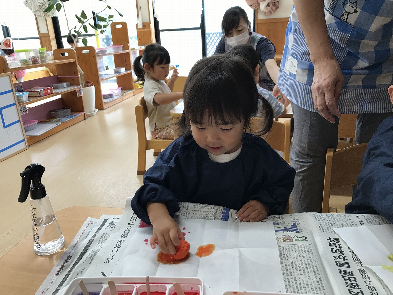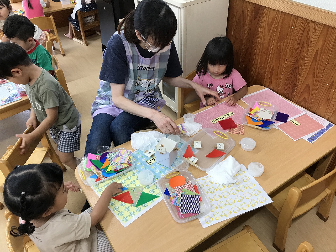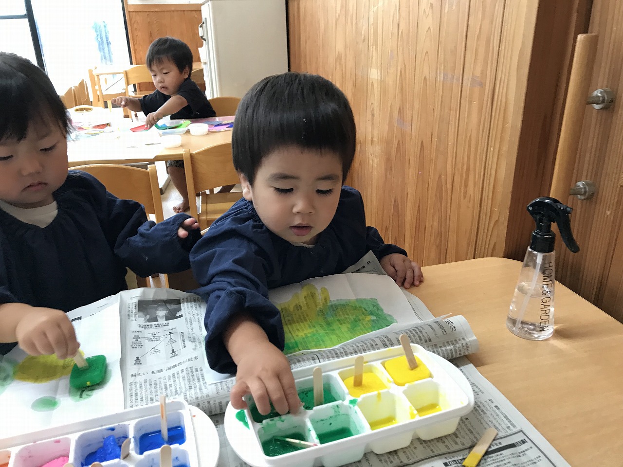 もうすぐ七夕★以前、色水遊びをした際に子ども達がとても楽しそうに興味を持って遊びを広げている姿から、絵の具を製氷皿で凍らせ、氷の絵の具を作りました。今日は、氷の絵の具を使って障子紙にお絵描きをして制作を楽しみました。「つめたーい!!」と氷の感触を楽しみながら、色がついていく様子を不思議そうに眺めていました。もう一つの制作は、丸三角四角の折り紙を、糊でたくさん繋げていきました。集中力が続く子は、長く繋げていき制作を楽しんでいました。その後は、たんぽぽ組(2歳児)さんが、育てている野菜が大きく生長し、オクラやピーマンが収穫できるまでに大きくなっていました。野菜を収穫し、まんまるーむの先生に「おねがいします!」と渡し、料理してもらいました。昼食で、オクラを食べた子ども達は、「おいしい!」「にがーい、、」と様々な感想が聞かれました。これからも自分達で育てている野菜を食べて、食に興味を持ったり、野菜の生長に興味を持って楽しく観察していきたいです。