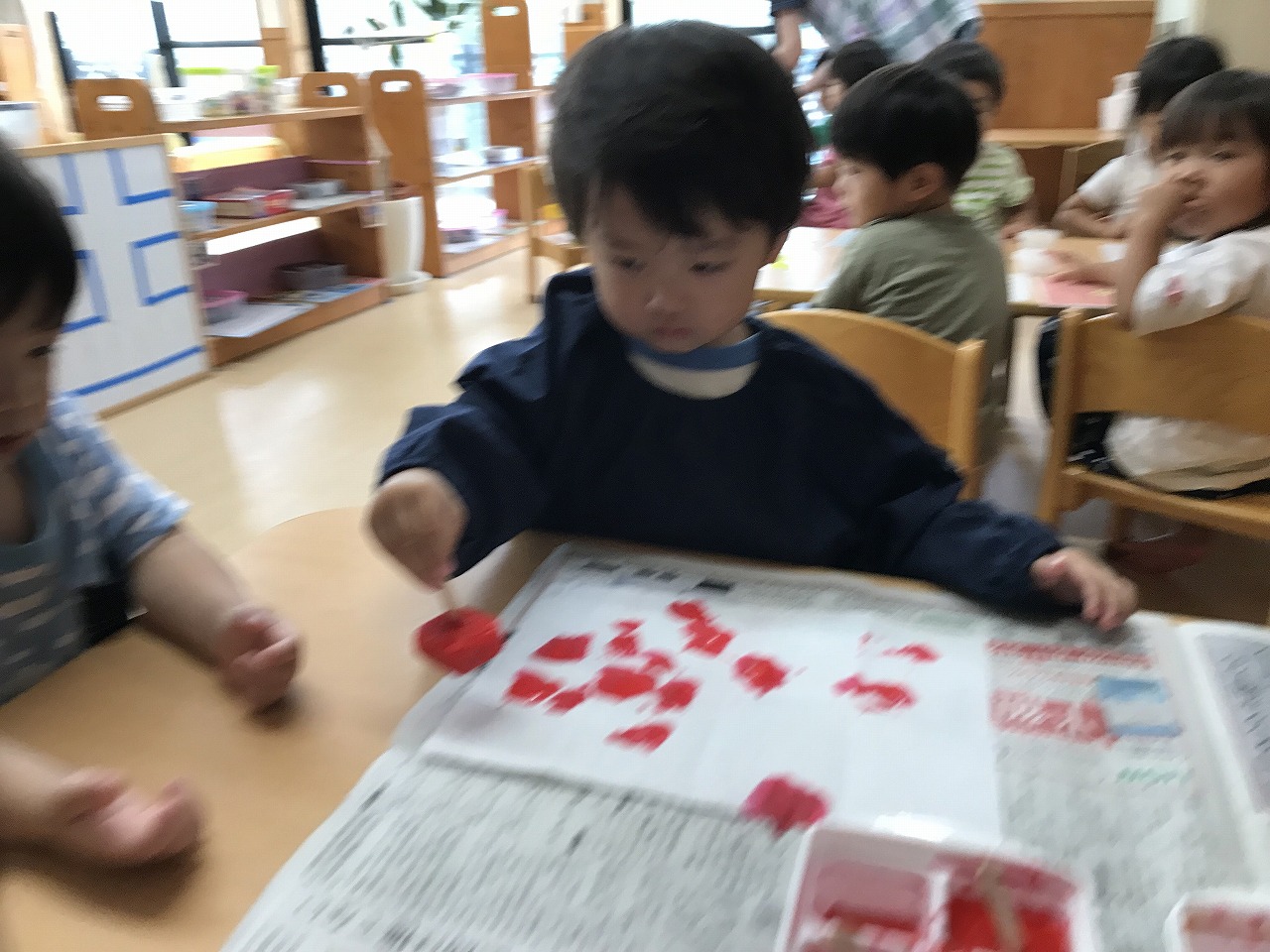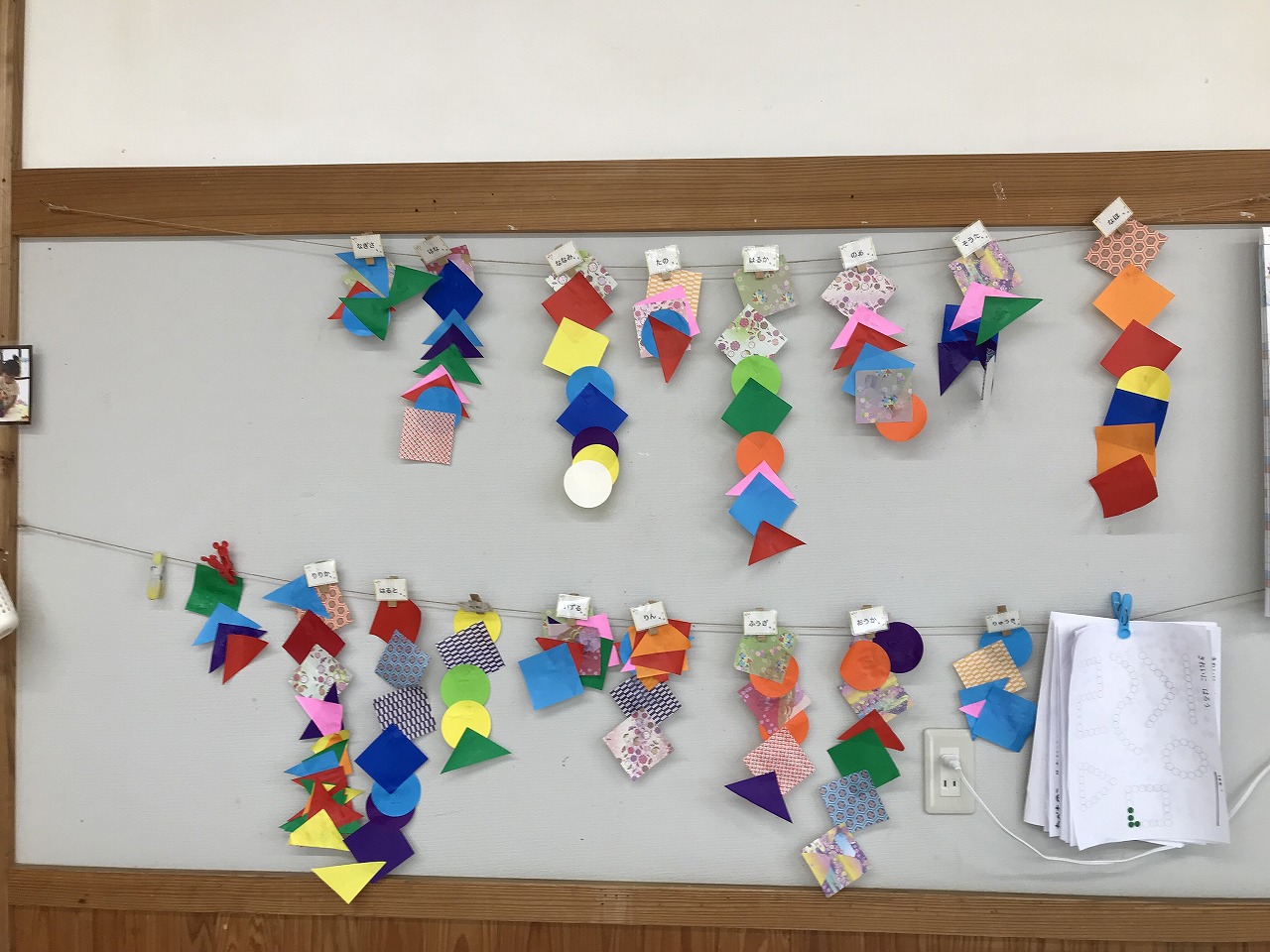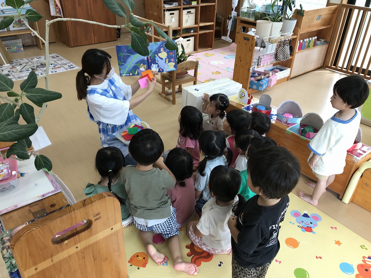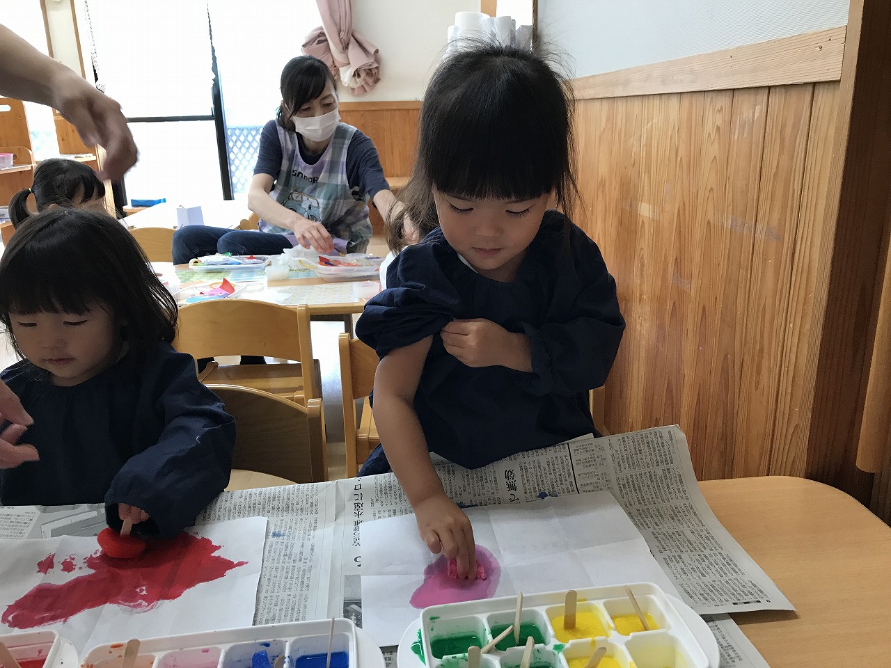 もうすぐ七夕★以前、色水遊びをした際に子ども達がとても楽しそうに興味を持って遊びを広げている姿から、絵の具を製氷皿で凍らせ、氷の絵の具を作りました。今日は、氷の絵の具を使って障子紙にお絵描きをして制作を楽しみました。「つめたーい!!」と氷の感触を楽しみながら、色がついていく様子を不思議そうに眺めていました。もう一つの制作は、丸三角四角の折り紙を、糊でたくさん繋げていきました。集中力が続く子は、長く繋げていき制作を楽しんでいました。その後は、たんぽぽ組(2歳児)さんが、育てている野菜が大きく生長し、オクラやピーマンが収穫できるまでに大きくなっていました。野菜を収穫し、まんまるーむの先生に「おねがいします!」と渡し、料理してもらいました。昼食で、オクラを食べた子ども達は、「おいしい!」「にがーい、、」と様々な感想が聞かれました。これからも自分達で育てている野菜を食べて、食に興味を持ったり、野菜の生長に興味を持って楽しく観察していきたいです。