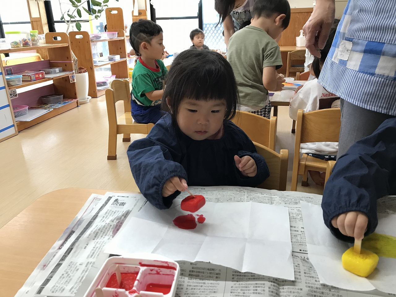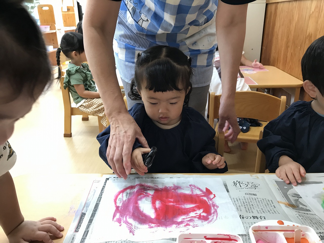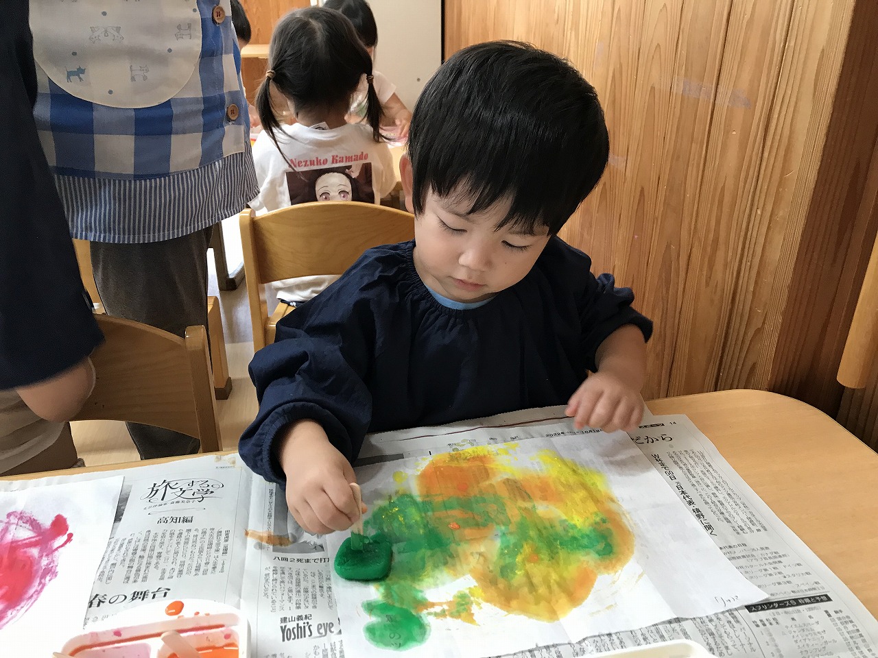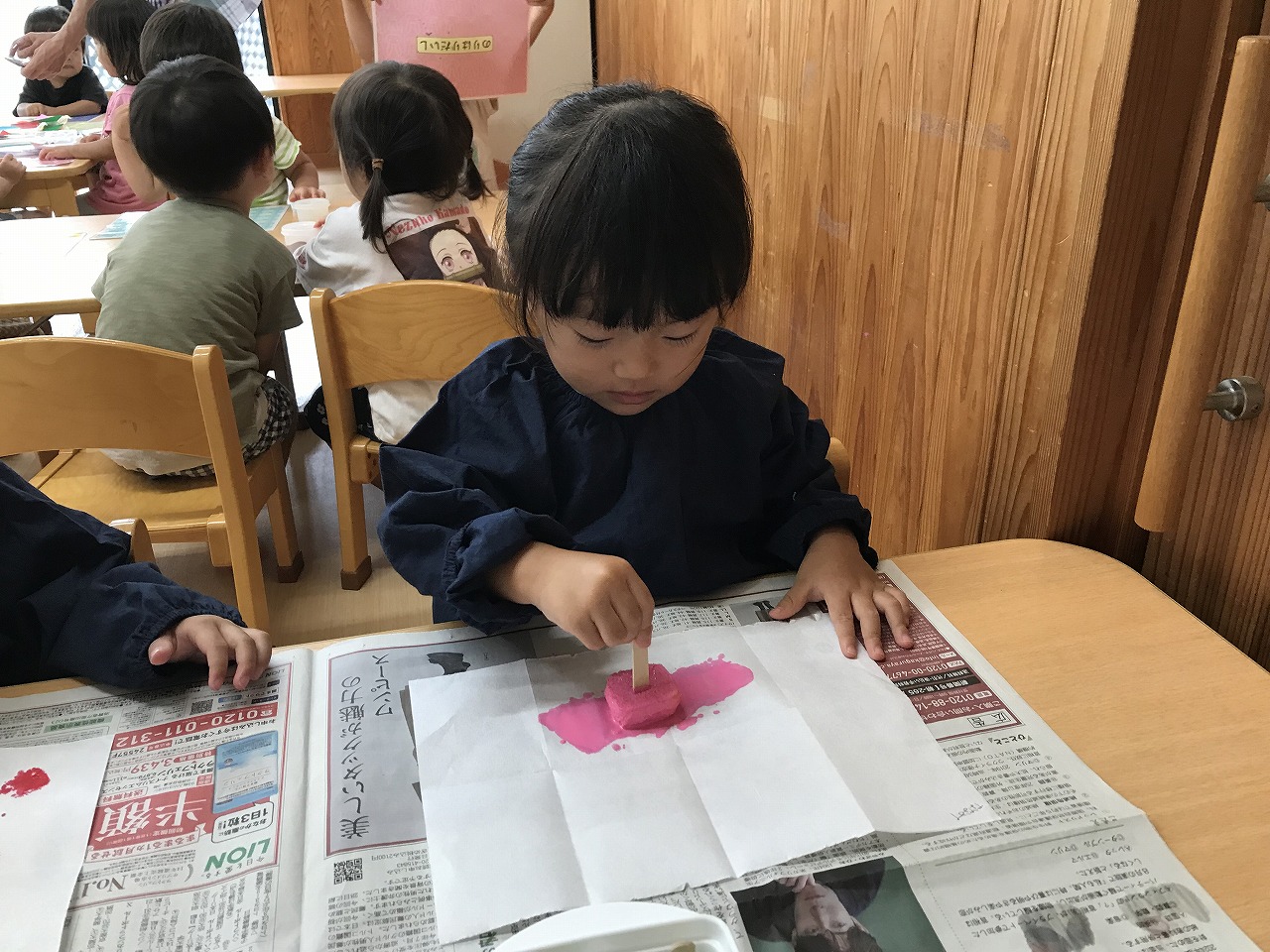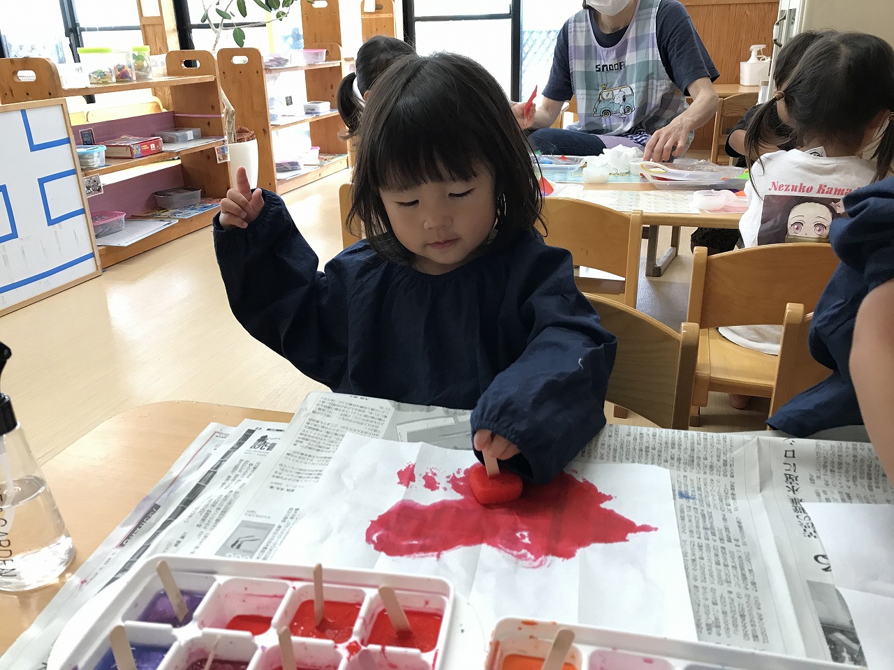 もうすぐ七夕★以前、色水遊びをした際に子ども達がとても楽しそうに興味を持って遊びを広げている姿から、絵の具を製氷皿で凍らせ、氷の絵の具を作りました。今日は、氷の絵の具を使って障子紙にお絵描きをして制作を楽しみました。「つめたーい!!」と氷の感触を楽しみながら、色がついていく様子を不思議そうに眺めていました。もう一つの制作は、丸三角四角の折り紙を、糊でたくさん繋げていきました。集中力が続く子は、長く繋げていき制作を楽しんでいました。その後は、たんぽぽ組(2歳児)さんが、育てている野菜が大きく生長し、オクラやピーマンが収穫できるまでに大きくなっていました。野菜を収穫し、まんまるーむの先生に「おねがいします!」と渡し、料理してもらいました。昼食で、オクラを食べた子ども達は、「おいしい!」「にがーい、、」と様々な感想が聞かれました。これからも自分達で育てている野菜を食べて、食に興味を持ったり、野菜の生長に興味を持って楽しく観察していきたいです。