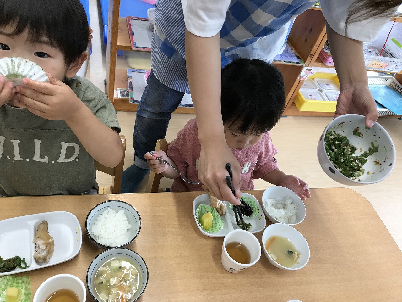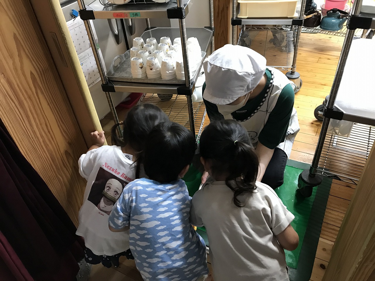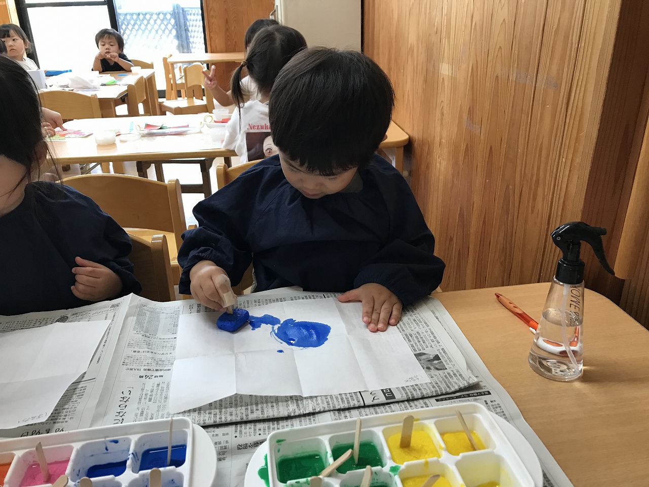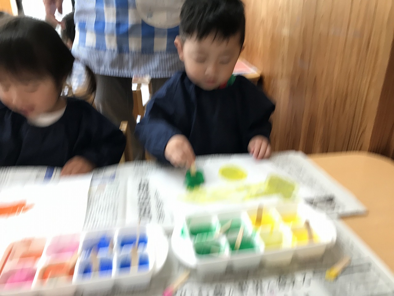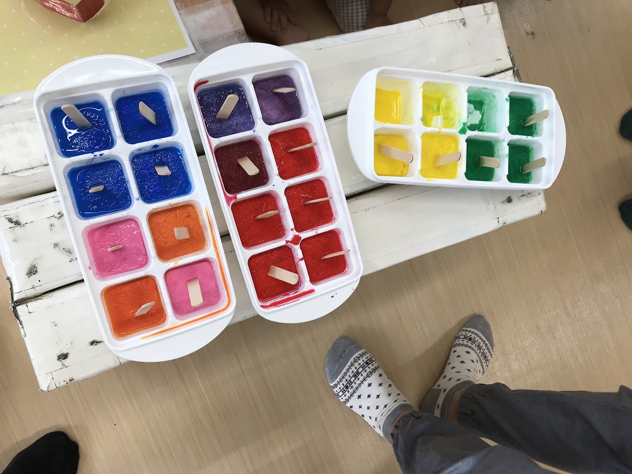 もうすぐ七夕★以前、色水遊びをした際に子ども達がとても楽しそうに興味を持って遊びを広げている姿から、絵の具を製氷皿で凍らせ、氷の絵の具を作りました。今日は、氷の絵の具を使って障子紙にお絵描きをして制作を楽しみました。「つめたーい!!」と氷の感触を楽しみながら、色がついていく様子を不思議そうに眺めていました。もう一つの制作は、丸三角四角の折り紙を、糊でたくさん繋げていきました。集中力が続く子は、長く繋げていき制作を楽しんでいました。その後は、たんぽぽ組(2歳児)さんが、育てている野菜が大きく生長し、オクラやピーマンが収穫できるまでに大きくなっていました。野菜を収穫し、まんまるーむの先生に「おねがいします!」と渡し、料理してもらいました。昼食で、オクラを食べた子ども達は、「おいしい!」「にがーい、、」と様々な感想が聞かれました。これからも自分達で育てている野菜を食べて、食に興味を持ったり、野菜の生長に興味を持って楽しく観察していきたいです。