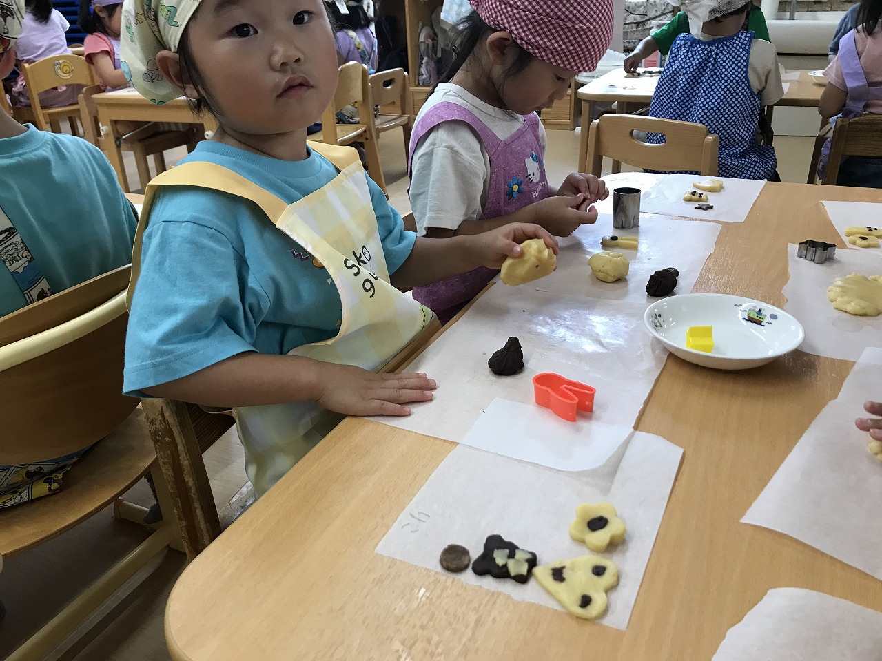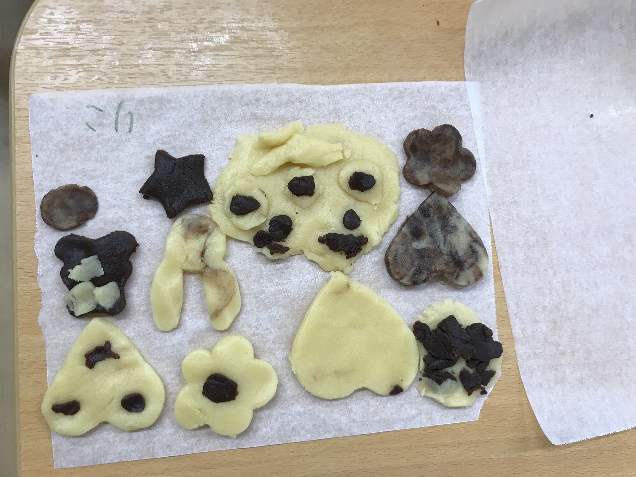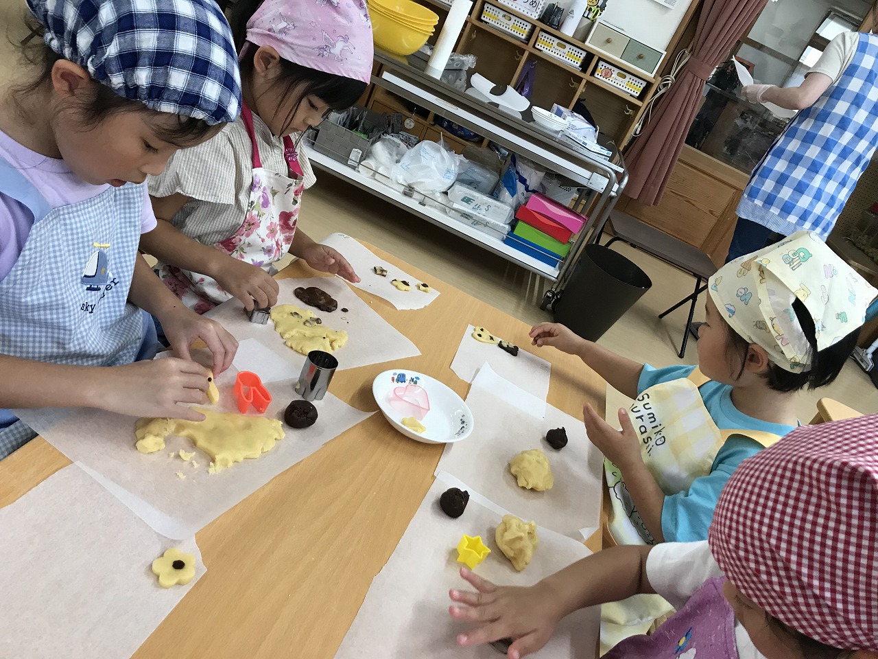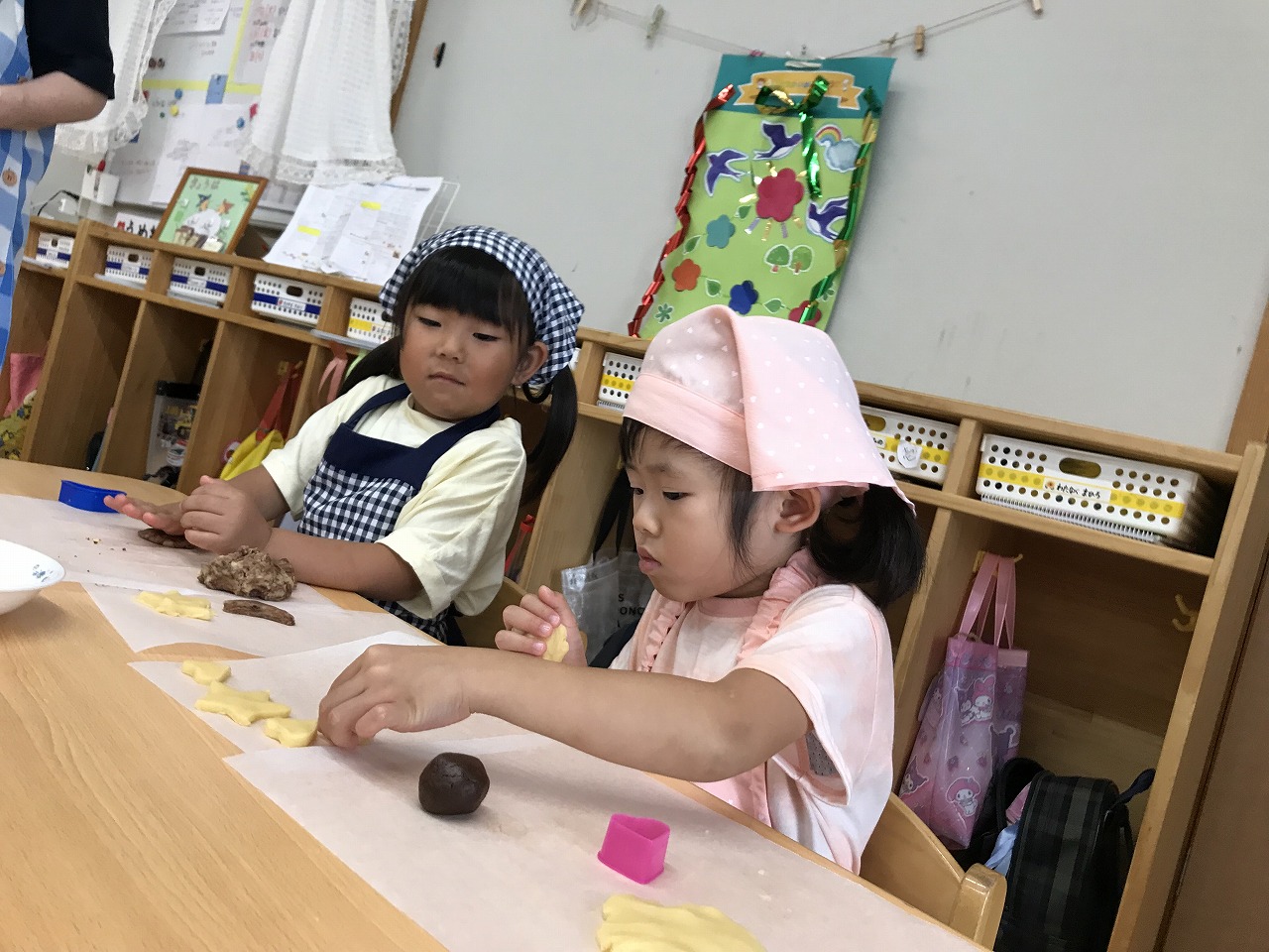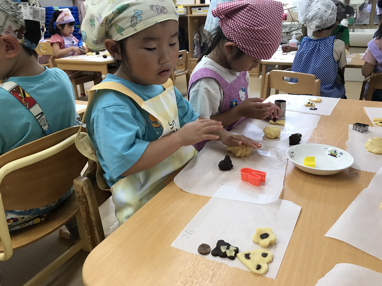 以上児(3,4,5歳児)は、お家の方に感謝の気持ちを込めてクッキー作りを行いました。昨日から“どんな形にしようかな?!”と楽しみにしていたこども達。今日はクッキーの生地から、異年齢のペアさんと一緒に作りました。一つひとつの工程をみんなで順番に行っていきました。材料をかき混ぜる工程では、周りの子達がボールを持ってあげてやりやすいようにしてあげたり等、協力してクッキングを楽しんでいる様子が沢山みられました。生地ができたら型作りです。