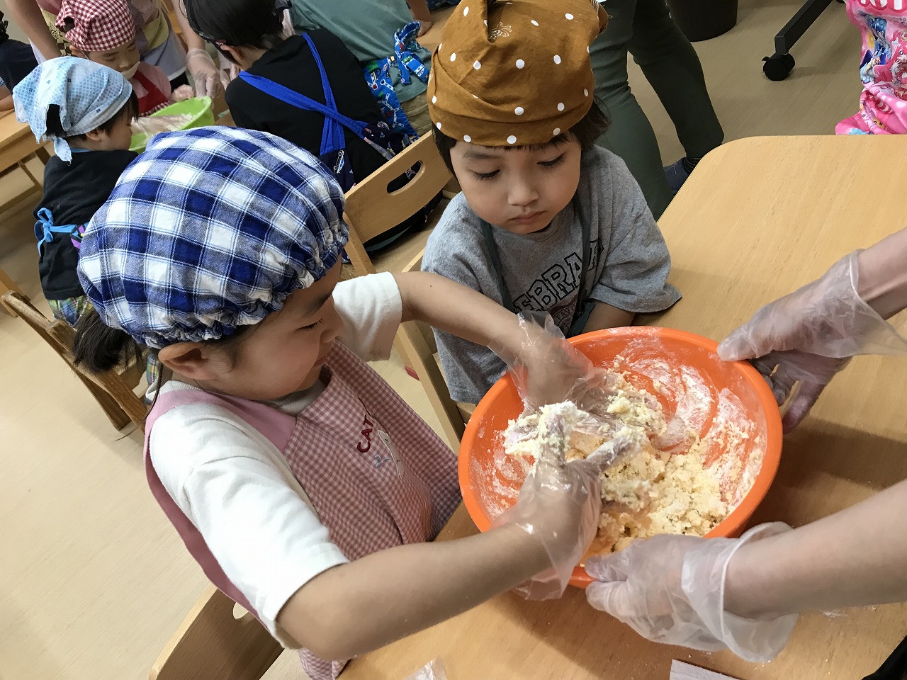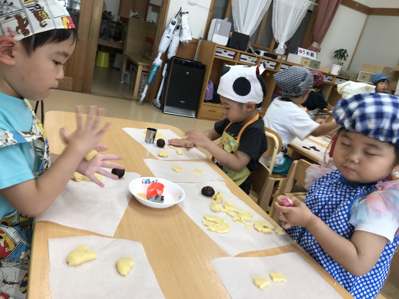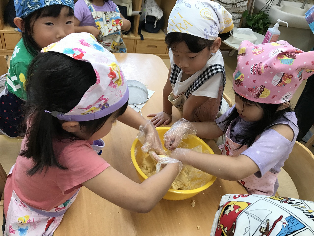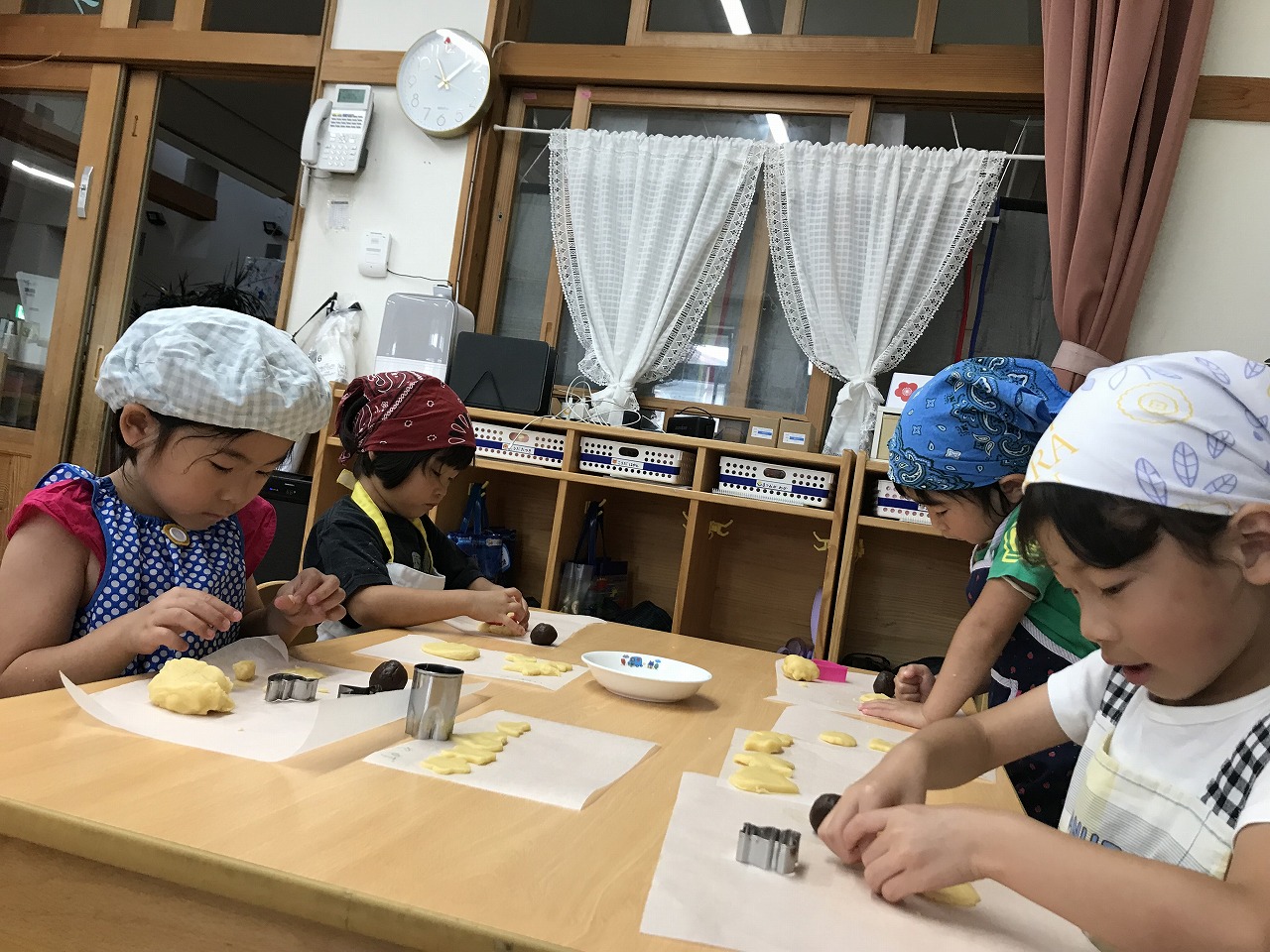 以上児(3,4,5歳児)は、お家の方に感謝の気持ちを込めてクッキー作りを行いました。昨日から“どんな形にしようかな?!”と楽しみにしていたこども達。今日はクッキーの生地から、異年齢のペアさんと一緒に作りました。一つひとつの工程をみんなで順番に行っていきました。材料をかき混ぜる工程では、周りの子達がボールを持ってあげてやりやすいようにしてあげたり等、協力してクッキングを楽しんでいる様子が沢山みられました。生地ができたら型作りです。