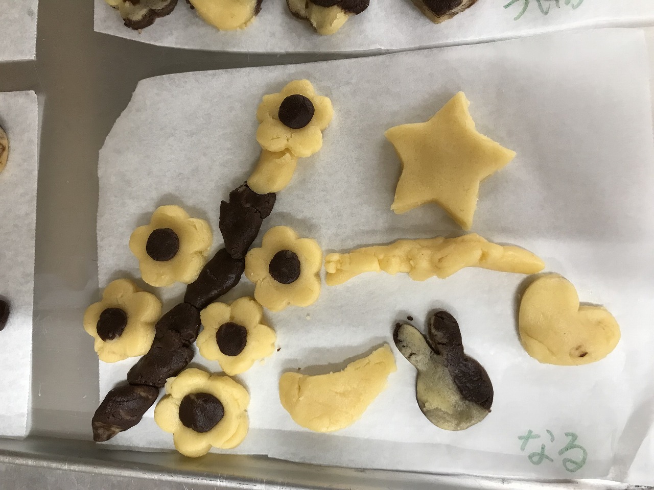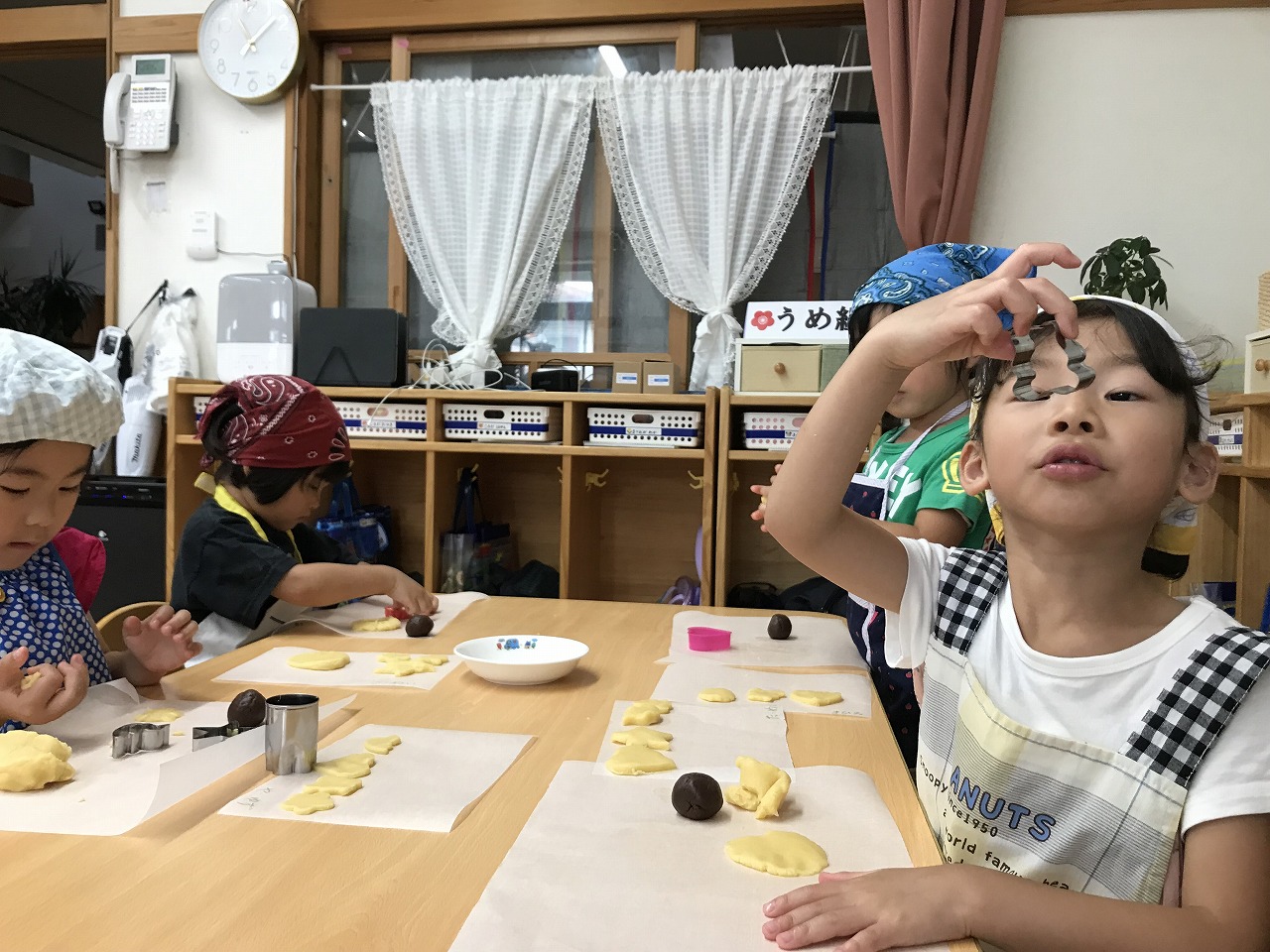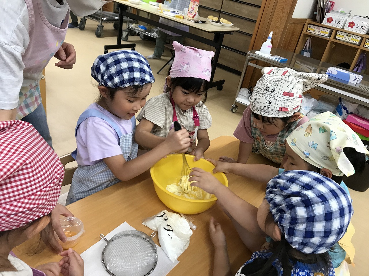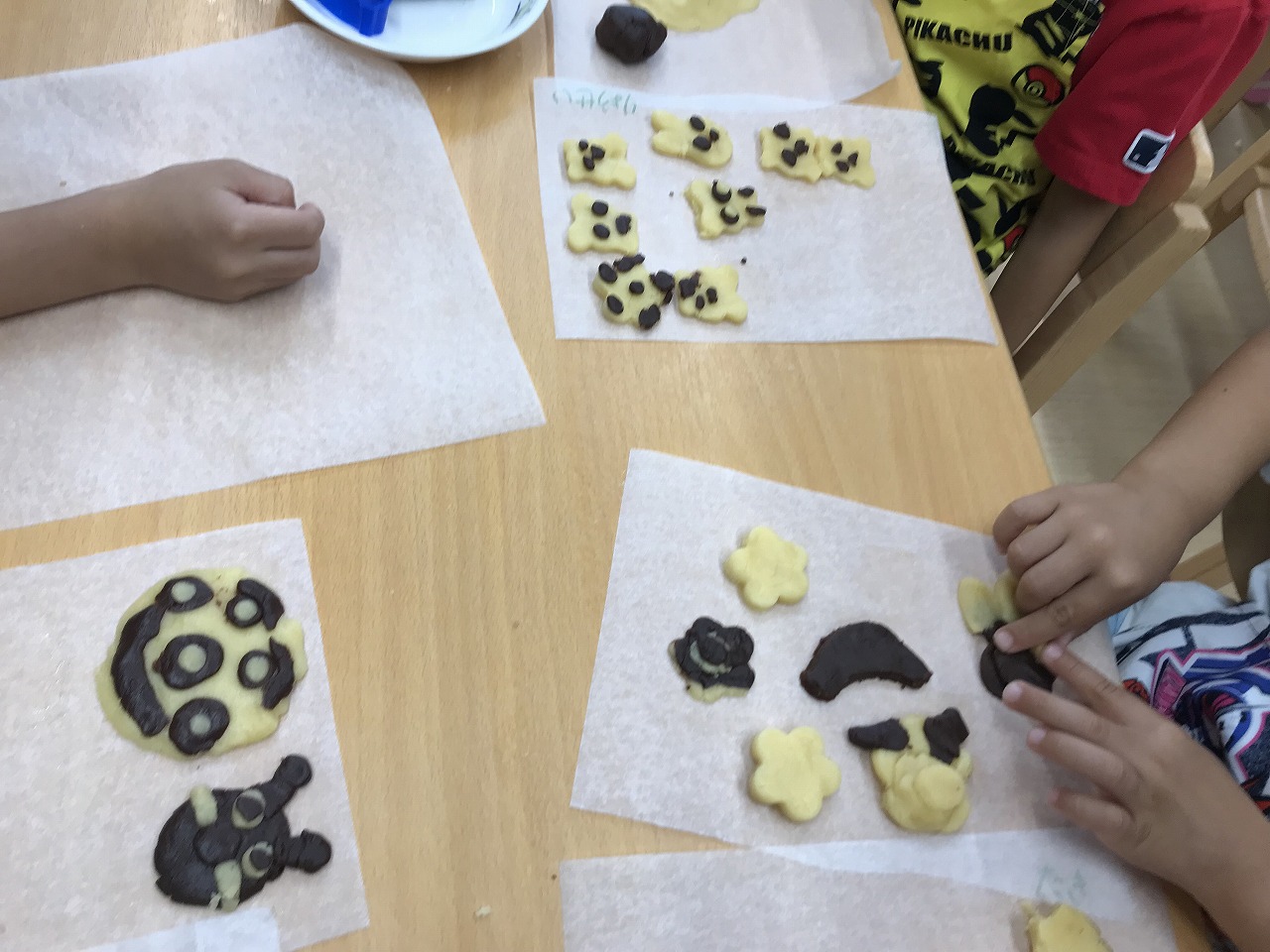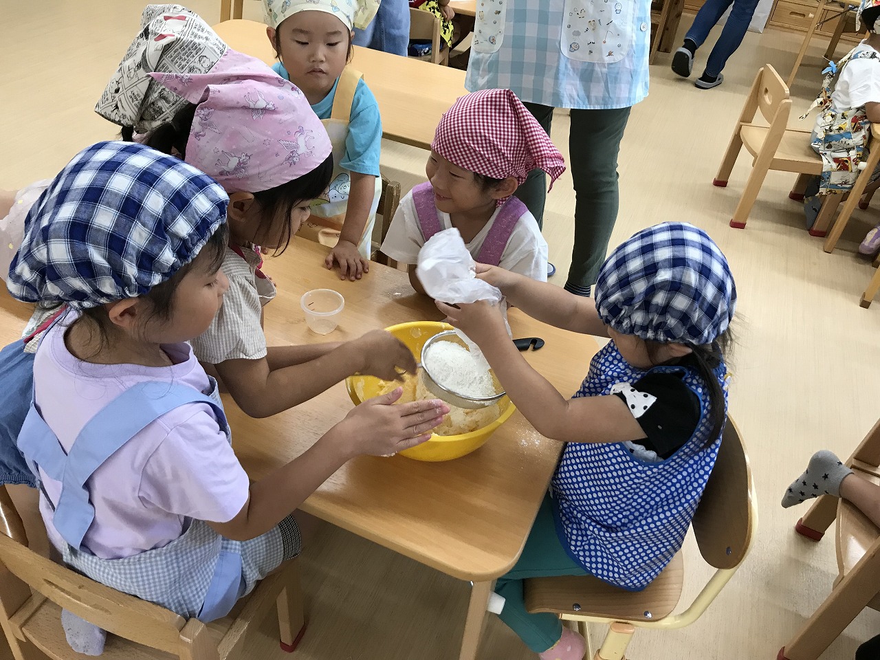 以上児(3,4,5歳児)は、お家の方に感謝の気持ちを込めてクッキー作りを行いました。昨日から“どんな形にしようかな?!”と楽しみにしていたこども達。今日はクッキーの生地から、異年齢のペアさんと一緒に作りました。一つひとつの工程をみんなで順番に行っていきました。材料をかき混ぜる工程では、周りの子達がボールを持ってあげてやりやすいようにしてあげたり等、協力してクッキングを楽しんでいる様子が沢山みられました。生地ができたら型作りです。