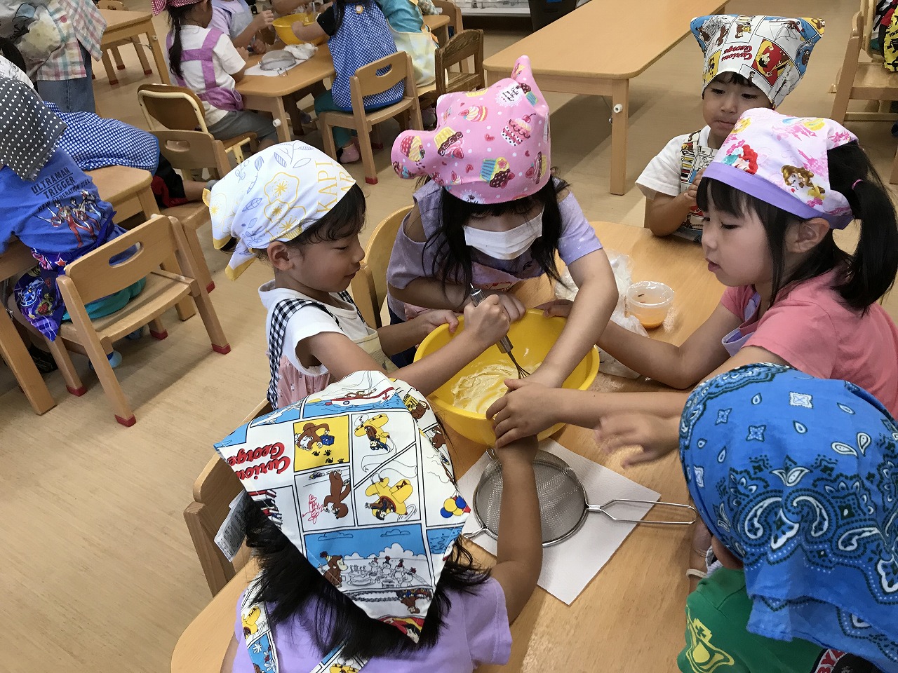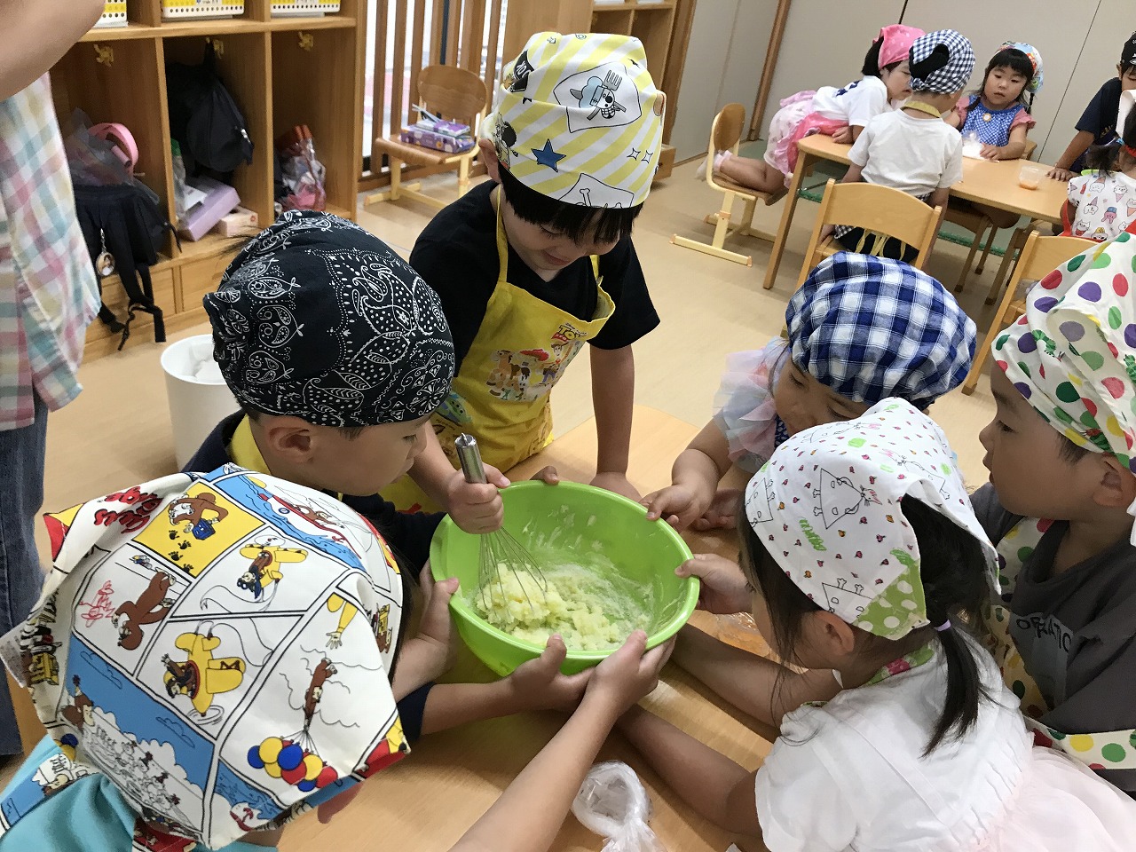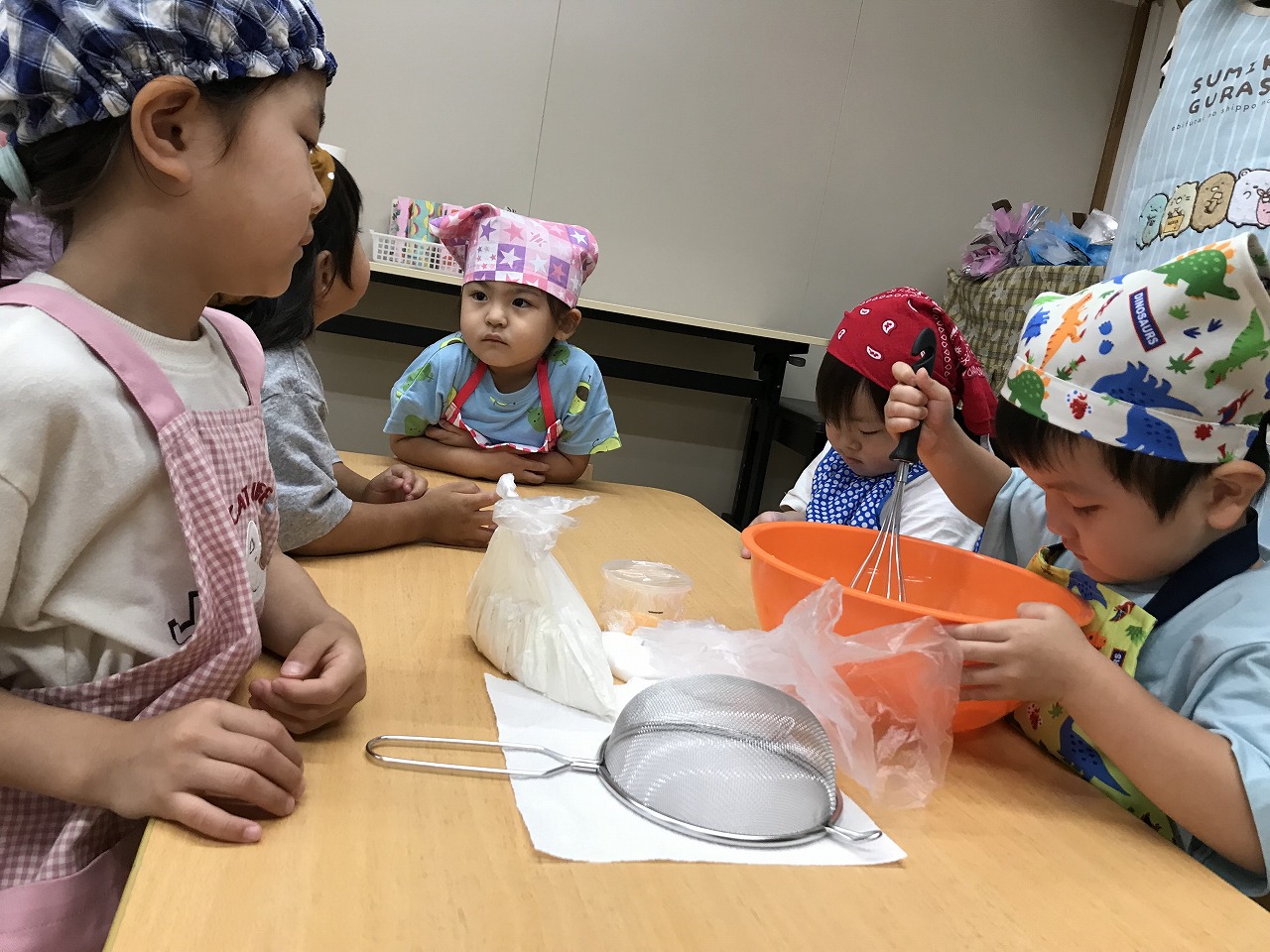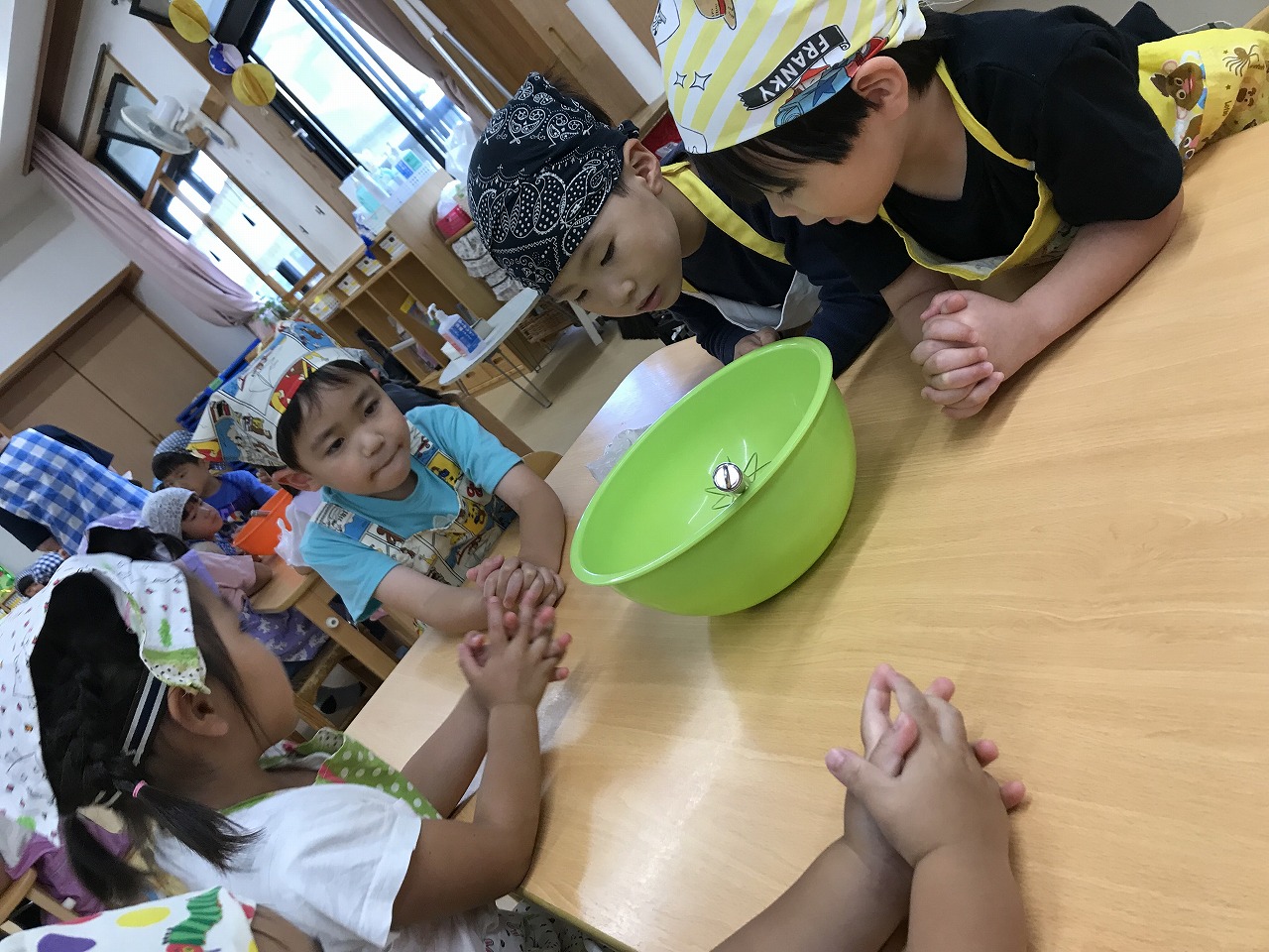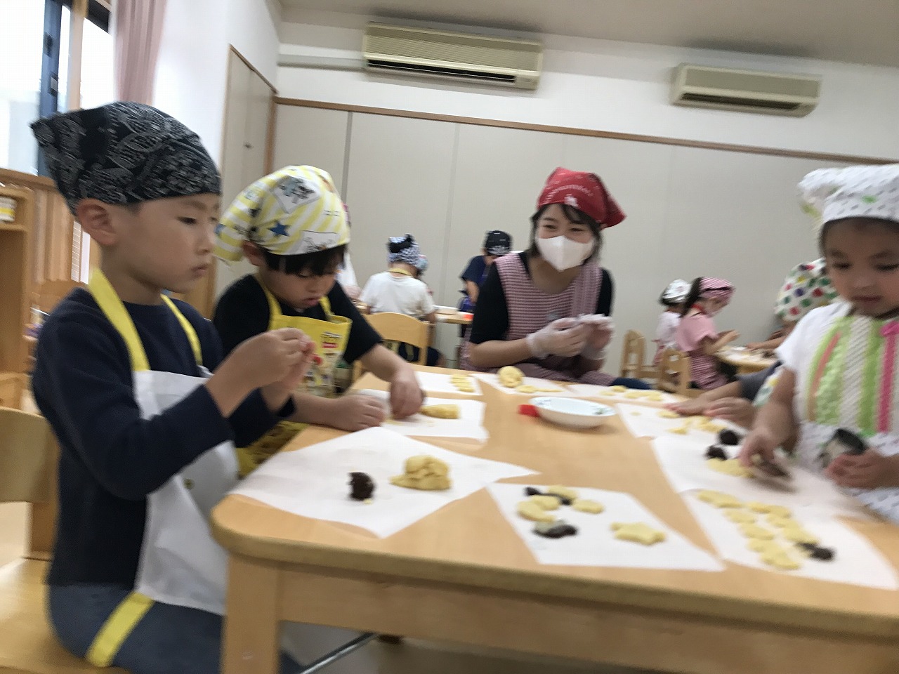 以上児(3,4,5歳児)は、お家の方に感謝の気持ちを込めてクッキー作りを行いました。昨日から“どんな形にしようかな?!”と楽しみにしていたこども達。今日はクッキーの生地から、異年齢のペアさんと一緒に作りました。一つひとつの工程をみんなで順番に行っていきました。材料をかき混ぜる工程では、周りの子達がボールを持ってあげてやりやすいようにしてあげたり等、協力してクッキングを楽しんでいる様子が沢山みられました。生地ができたら型作りです。