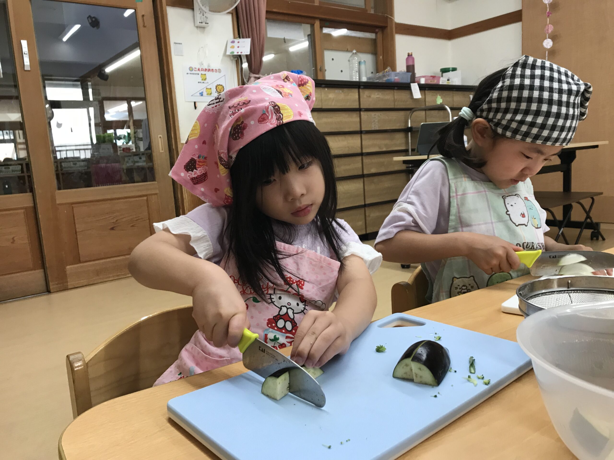 今日のクッキングのメニューはニョッキの入ったクリームシチューです。もも組(5歳児)はクリームシチューの具材の野菜のカットに挑戦しました。さくら組(4歳児)、うめ組(3歳児)はニョッキ作りを担当してくれました。もも組(5歳児)では、包丁の使い方、野菜の切り方のお話がありました。ピーマン、なす、しめじ、にんじん、ブロッコリー、玉ねぎなど様々な野菜を調理しました。なすは「いちょう切り」に挑戦しました。「いちょうの葉っぱみたい!」と楽しそうに野菜を切ってくれました。玉ねぎを切ってくれたお友達は「涙が出てきた…」「目が痛い!」と目に沁みる玉ねぎと戦いながら頑張って調理してくれました。切った野菜は、順番に混ぜながら炒めて野菜の色の変化や香りを楽しんでいました。色んな野菜を扱ってみて今日も沢山の学びがありました。ニョッキ作りでは、みんなで育てたじゃがいもを使用しました。加熱したじゃがいもに材料を入れてこねこね♪混ざったら平たいお団子の形にしていきます。「見て!上手にできた!」と形を見比べながら楽しんで調理してくれていました。どんな味になるか楽しみだね!