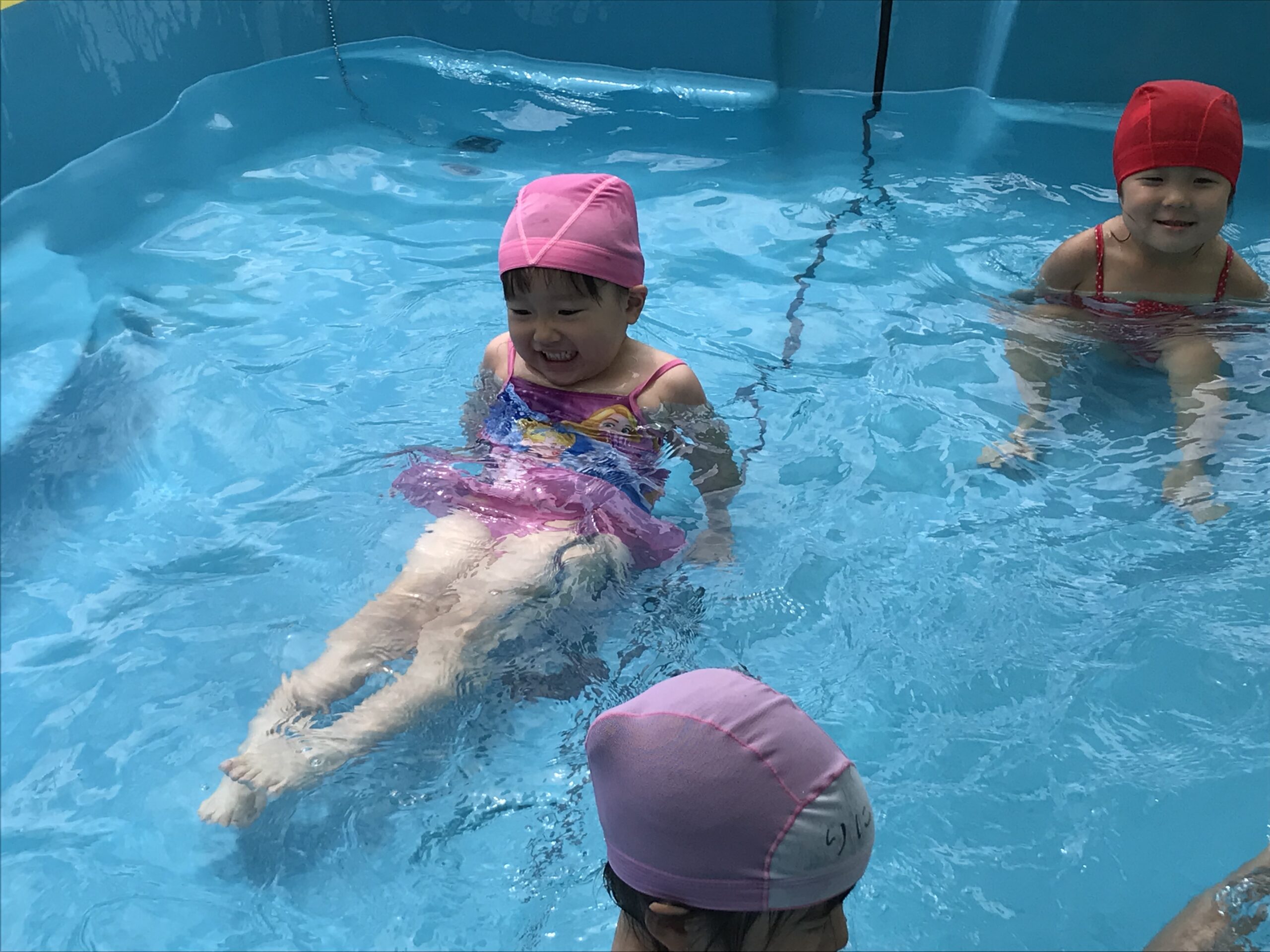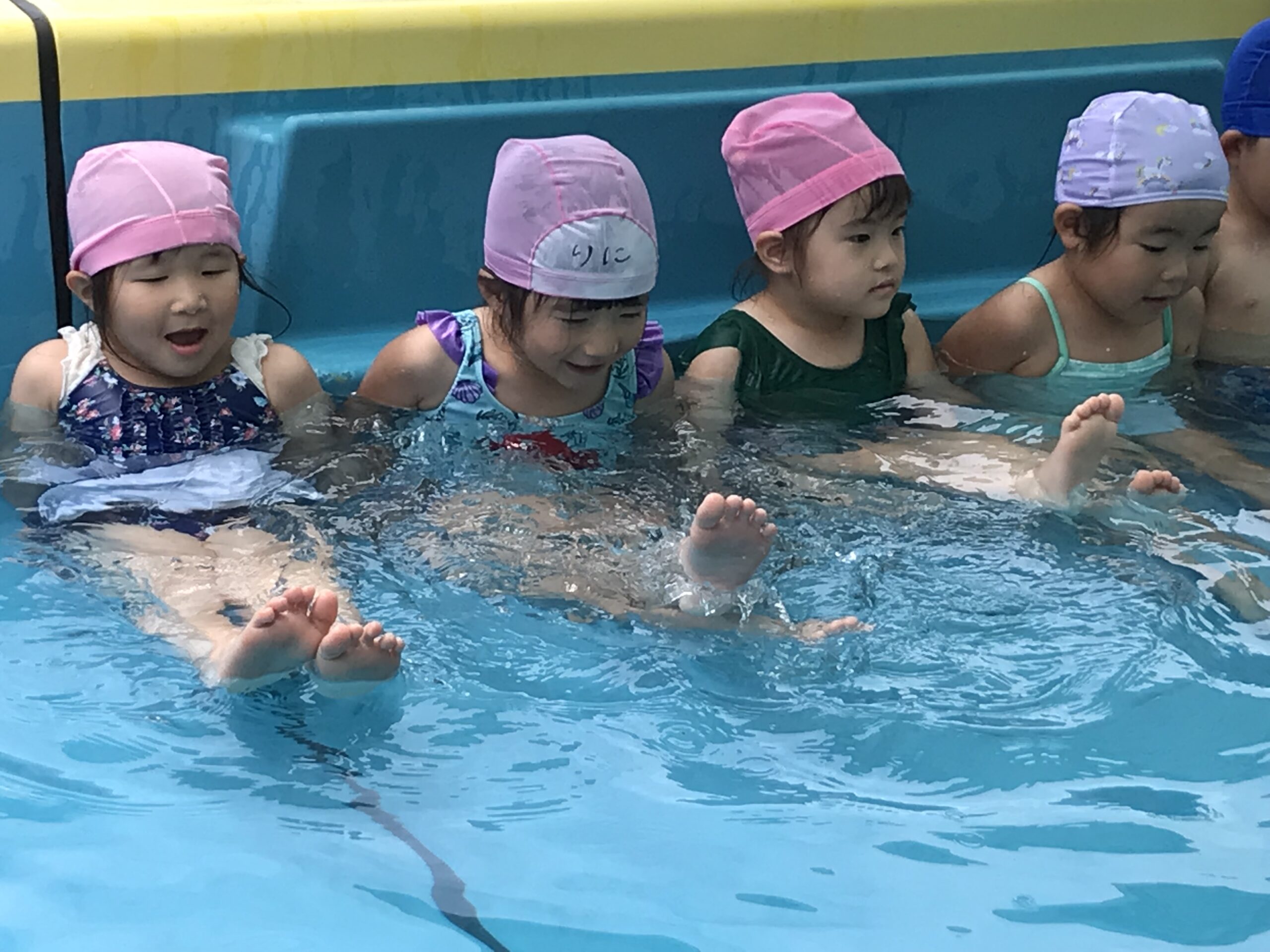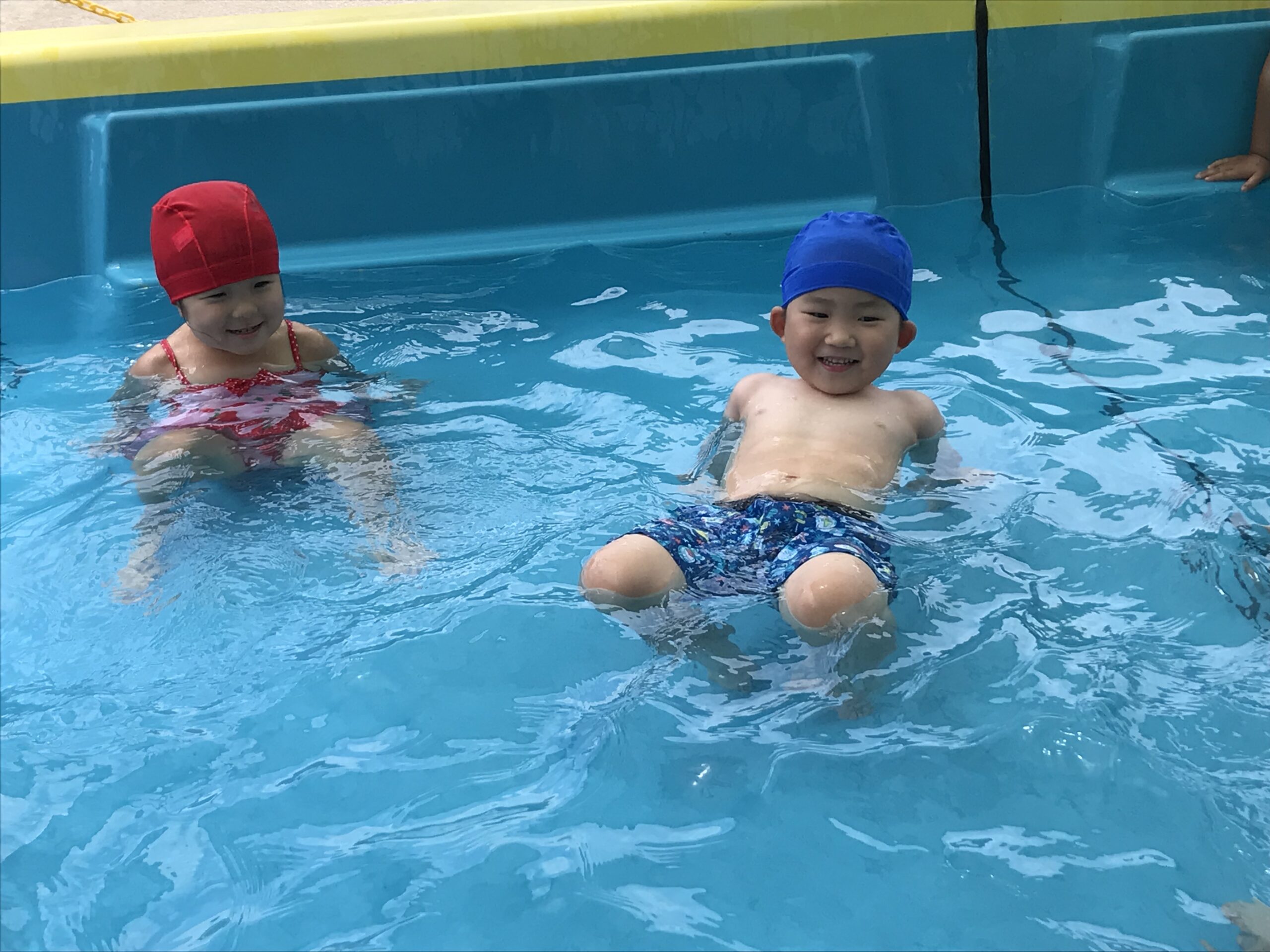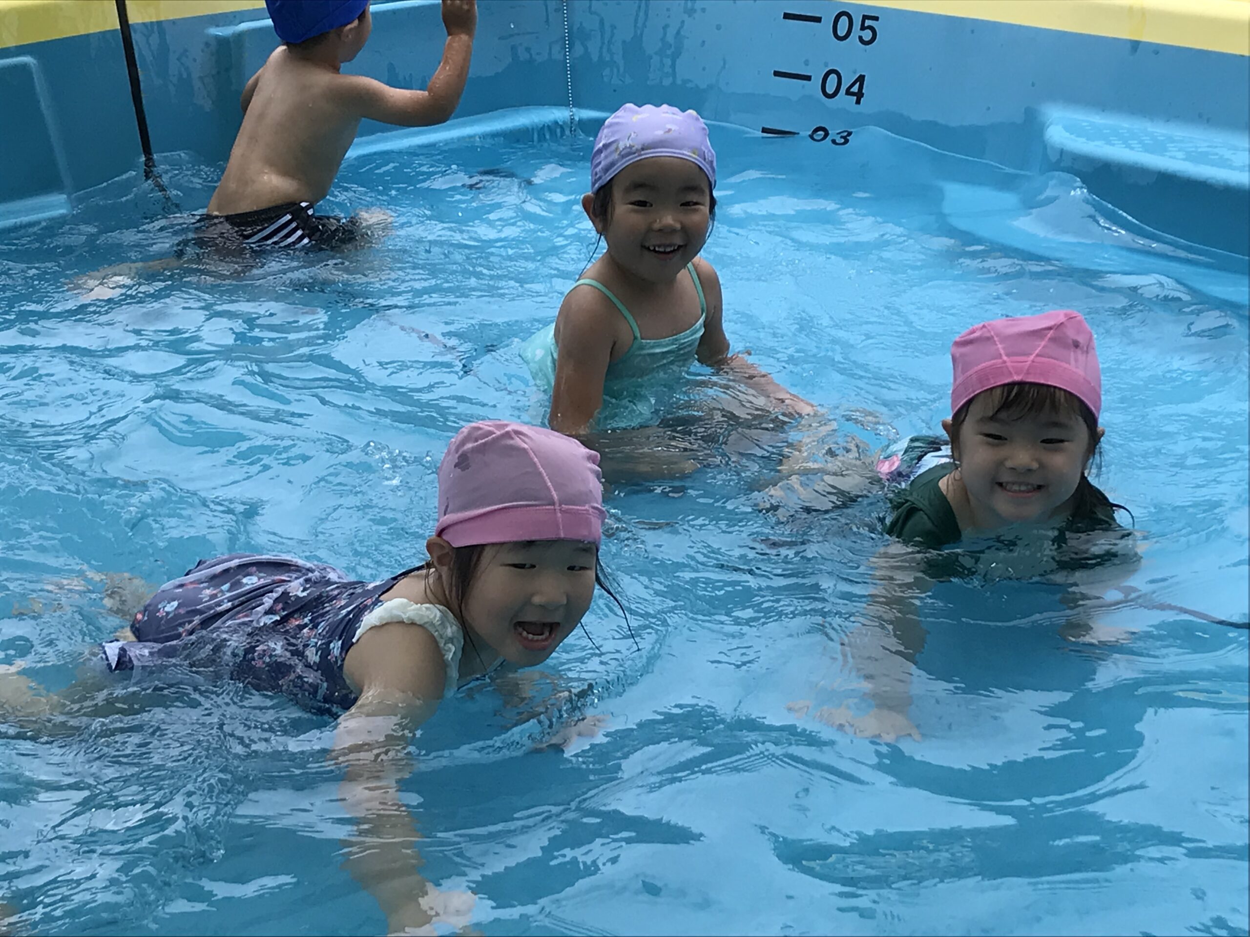 その後はプールに入って、大はしゃぎ!暑かったのでプールのお水が気持ちよかったようです。プールから上がるとみんなで作ったクリームシチューを食べました。「ニョッキが甘くておいし~い!」「これ、僕が切ったいちょう切りの野菜だ!」と喜んでシチューを食べていました。シチューに入っているニョッキのジャガイモとなすとピーマンは園でみんなで育てたお野菜です。自分達で育てて、調理したお野菜は特別美味しいよね♪モリモリ美味しく食べてくれました。