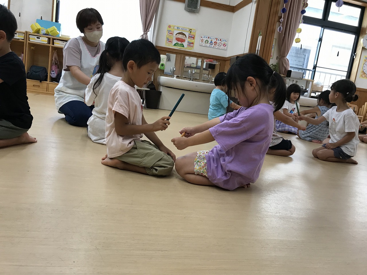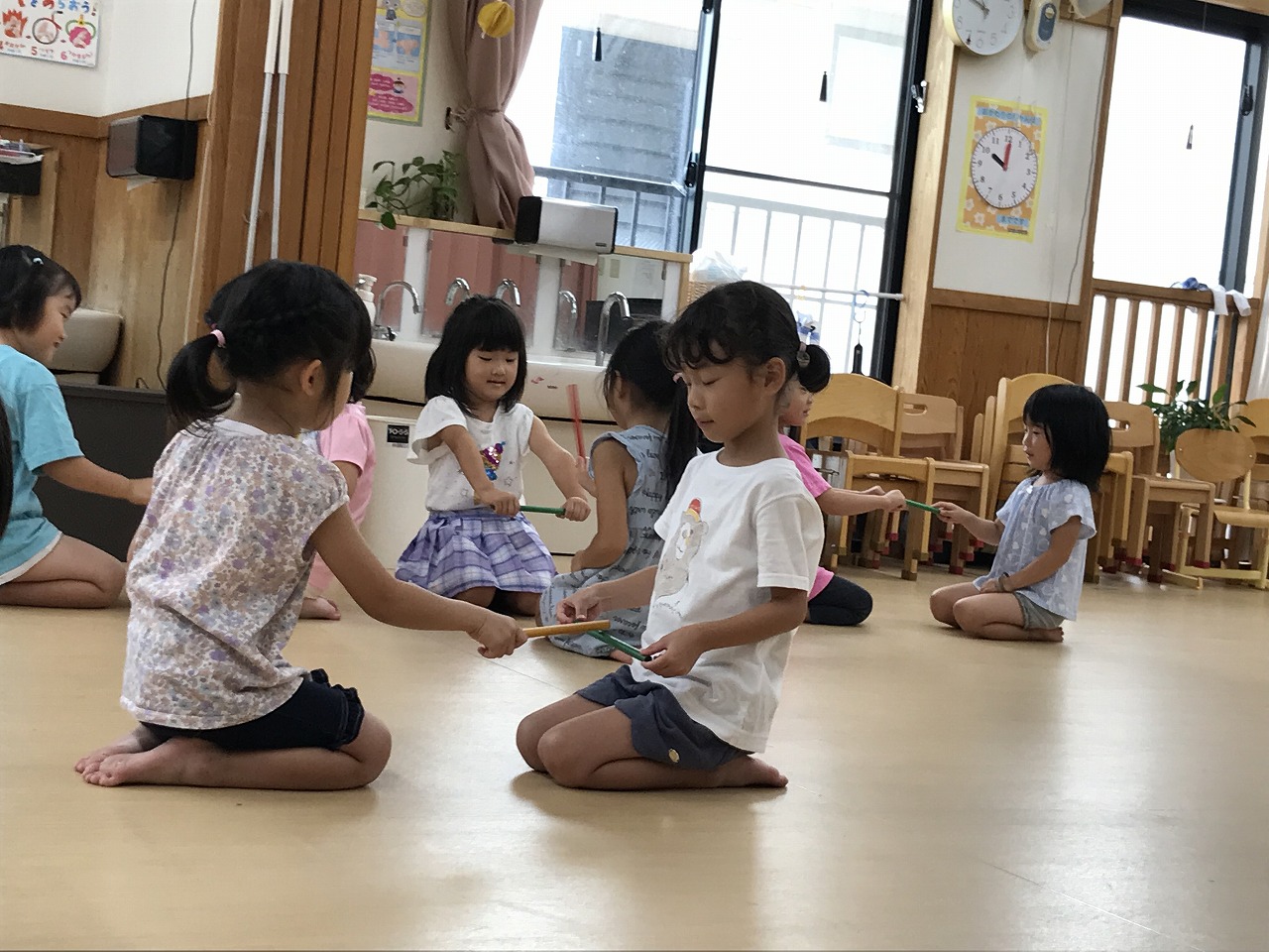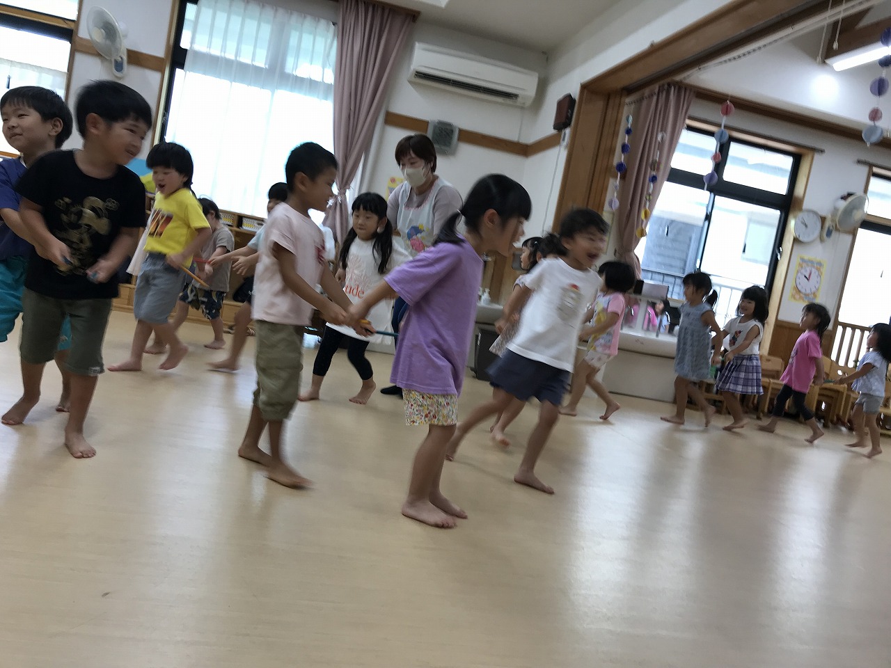 お友達と二人組になりスティックを使って電車ごっこを楽しんださくら組(4歳児)さんです。
