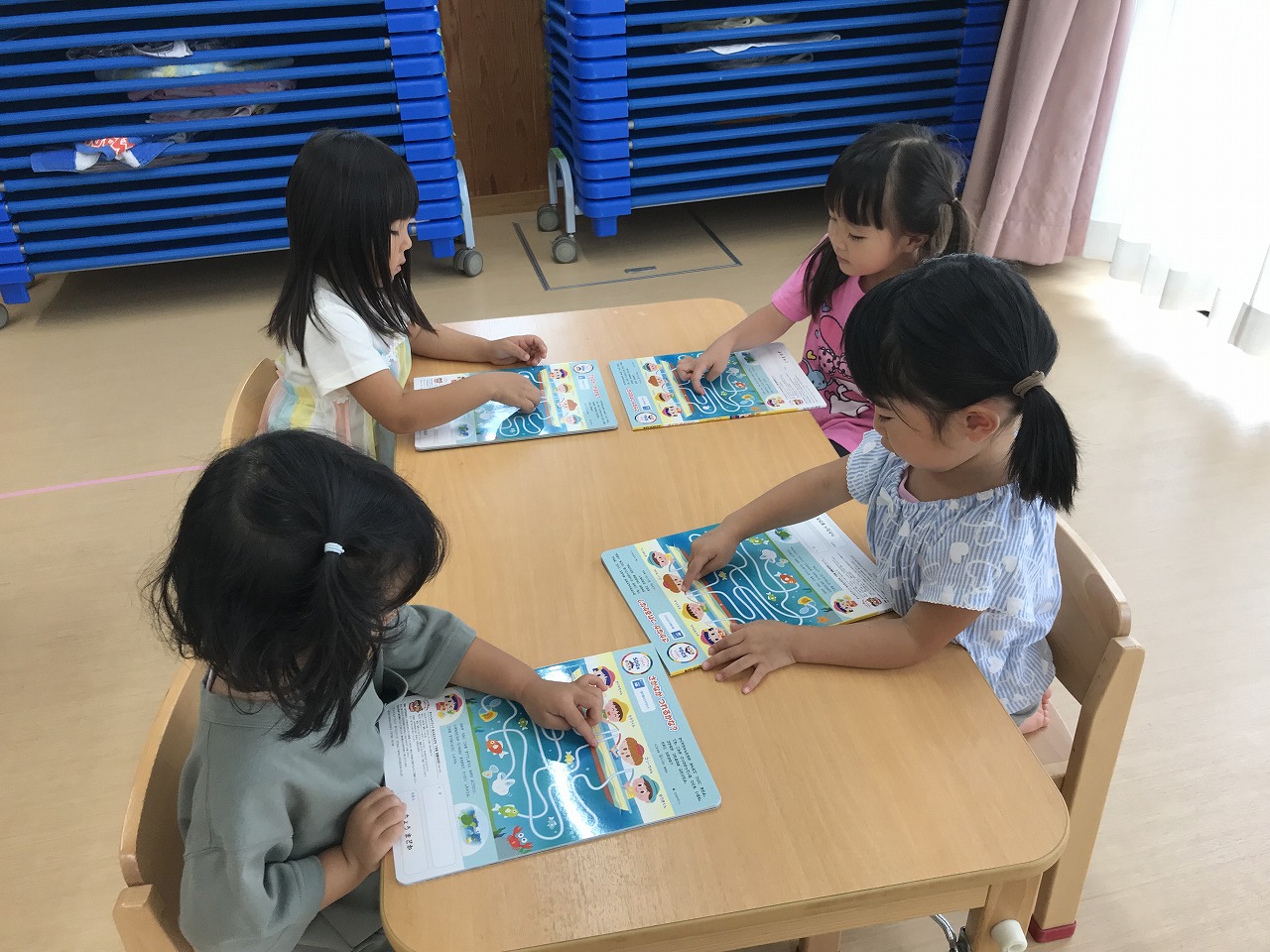 海の生き物クイズを一緒に解いたり、迷路をしたり、みんなが大好きなシール貼りを行いました。
