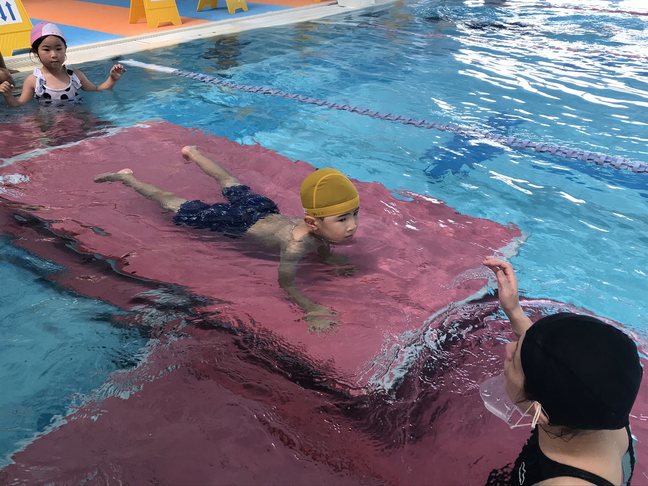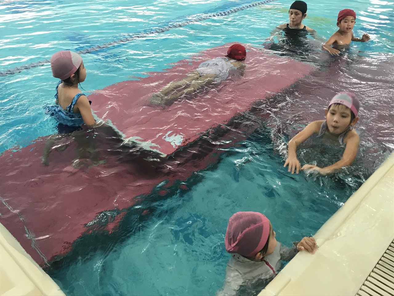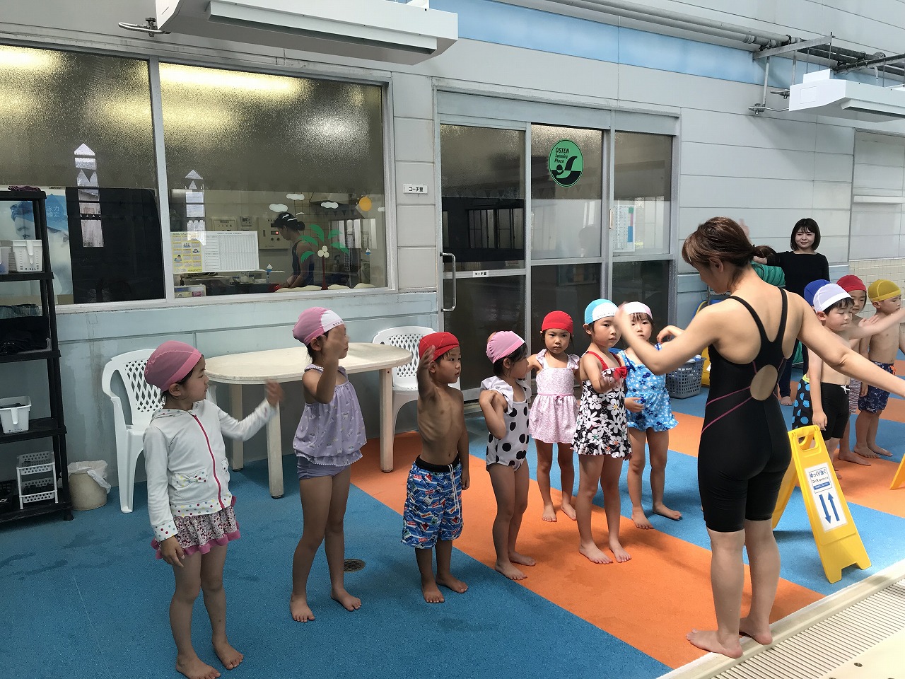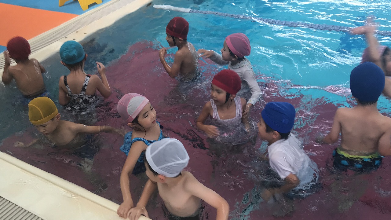 もも組(5歳児)さんはスイミングに行ってきました!月に一回のスイミングをとっても楽しみにしている子ども達です。コーチのお話を聞いて早速プールに入ります。こども園のプールよりも深いですが、へっちゃらで潜ったり、泳いだり、楽しみながら取り組むことができました。今日はワニさん歩きをしてみました。その中で顔をつけてワニさん歩きをすることにも挑戦したり、コーチに手を持ってもらって、スイ~っと足を伸ばして泳いだりしました。日頃のプールで元気いっぱい泳いでるおかげか、顔をつけれるようになった子も増えてきました☆