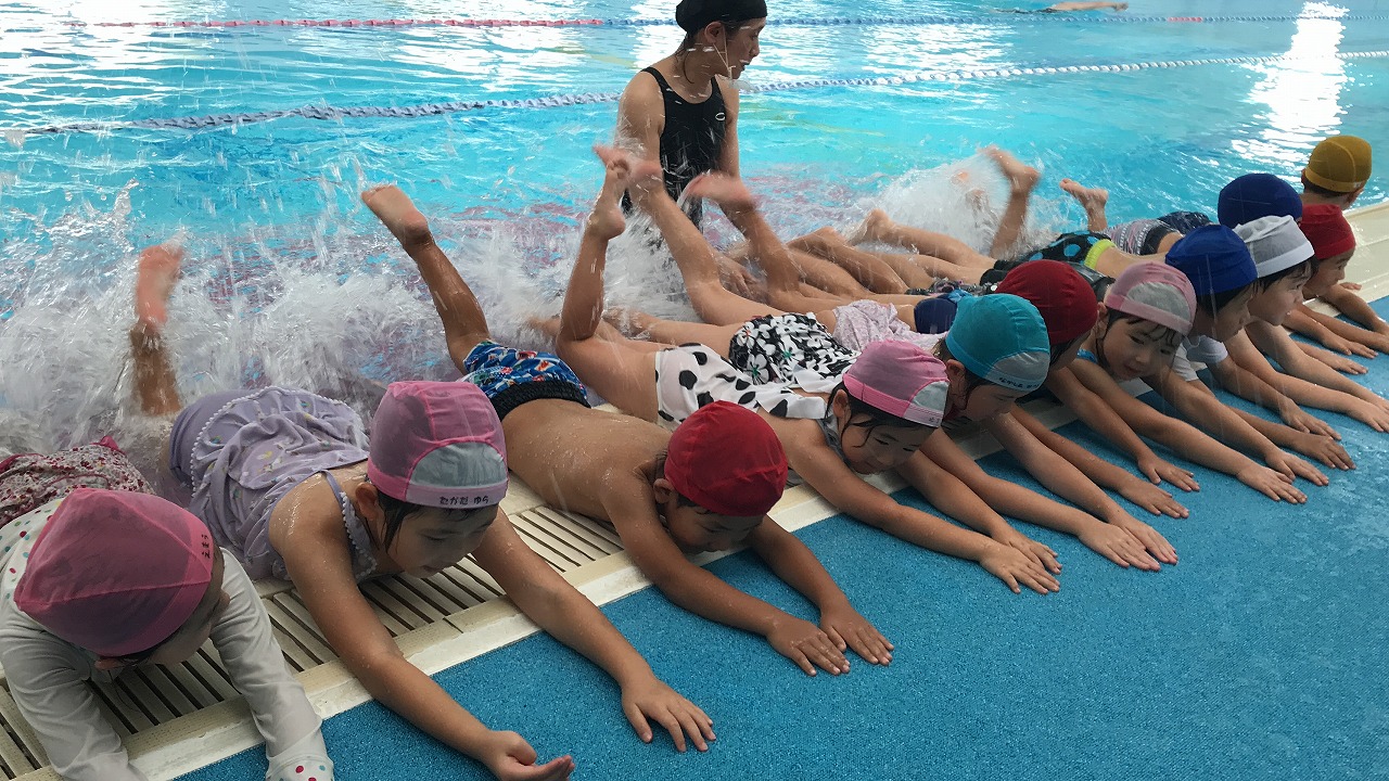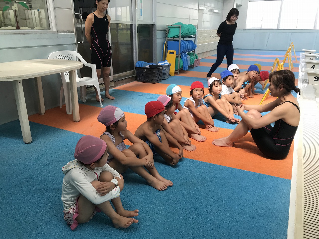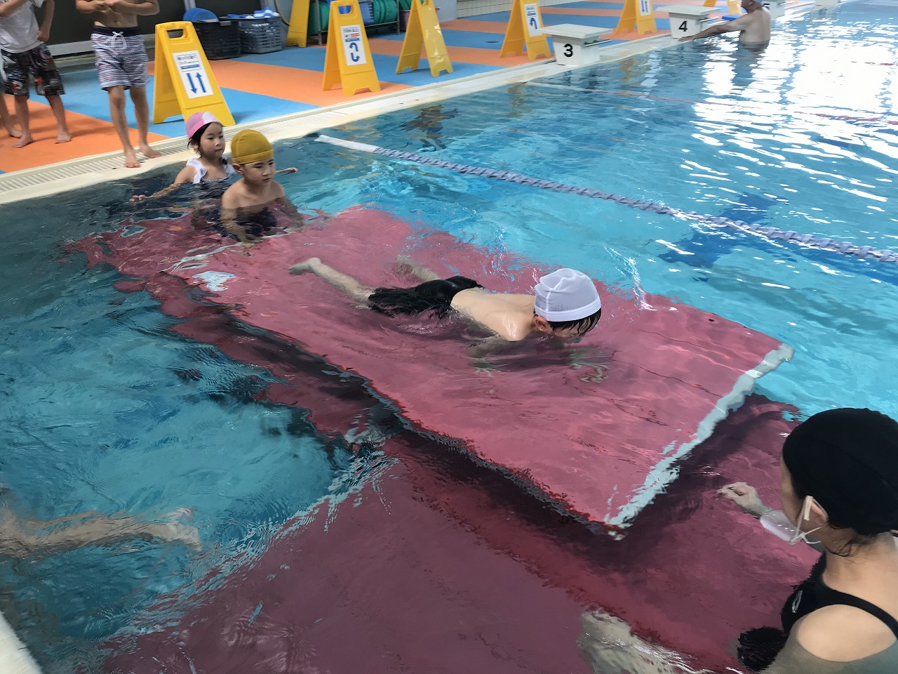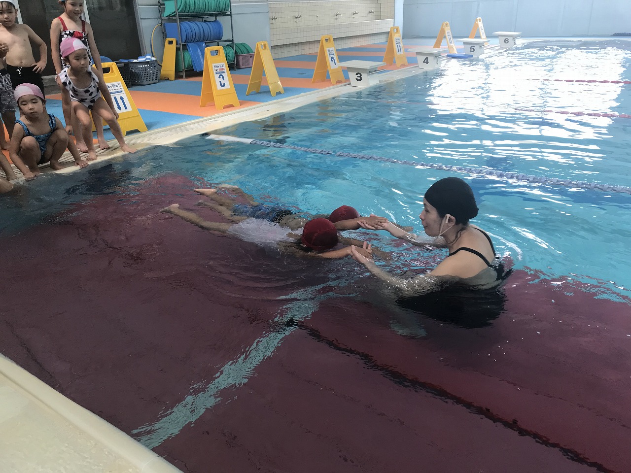 もも組(5歳児)さんはスイミングに行ってきました!月に一回のスイミングをとっても楽しみにしている子ども達です。コーチのお話を聞いて早速プールに入ります。こども園のプールよりも深いですが、へっちゃらで潜ったり、泳いだり、楽しみながら取り組むことができました。今日はワニさん歩きをしてみました。その中で顔をつけてワニさん歩きをすることにも挑戦したり、コーチに手を持ってもらって、スイ~っと足を伸ばして泳いだりしました。日頃のプールで元気いっぱい泳いでるおかげか、顔をつけれるようになった子も増えてきました☆