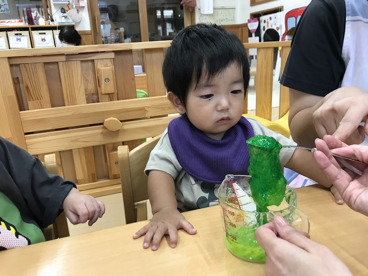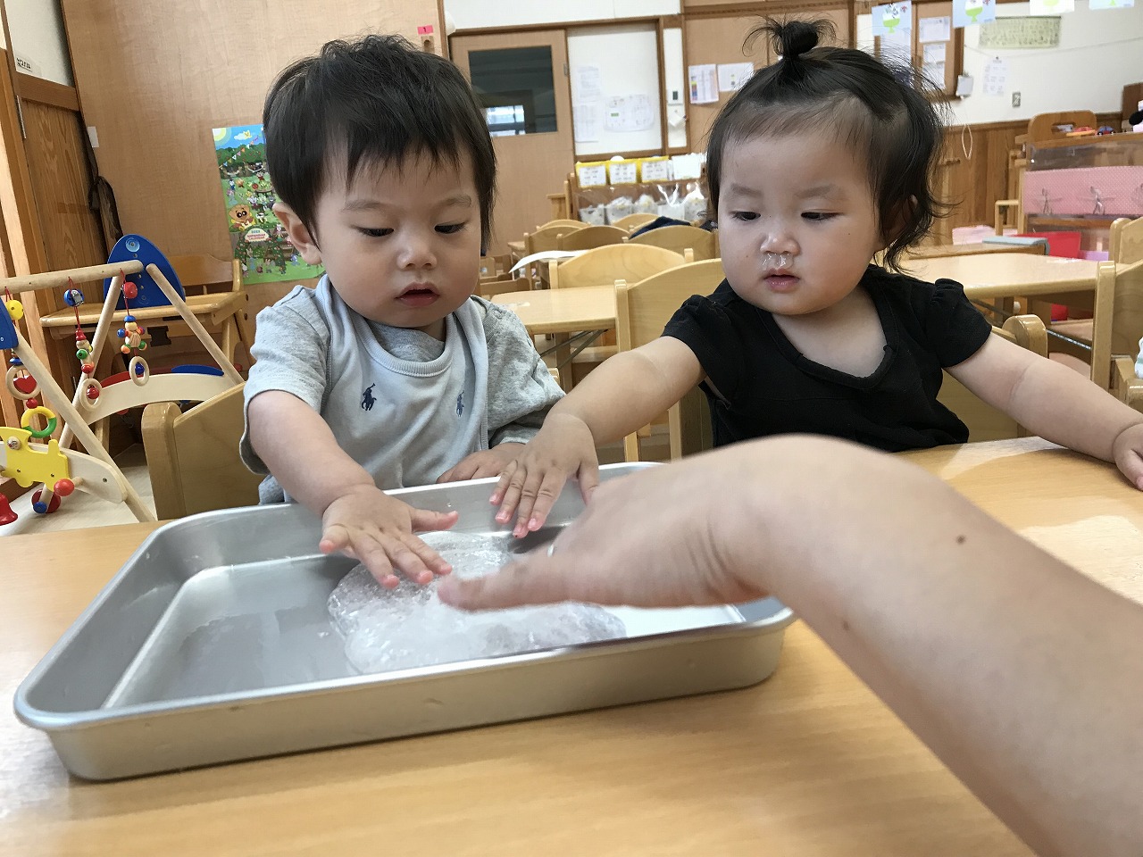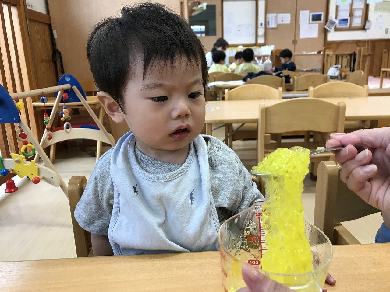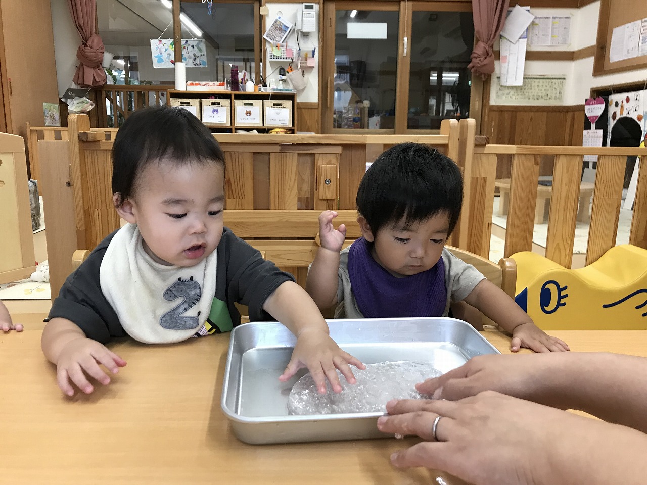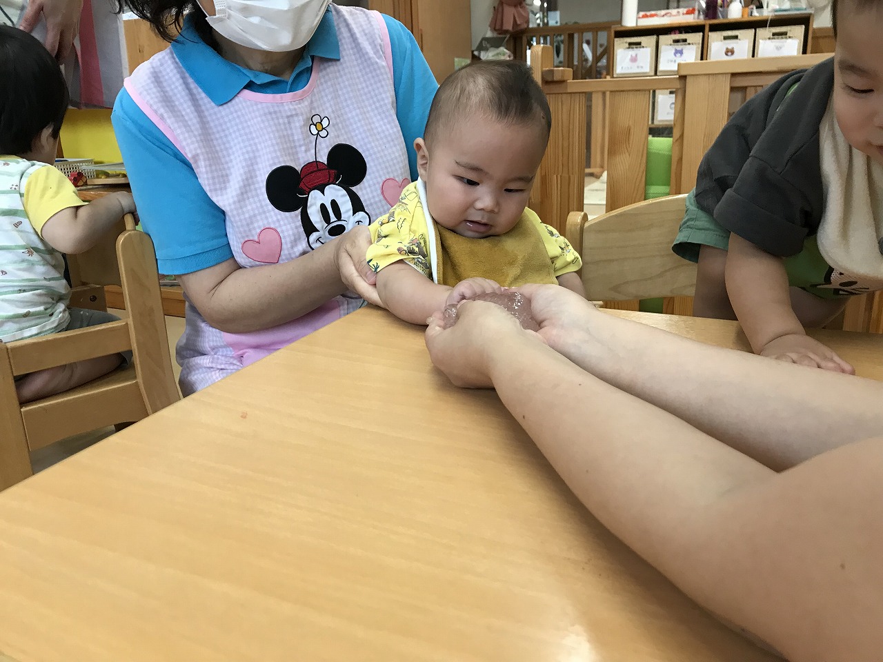 今日は感触遊びでスライムを作りました。作っているスライムの様子を見ていた子ども達とても真剣なまなざしでした。おいしそうに見えたのか、口を「もぐもぐ」としていてとっても可愛かったです。初めてのスライムで、不思議そうにしていましたが触ってみると興味津々で前のめりのひよこ組でした。食べないように注意しながら一緒に感触遊びを楽しみました。最近プールに入れていないので、水の見立て遊びもしました。カニさんプールに大きなビニール袋をたくさん入れて、手でビニールをパチャパチャたたくと本当の水遊びみたいで、冷たくて気持ちよさそうでした。