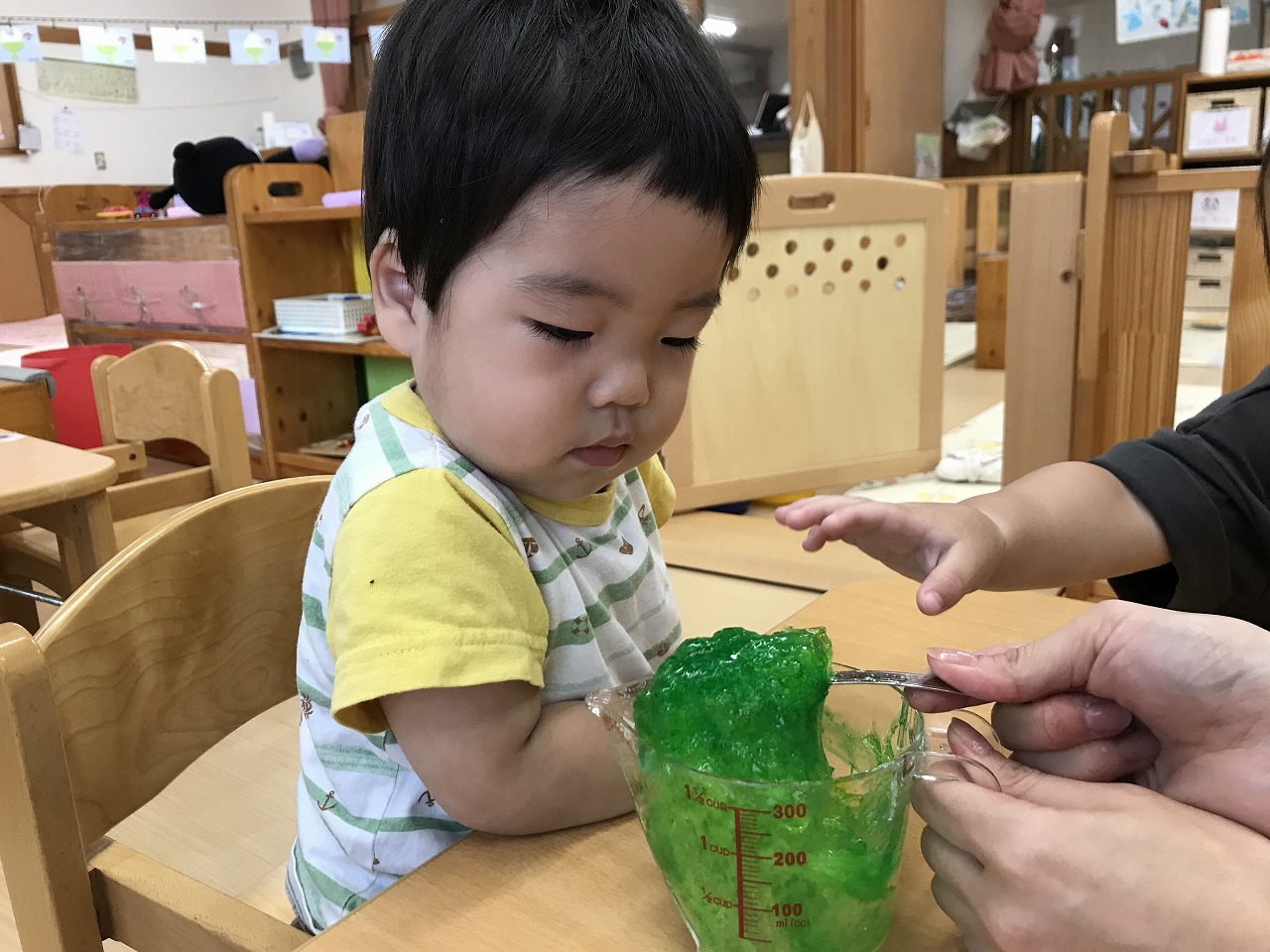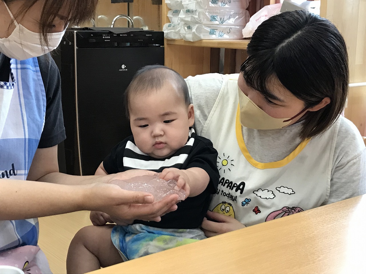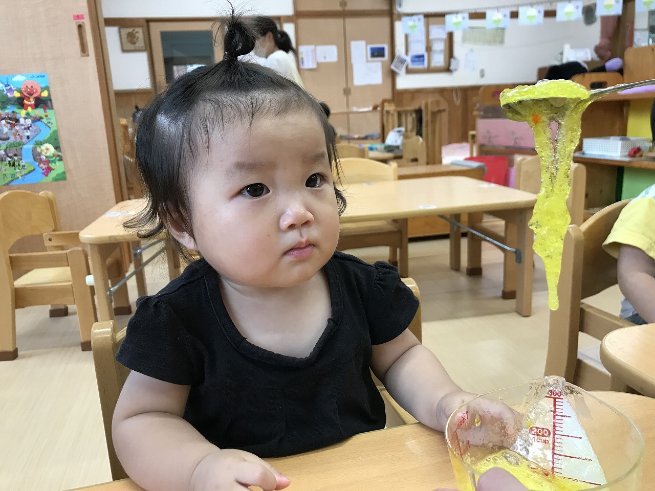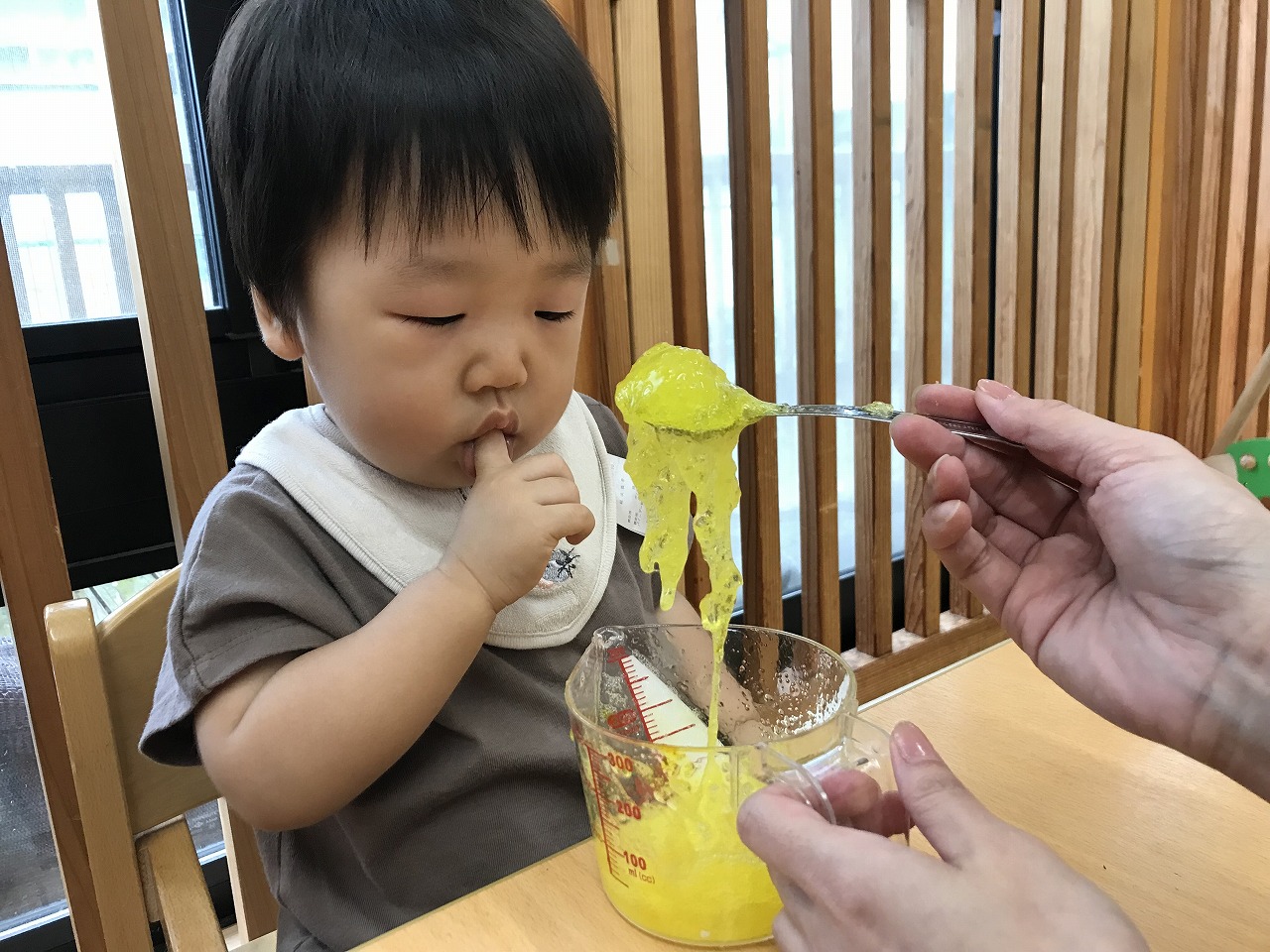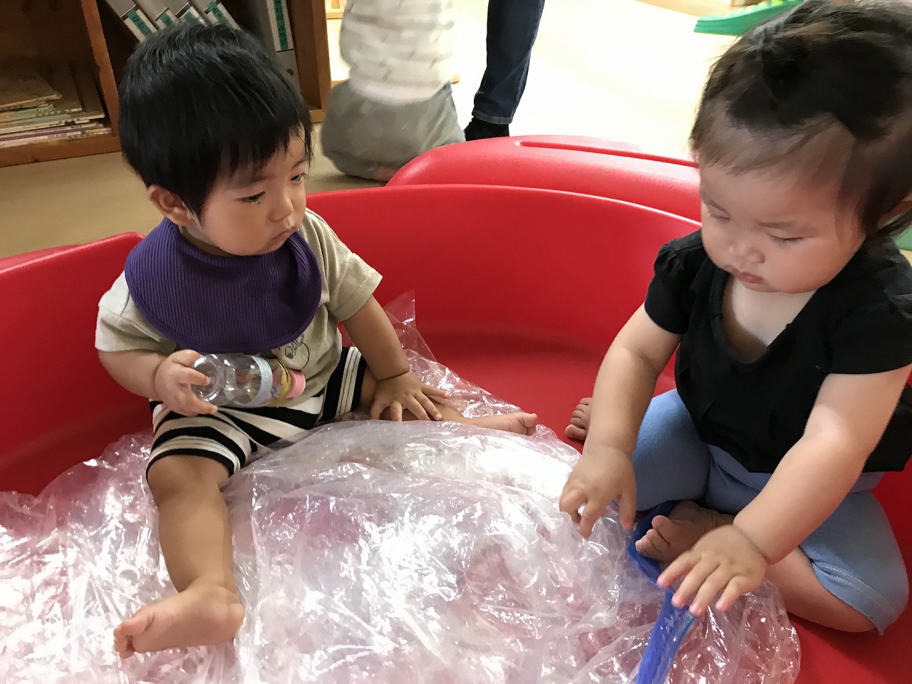 今日は感触遊びでスライムを作りました。作っているスライムの様子を見ていた子ども達とても真剣なまなざしでした。おいしそうに見えたのか、口を「もぐもぐ」としていてとっても可愛かったです。初めてのスライムで、不思議そうにしていましたが触ってみると興味津々で前のめりのひよこ組でした。食べないように注意しながら一緒に感触遊びを楽しみました。最近プールに入れていないので、水の見立て遊びもしました。カニさんプールに大きなビニール袋をたくさん入れて、手でビニールをパチャパチャたたくと本当の水遊びみたいで、冷たくて気持ちよさそうでした。