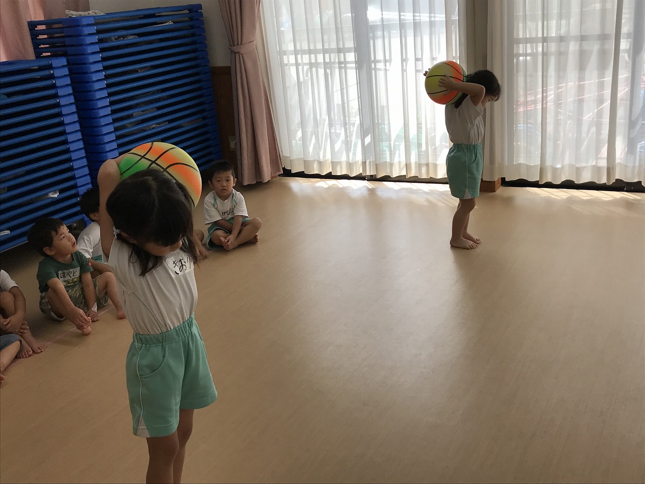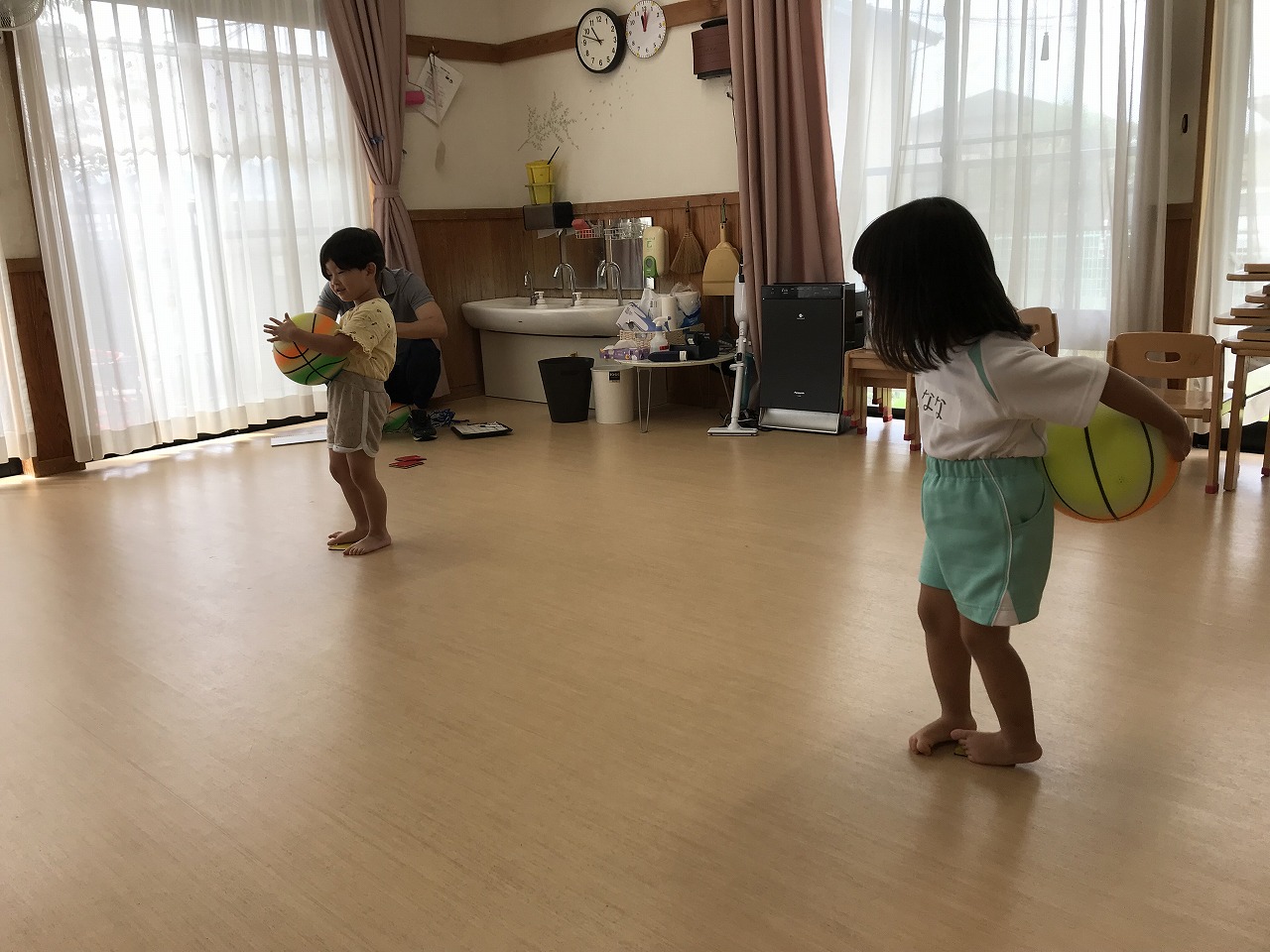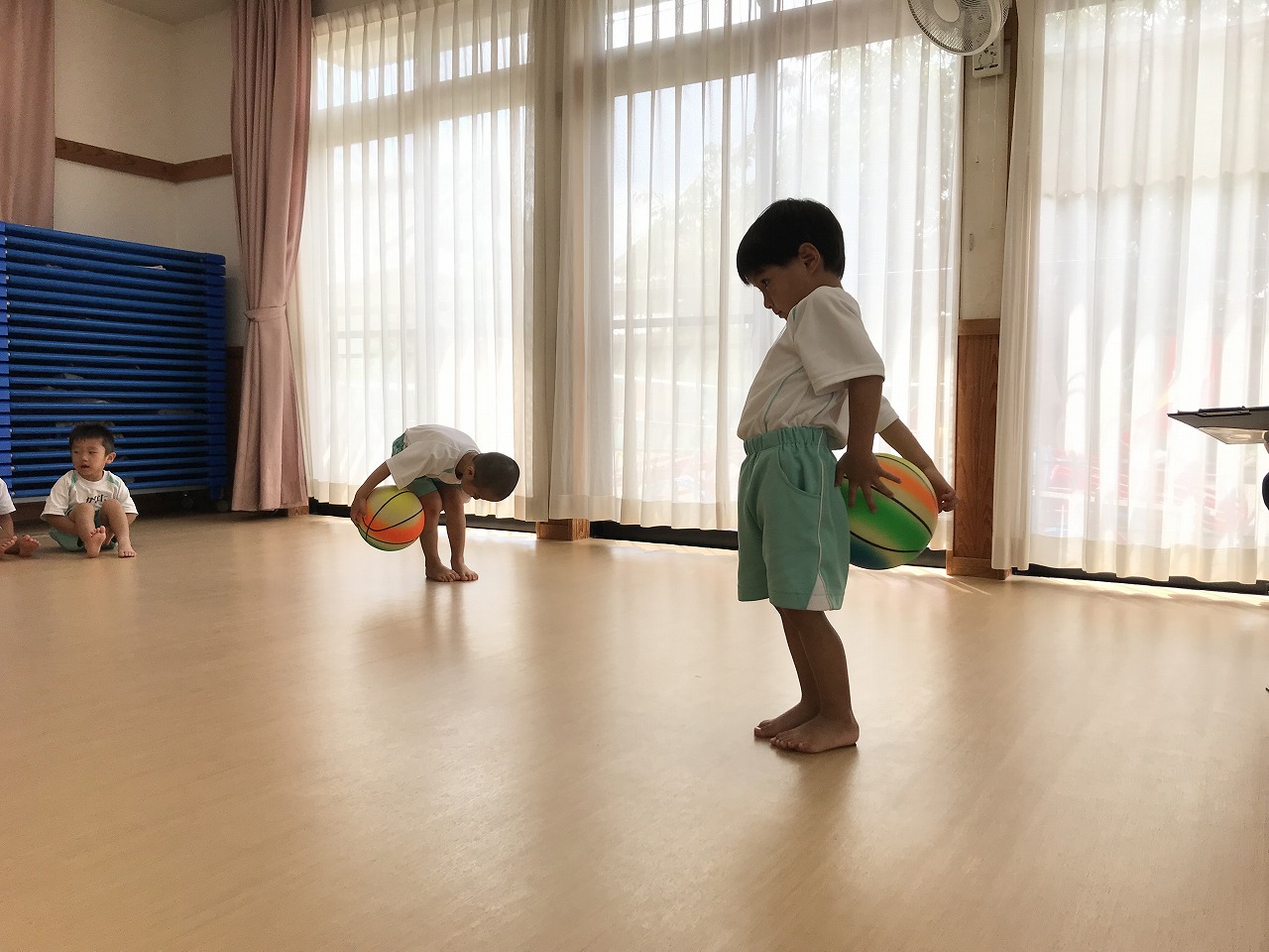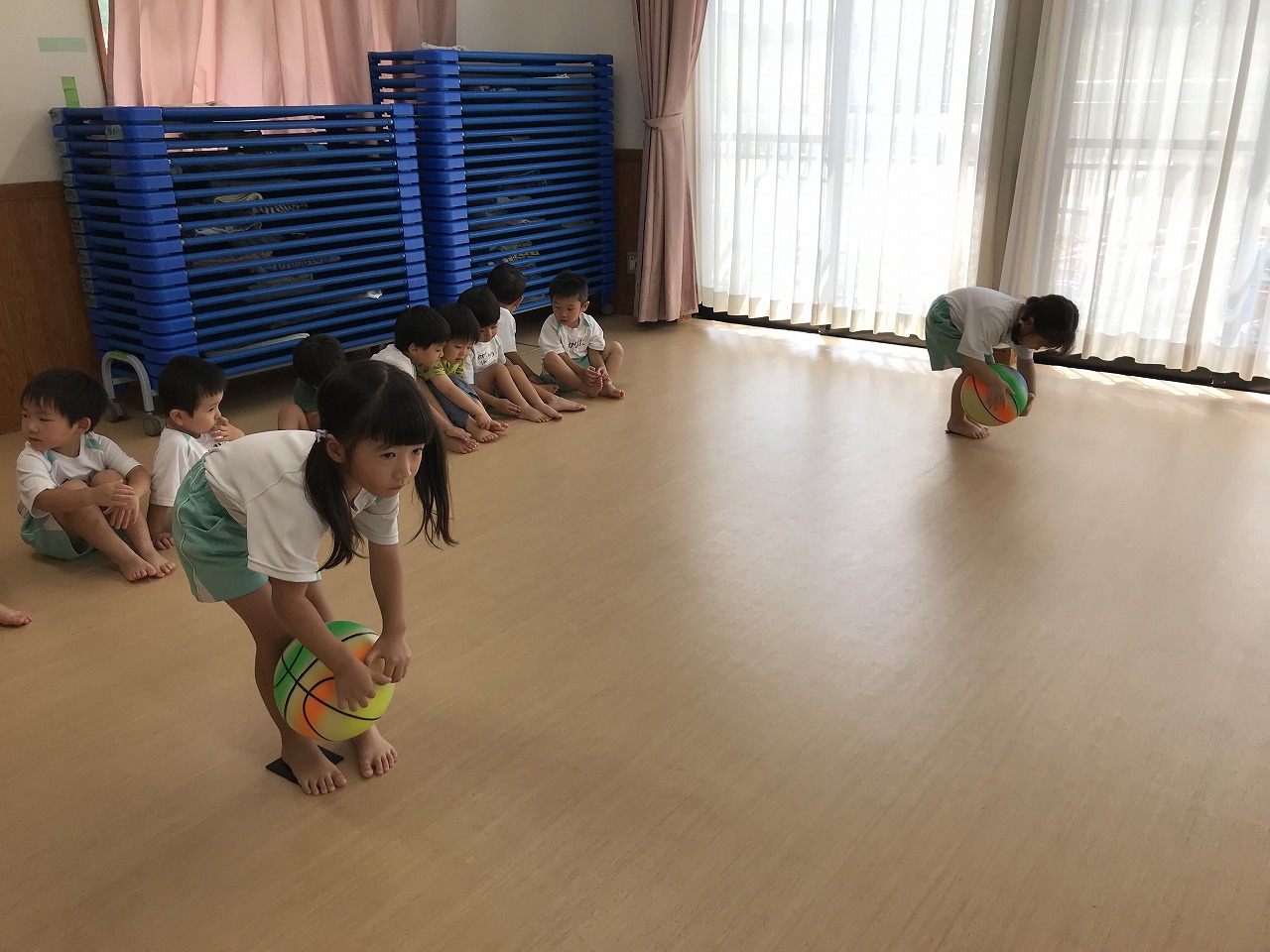 うめ組(3歳児)は、体操教室に参加しました。ボールを使った運動遊びをしました。首・おなか・膝の周りを順番にボールを回していきました。以前もしたことのある遊びだったので、やり方のコツを覚えていたのか、ゆっくりと落とさないようにボールを体に沿わせていきながら、とっても上手に回すことができていました。ボールを落としてしまった時は「あっ!おちた!」と言って慌てて拾い上げ、今度は、もっと慎重にチャレンジする姿がみられました。次は、手の平でボールを持ち、腕をまっすぐに伸ばして、その状態からボールを手から放してバウンドさせ、キャッチする遊びをしました。なかなかキャッチするのが難しく、何回も何回も諦めずにキャッチできるまで頑張っている様子がみられ、成功すると「やったー!」と喜んでいました。今日は、ボールを使って、体の色んな場所を動かしながら、楽しく運動遊びができました。子どもたちも「また、したーい!」と次の体操教室を楽しみにしているようです。