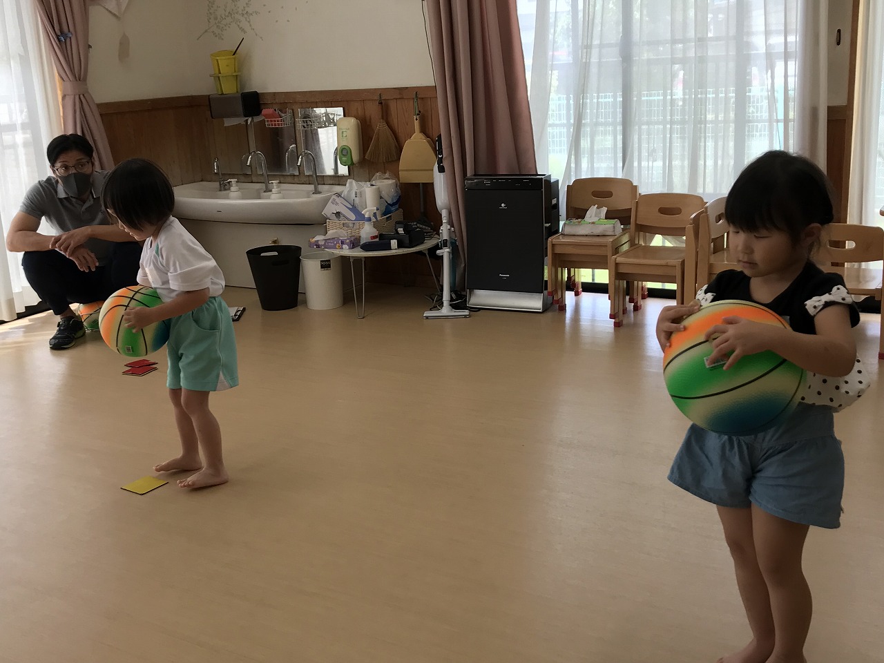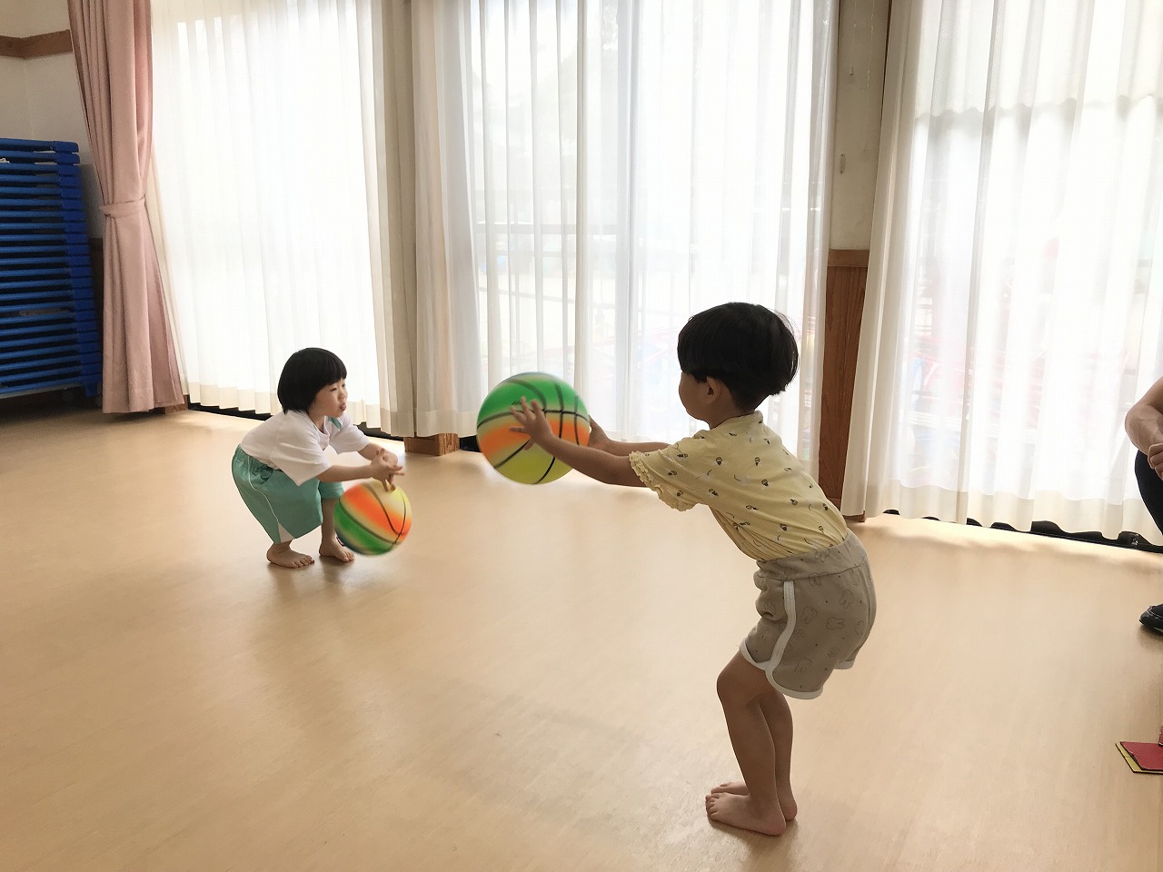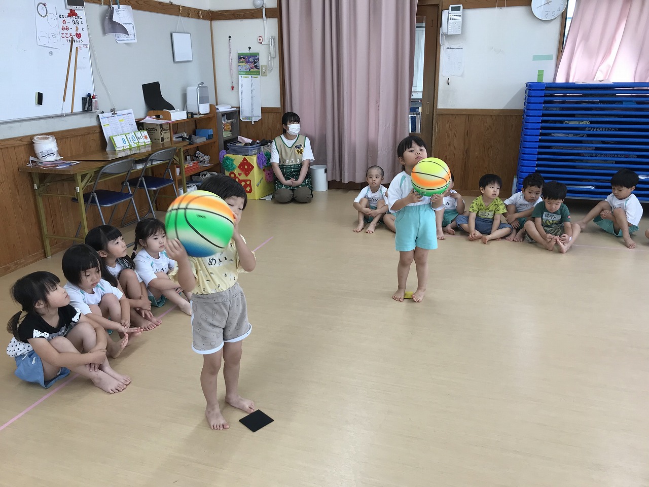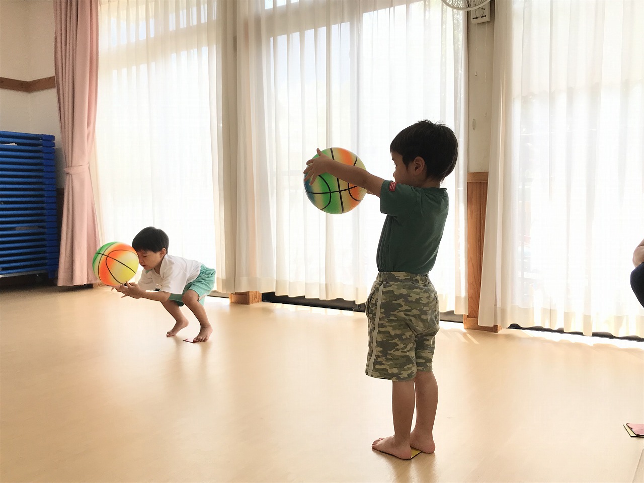 うめ組(3歳児)は、体操教室に参加しました。ボールを使った運動遊びをしました。首・おなか・膝の周りを順番にボールを回していきました。以前もしたことのある遊びだったので、やり方のコツを覚えていたのか、ゆっくりと落とさないようにボールを体に沿わせていきながら、とっても上手に回すことができていました。ボールを落としてしまった時は「あっ!おちた!」と言って慌てて拾い上げ、今度は、もっと慎重にチャレンジする姿がみられました。次は、手の平でボールを持ち、腕をまっすぐに伸ばして、その状態からボールを手から放してバウンドさせ、キャッチする遊びをしました。なかなかキャッチするのが難しく、何回も何回も諦めずにキャッチできるまで頑張っている様子がみられ、成功すると「やったー!」と喜んでいました。今日は、ボールを使って、体の色んな場所を動かしながら、楽しく運動遊びができました。子どもたちも「また、したーい!」と次の体操教室を楽しみにしているようです。