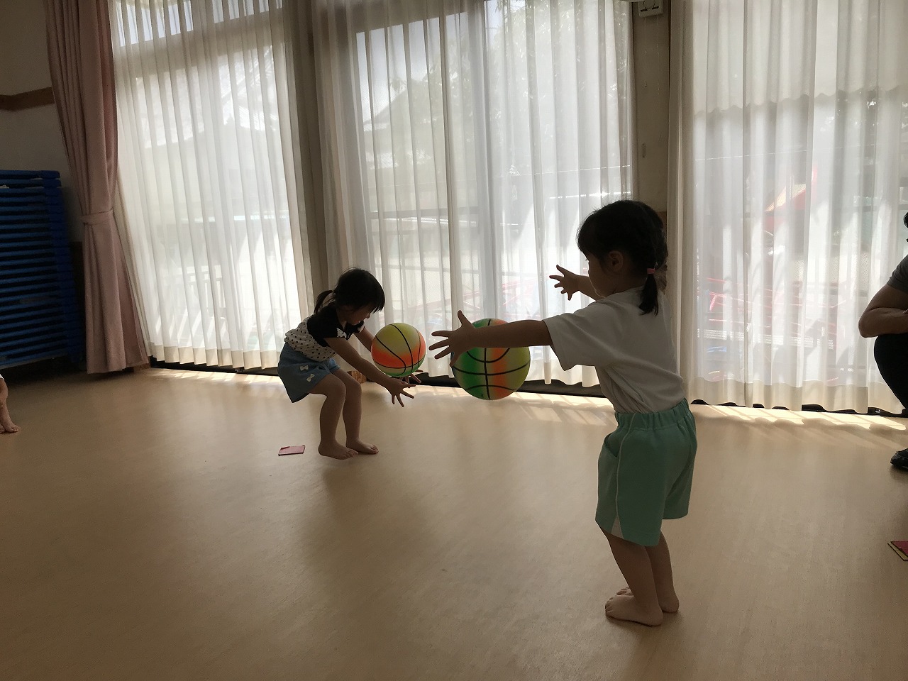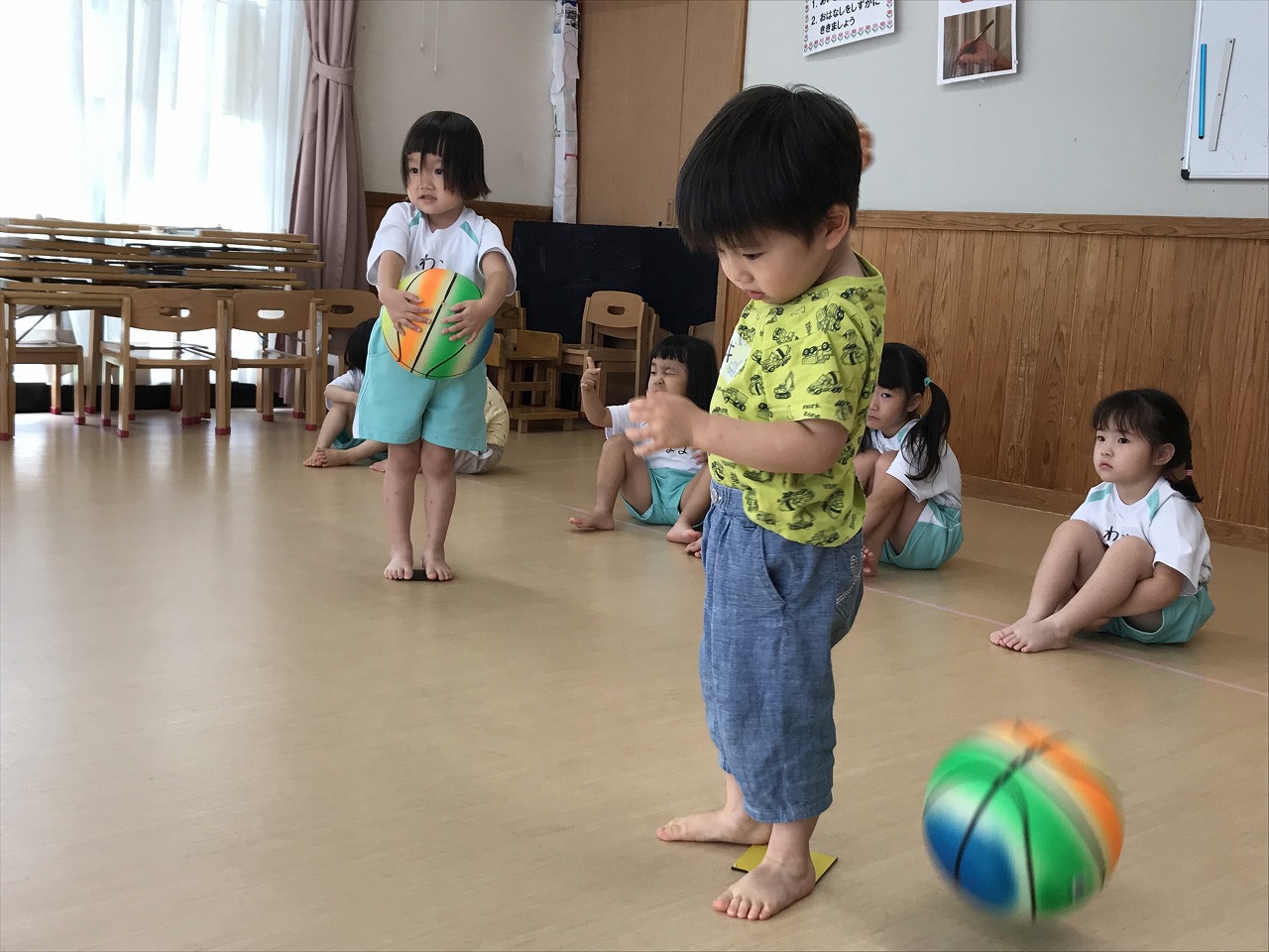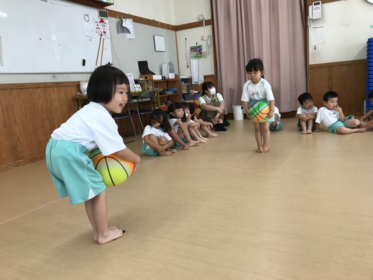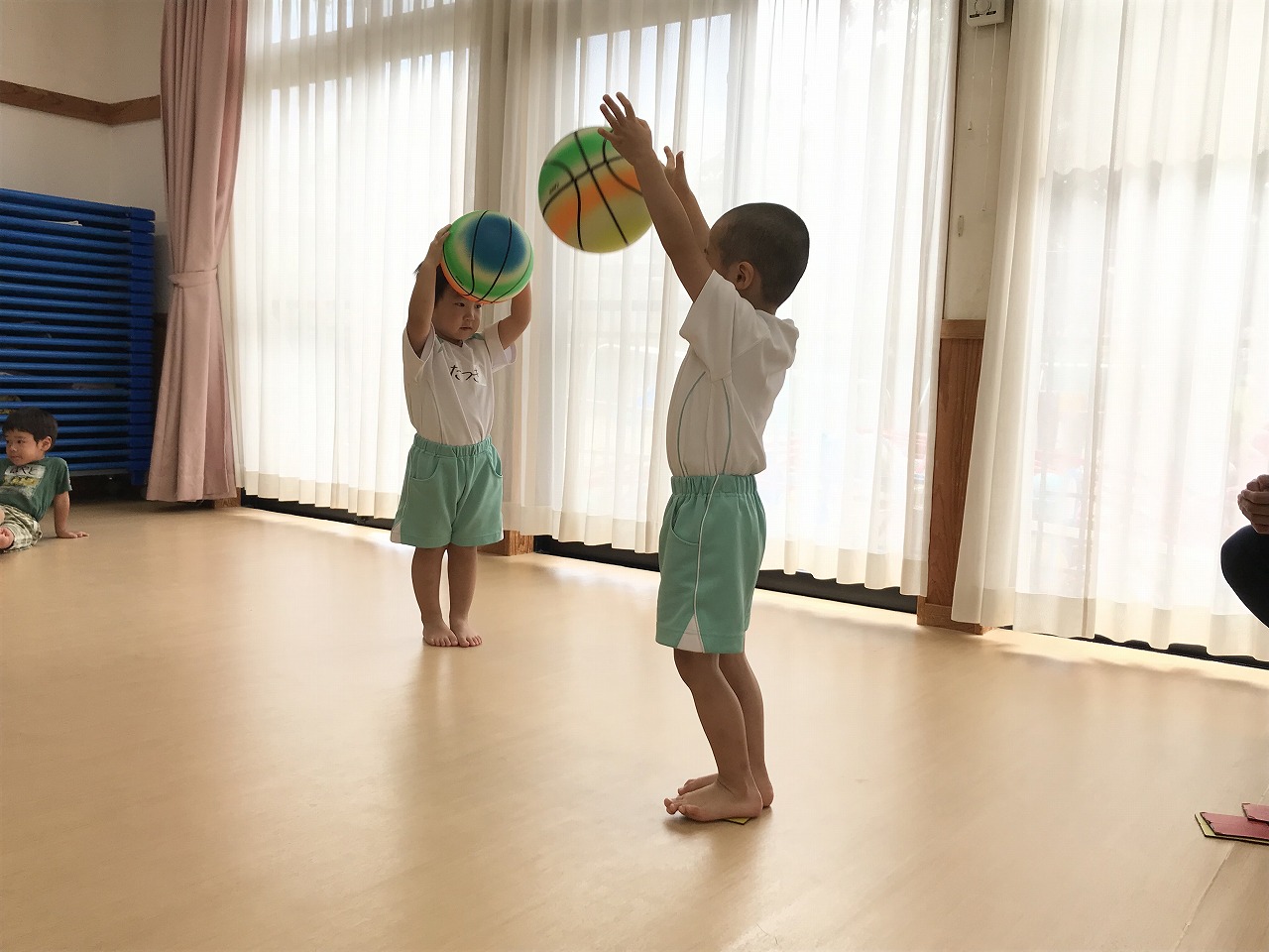 うめ組(3歳児)は、体操教室に参加しました。ボールを使った運動遊びをしました。首・おなか・膝の周りを順番にボールを回していきました。以前もしたことのある遊びだったので、やり方のコツを覚えていたのか、ゆっくりと落とさないようにボールを体に沿わせていきながら、とっても上手に回すことができていました。ボールを落としてしまった時は「あっ!おちた!」と言って慌てて拾い上げ、今度は、もっと慎重にチャレンジする姿がみられました。次は、手の平でボールを持ち、腕をまっすぐに伸ばして、その状態からボールを手から放してバウンドさせ、キャッチする遊びをしました。なかなかキャッチするのが難しく、何回も何回も諦めずにキャッチできるまで頑張っている様子がみられ、成功すると「やったー!」と喜んでいました。今日は、ボールを使って、体の色んな場所を動かしながら、楽しく運動遊びができました。子どもたちも「また、したーい!」と次の体操教室を楽しみにしているようです。